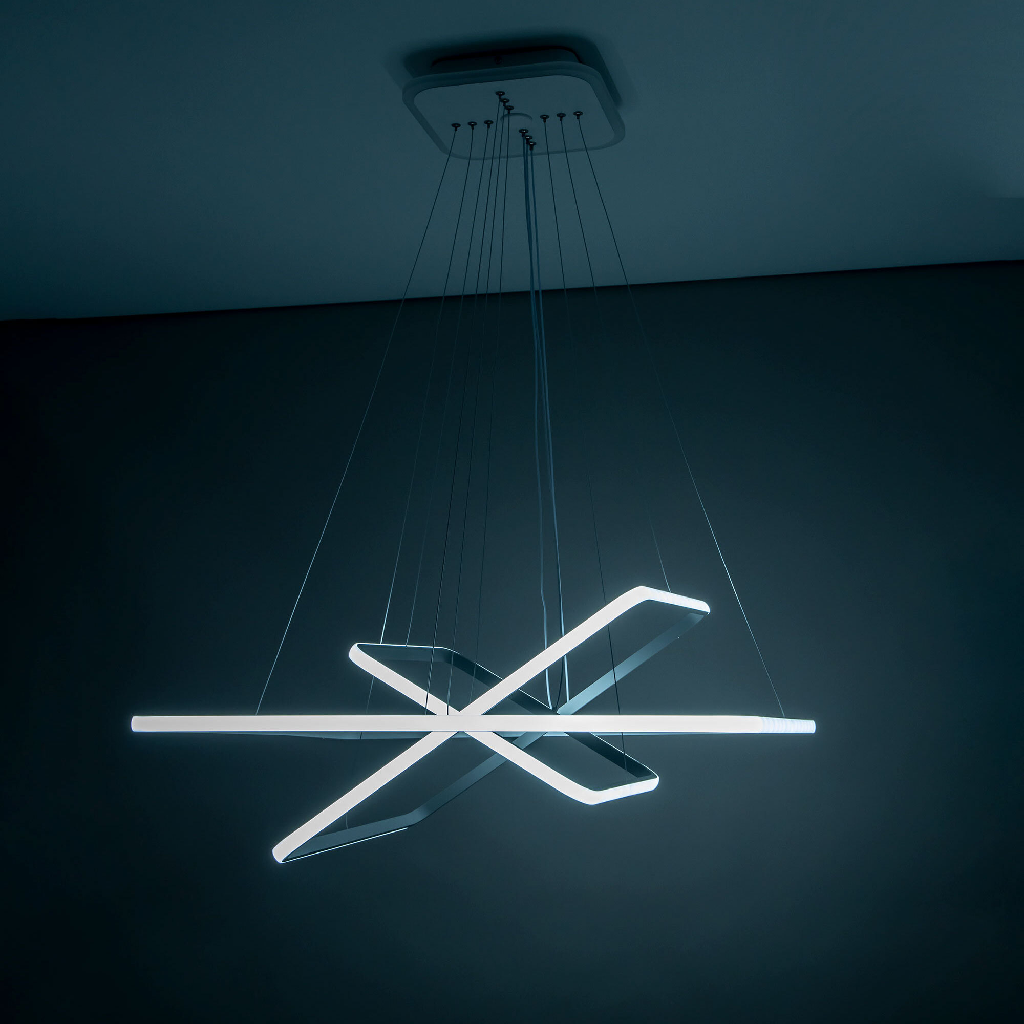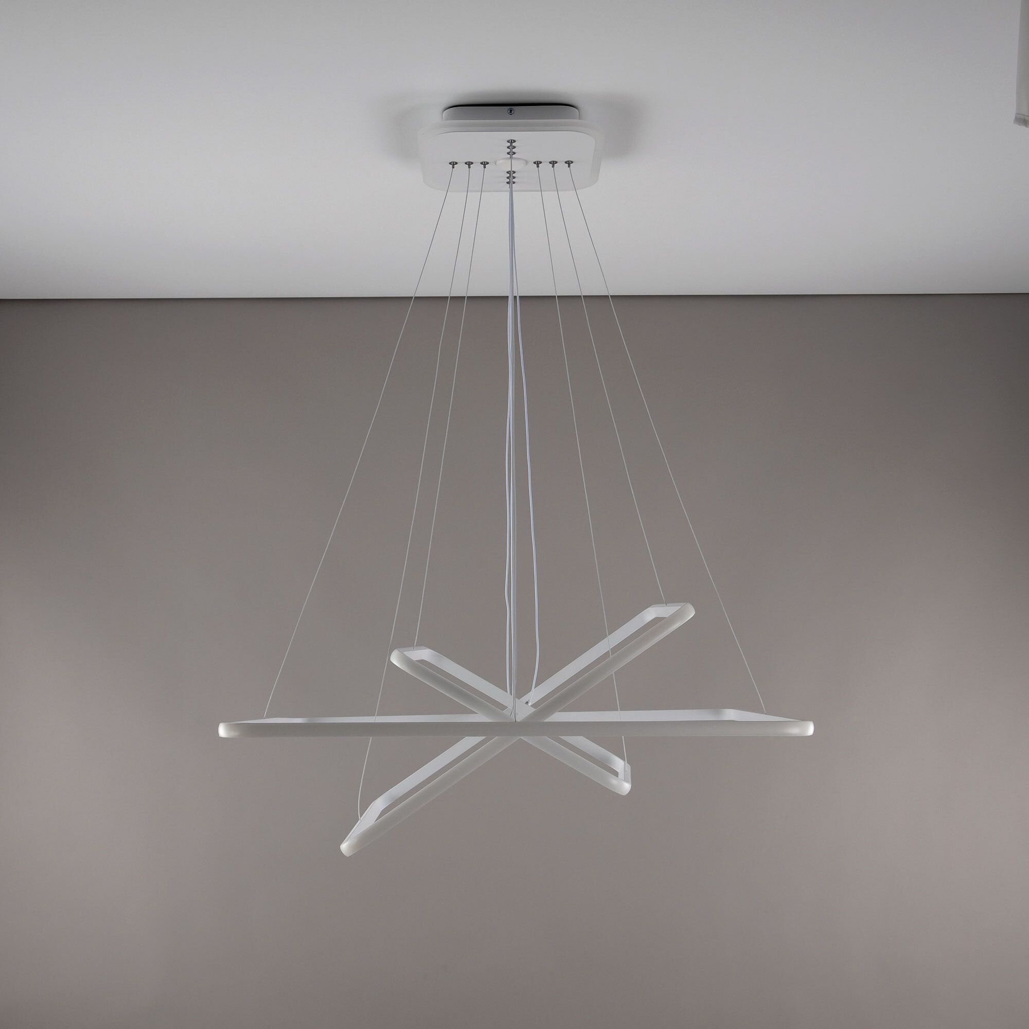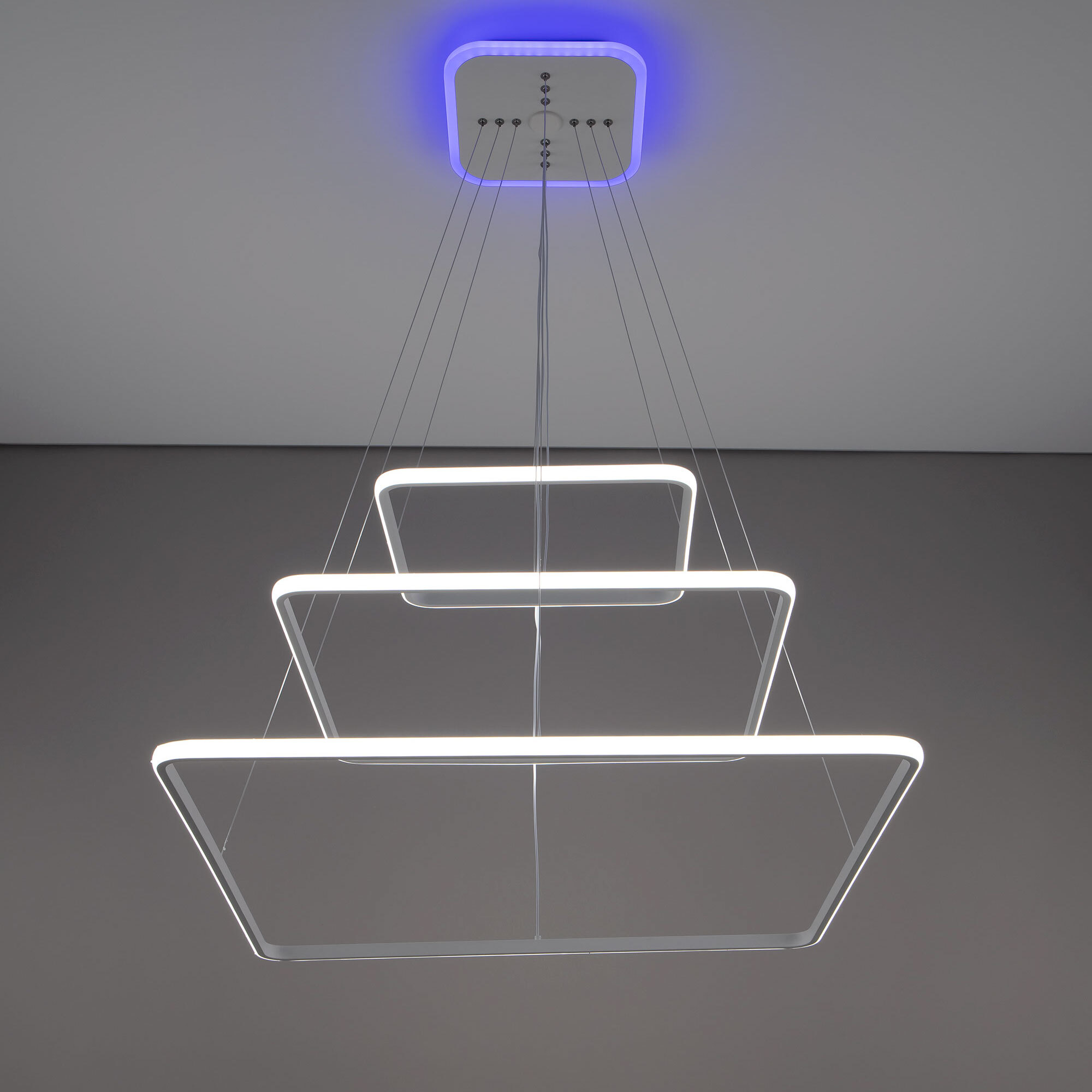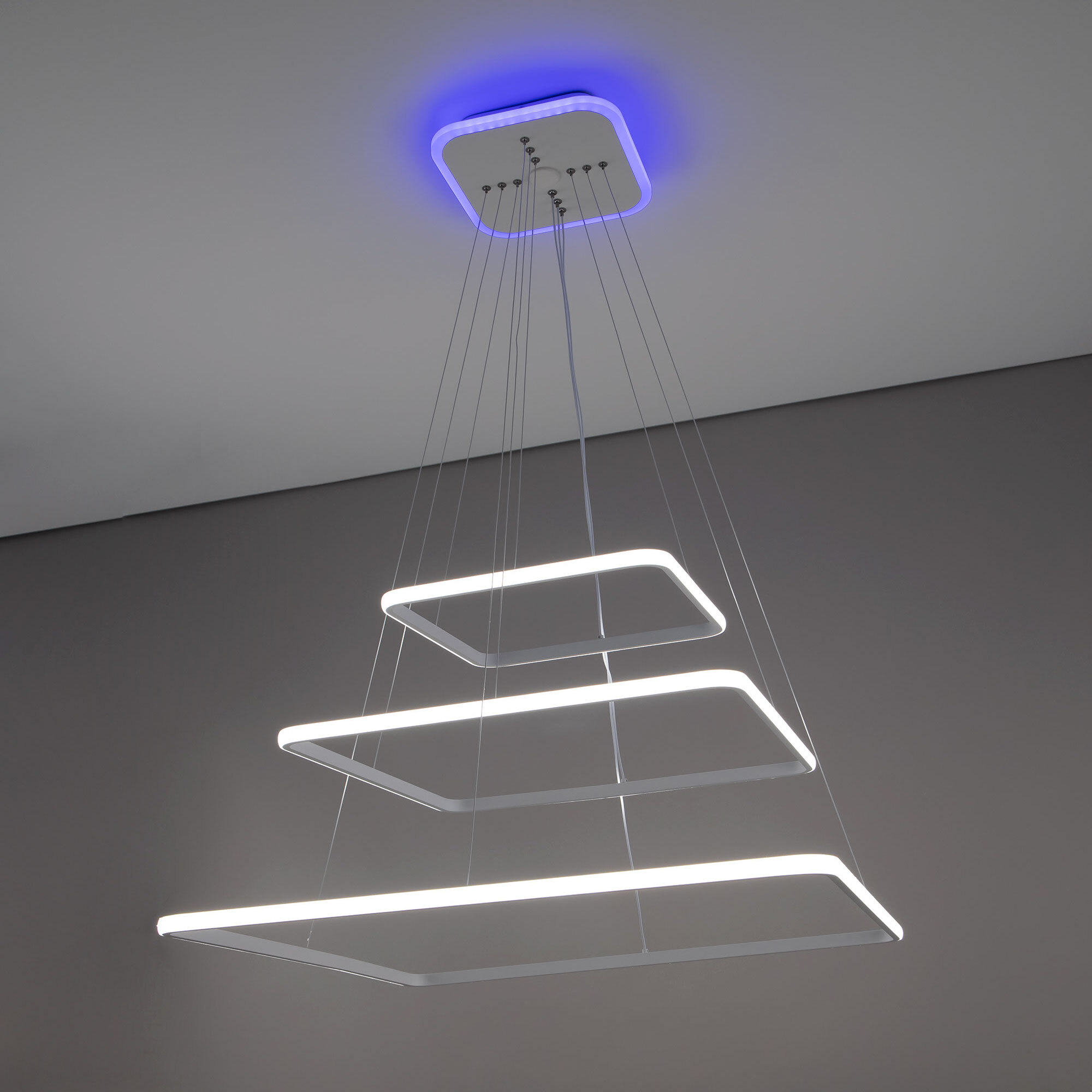Люстра на тросах, в форме каскада из трех подвесных квадратных колец, высоту и угол наклона каждого из которых можно изменить. Корпус изготовлен из алюминиевого сплава, рассеиватель оптический полимер, цвет белый матовый. Крепление люстры подходит для всех типов потолков, в том числе натяжных. Тип крепления – планка.