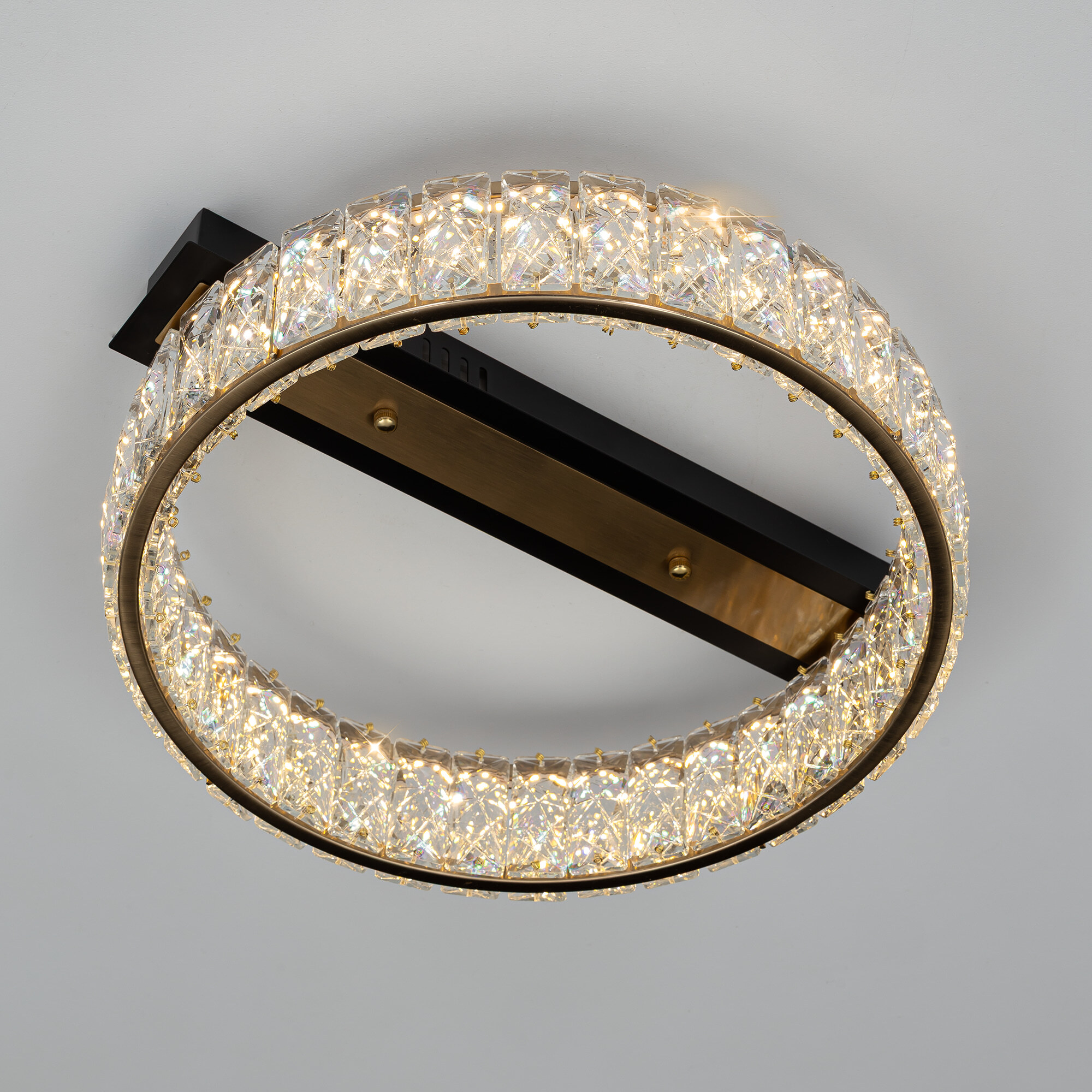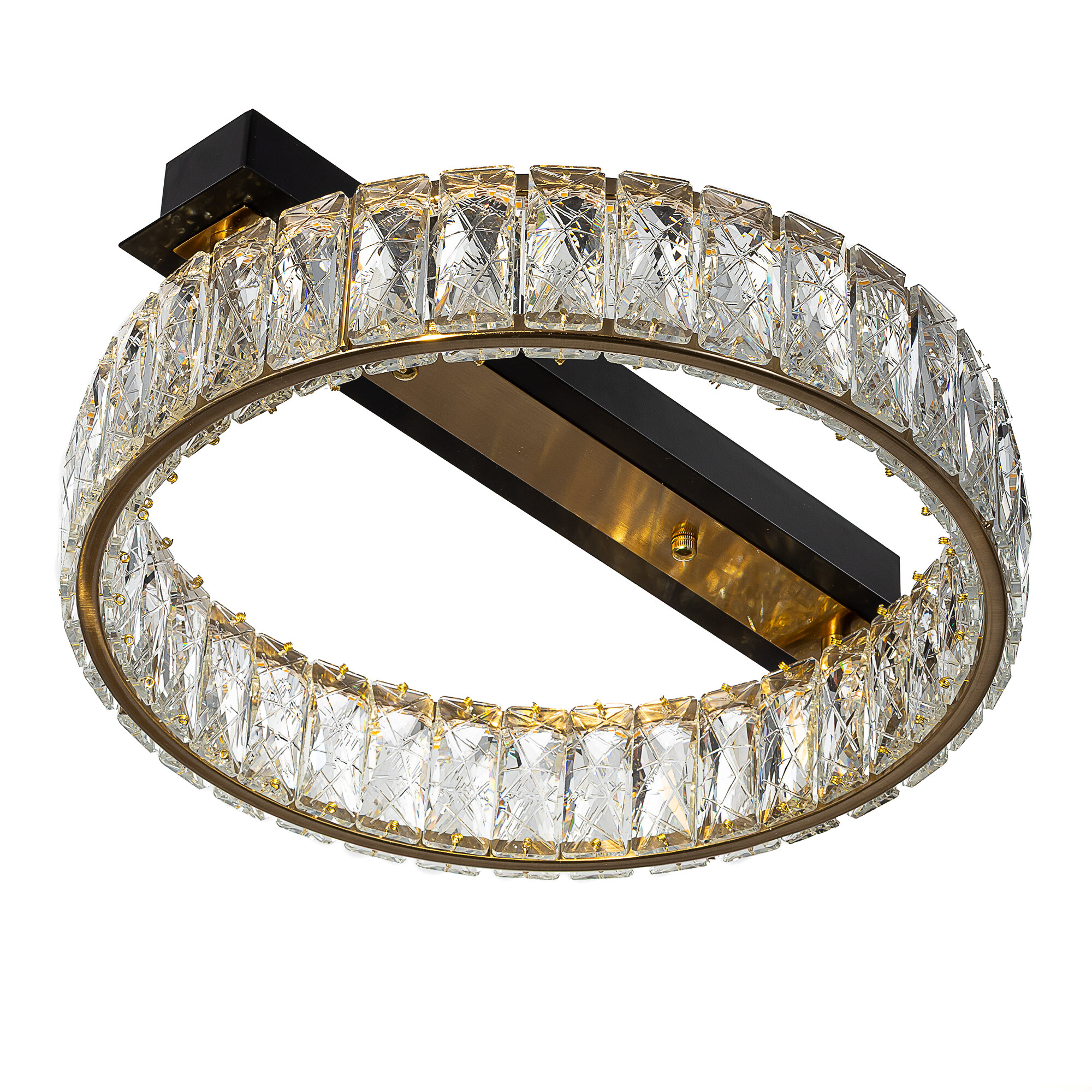 Каркас люстры — металлический, сочетаются черные и бронзовые элементы. На прямоугольном основании закреплено кольцо-модуль с хрустальным рассеивателем. Светодиодный свет с цветовой температурой 3000К мягко рассеивается в пространстве, играя на хрустальных гранях радужными искрами. Общая мощность люстры — 16Вт, ее можно установить на любой потолок, в том числе, натяжной.