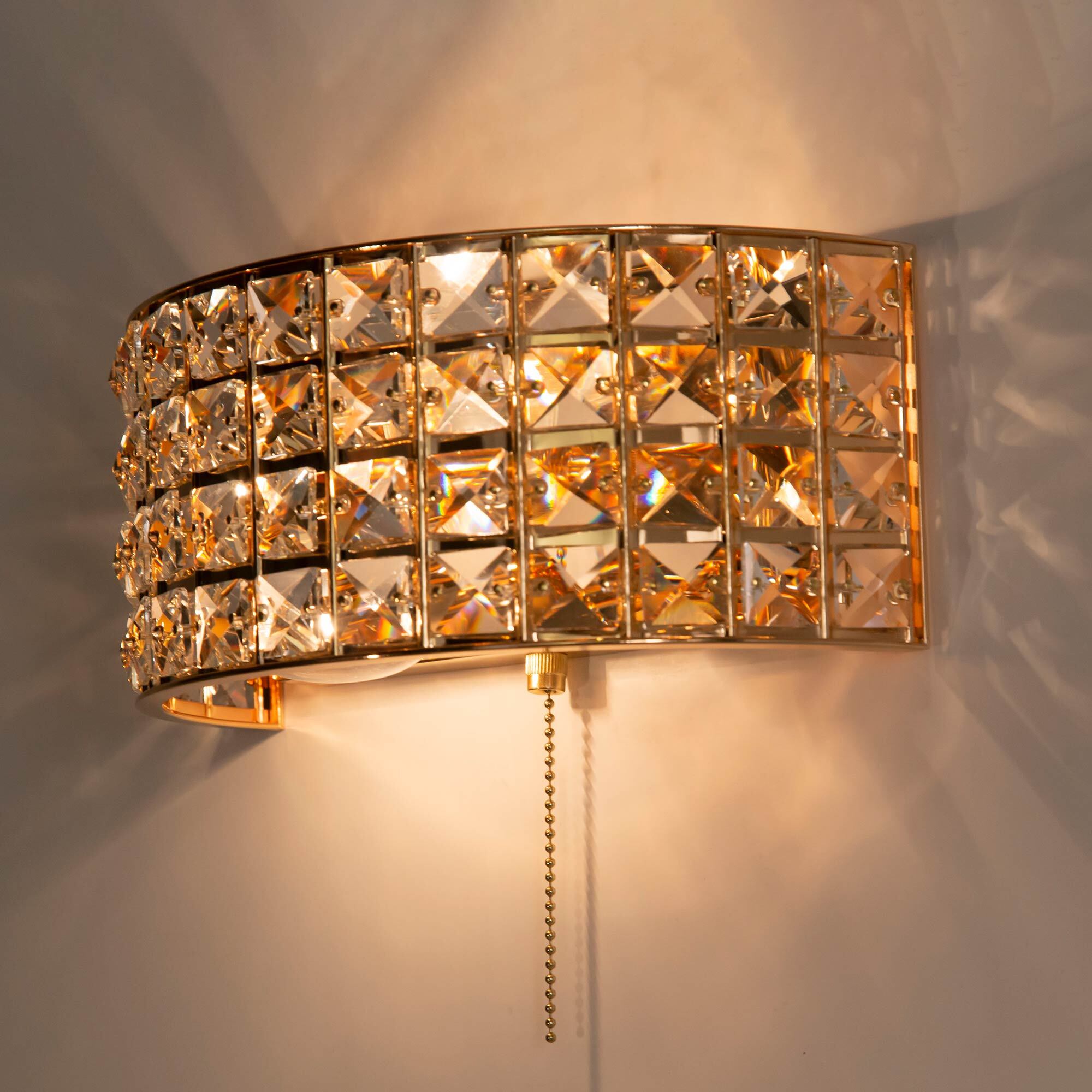 Шикарные бра из коллекции Портал станут изящным дополнением в интерьере ваших спален, гостиных, прихожих комнат или рабочих кабинетов. Стильное основание, сияющее ослепительным золотом, украшено хрустальными камнями знаменитой марки Asfour, которые способны преломлять световой поток, придавая ему неповторимые, волшебные оттенки. Светильник оснащён двумя термостойкими патронами, позволяющими использовать лампы накаливания до 60 Ватт. Если же, вы предпочитаете современные светодиодные лампы, то ограничения по мощности отсутствуют вовсе. При этом для того, чтобы хрусталь в полной мере раскрыл свои качества, желательно использовать исключительно прозрачные лампочки. Для удобства в эксплуатации в модель встроен собственный выключатель в виде золотой цепочки, в цвет самого изделия.