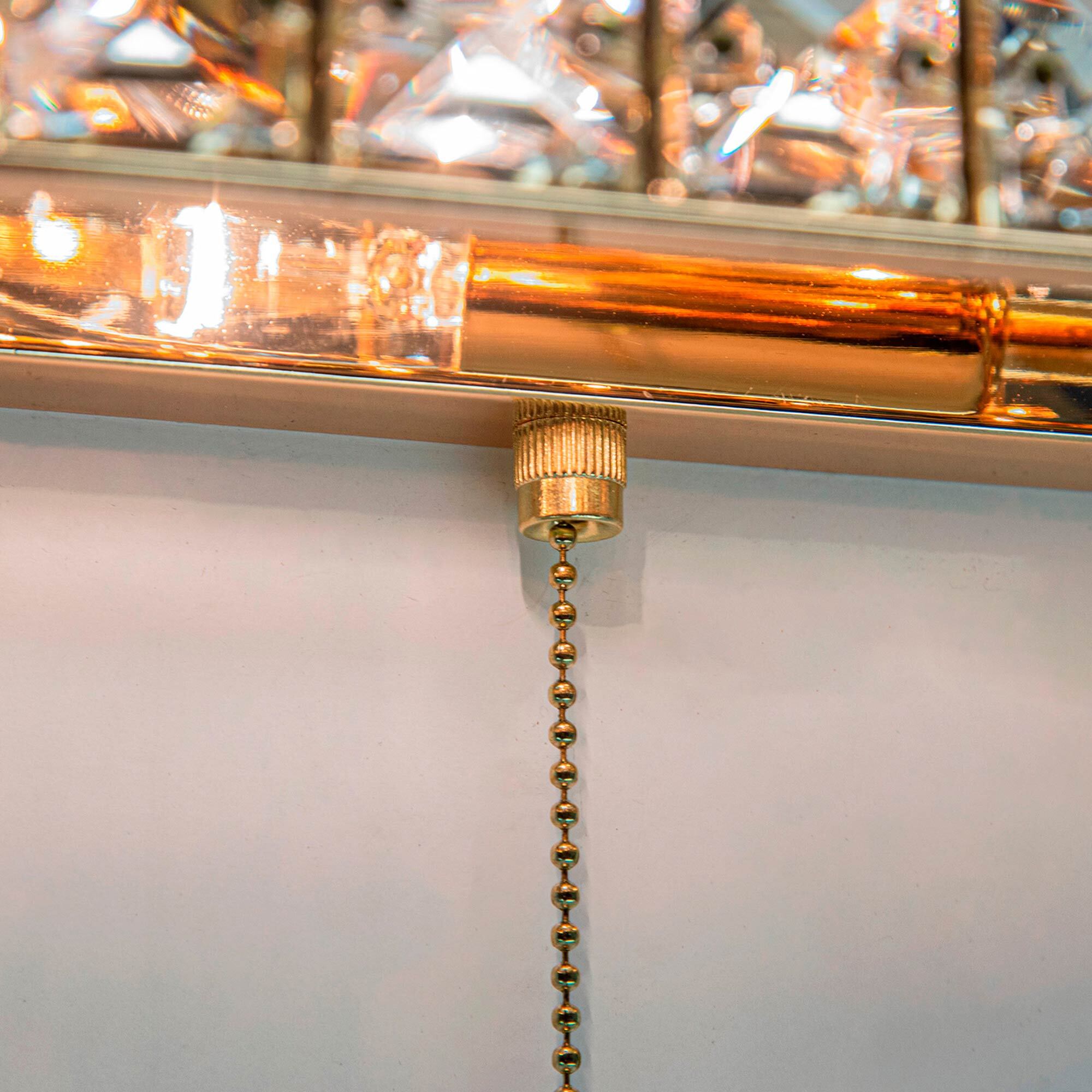 Элегантные настенные бра из серии Портал в золотом исполнении станут настоящей находкой для любителей мягких тёплых тонов в интерьере. Восхитительная игра хрусталя в сочетании со сверкающим основанием благородного золотого цвета способны привести в восторг истинных ценителей современной классики. Закругленные края прямоугольных конструкций делают их ещё более изящными и стильными. Все элементы изделий изготовлены из материалов высочайшего качества. Термостойкие патроны с цоколем Е14 из качественного углепластика дадут возможность применять лампы накаливания мощностью до 60 Ватт. Модель способна полноценно осветить площадь от 3-ёх до 6-ти квадратных метров, а встроенный выключатель в виде золотой цепочки станет удобным и приятным дополнением.