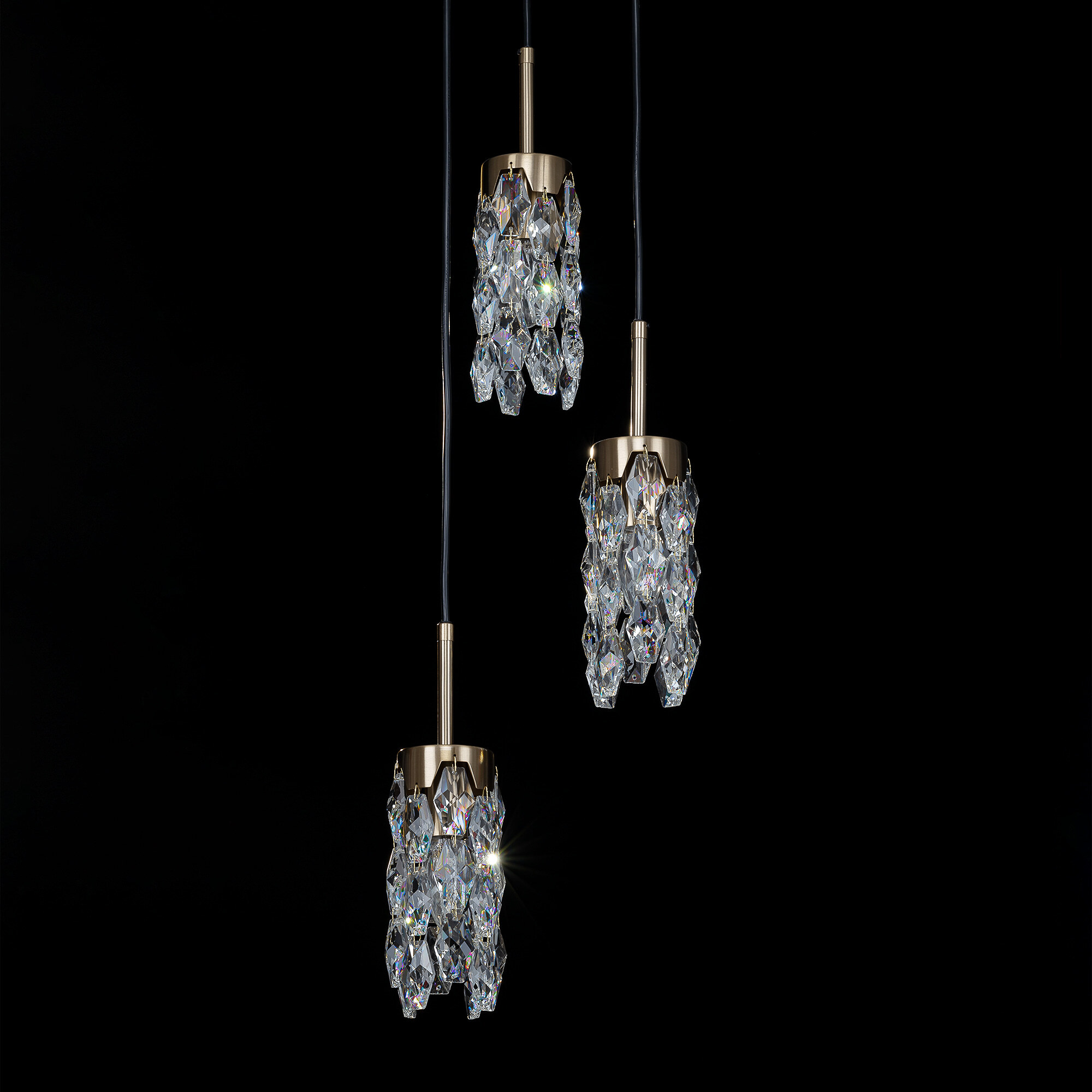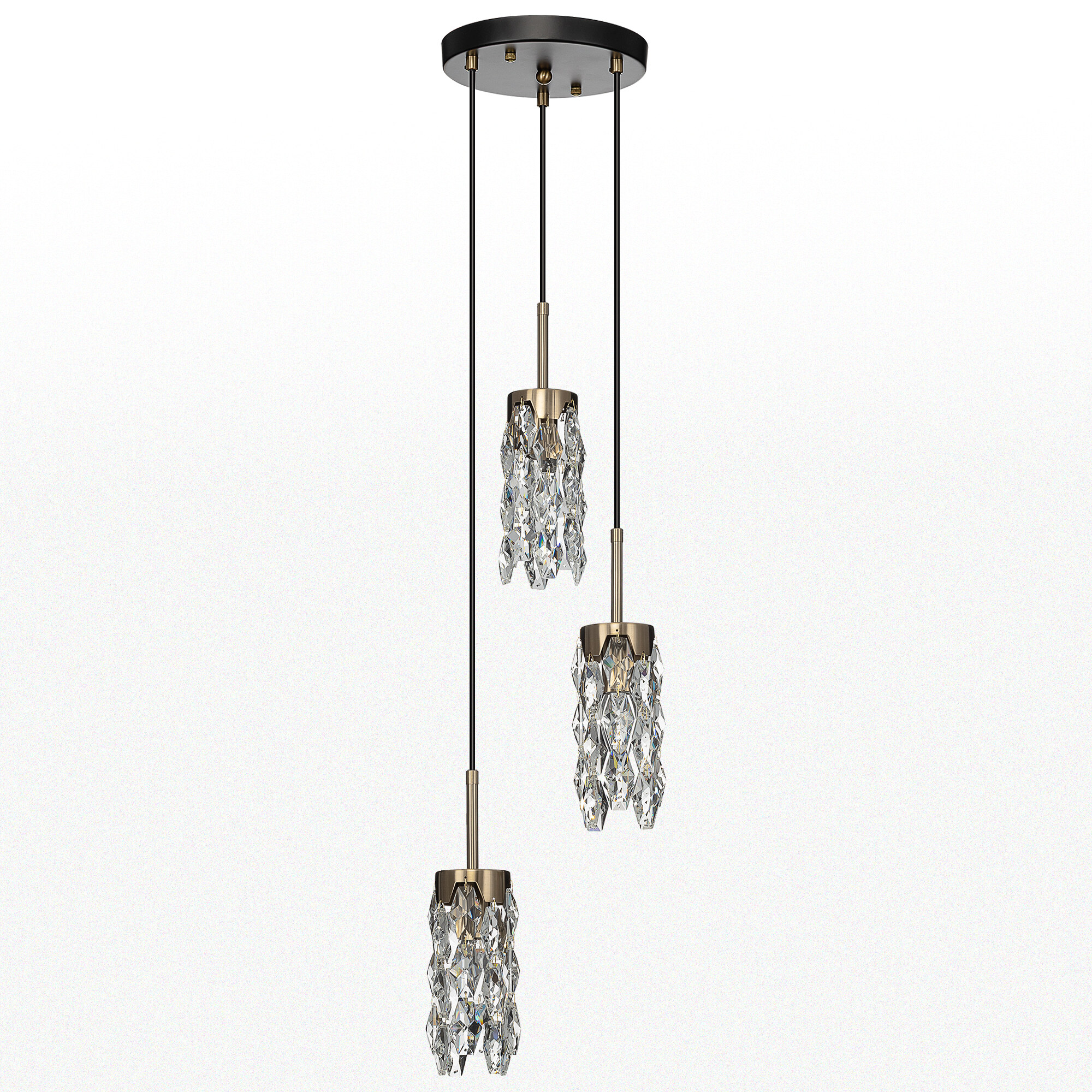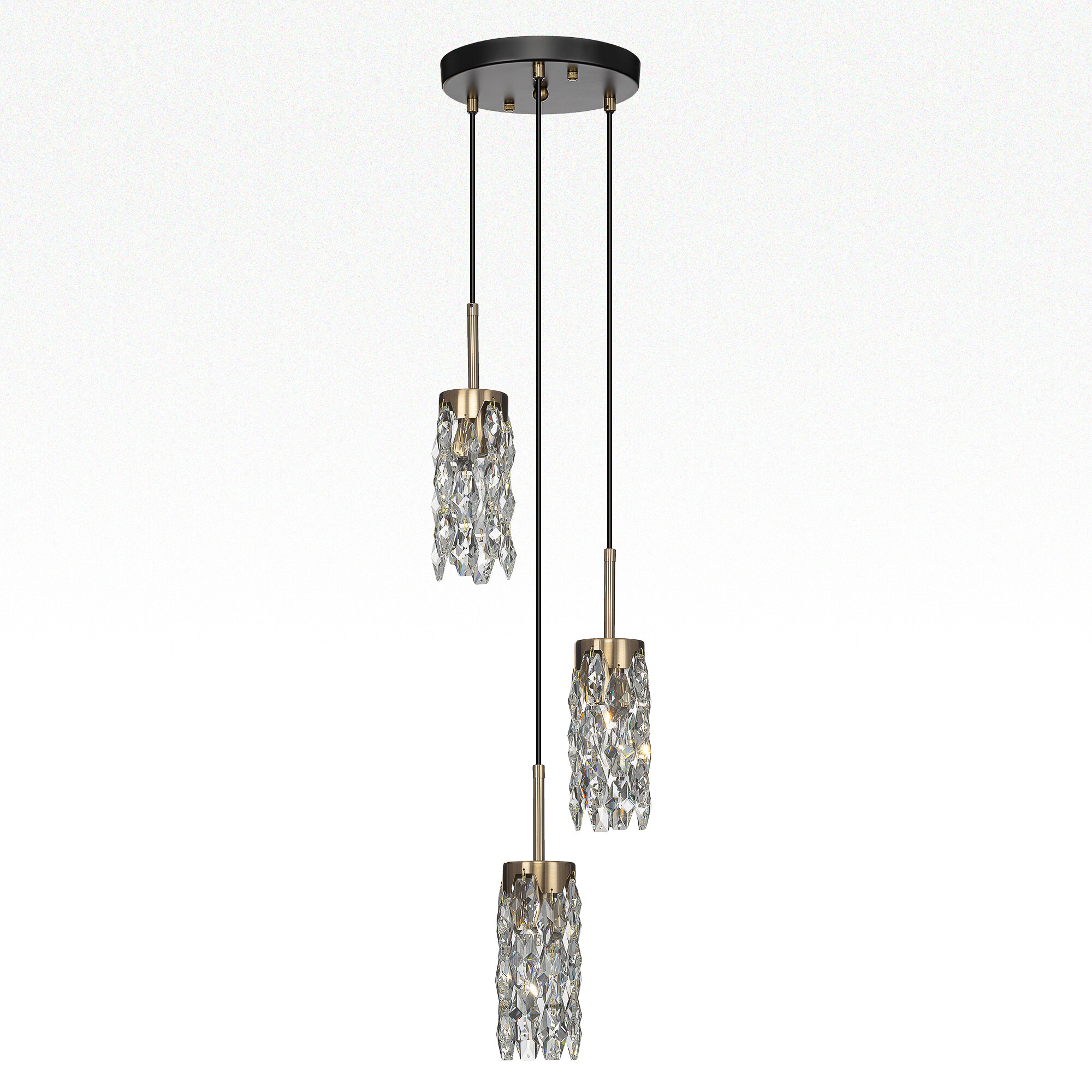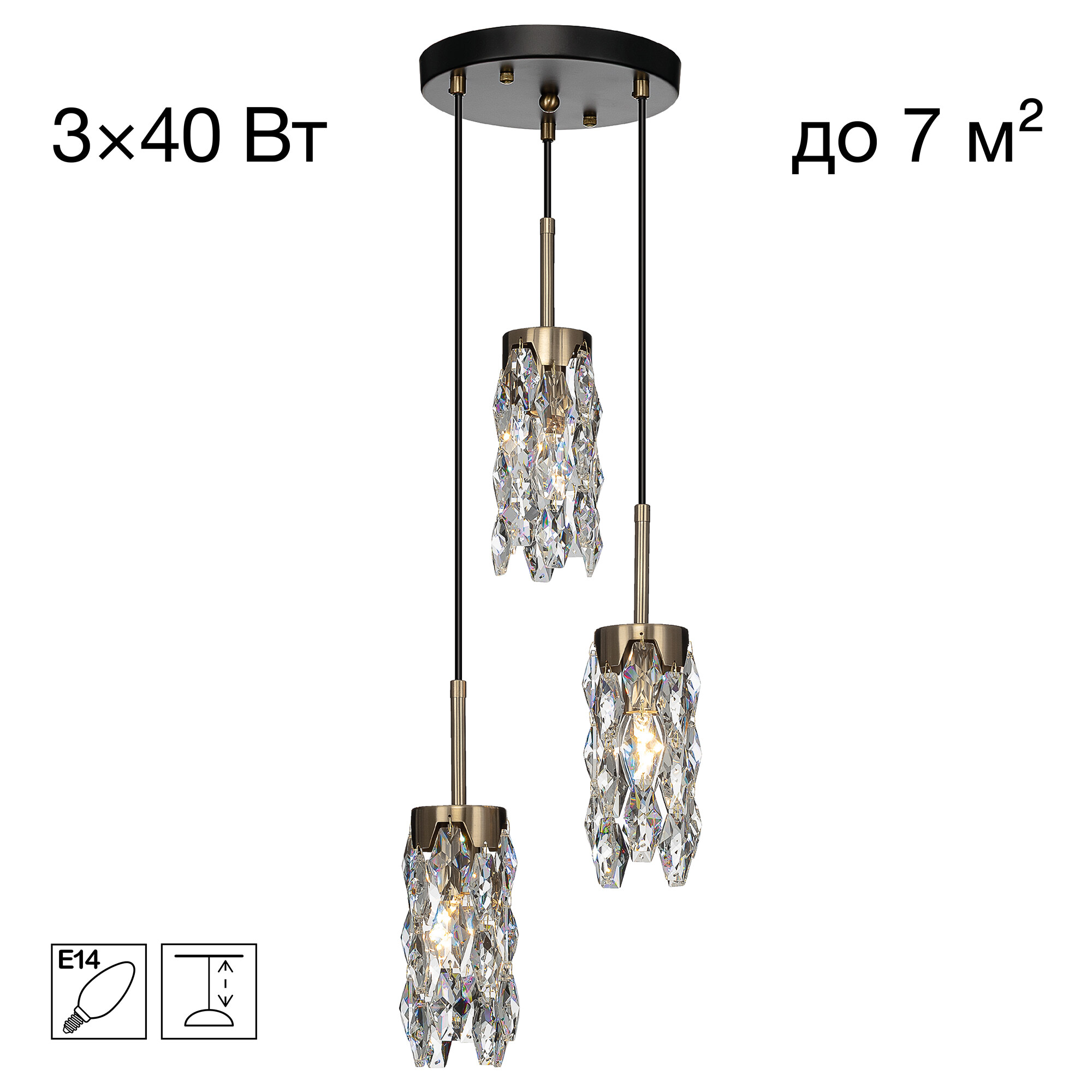 Каркас светильника — металлический, основание круглое, черного оттенка, на нем закреплено три подвеса. Бронзовые плафоны — цилиндрической формы, с хрустальными подвесками. Высоту подвесов можно отрегулировать, подстраиваясь под высоту потолков в помещении. Для изделия используются три лампочки с цоколем Е14, максимальная мощность для ламп накаливания — 40Вт.