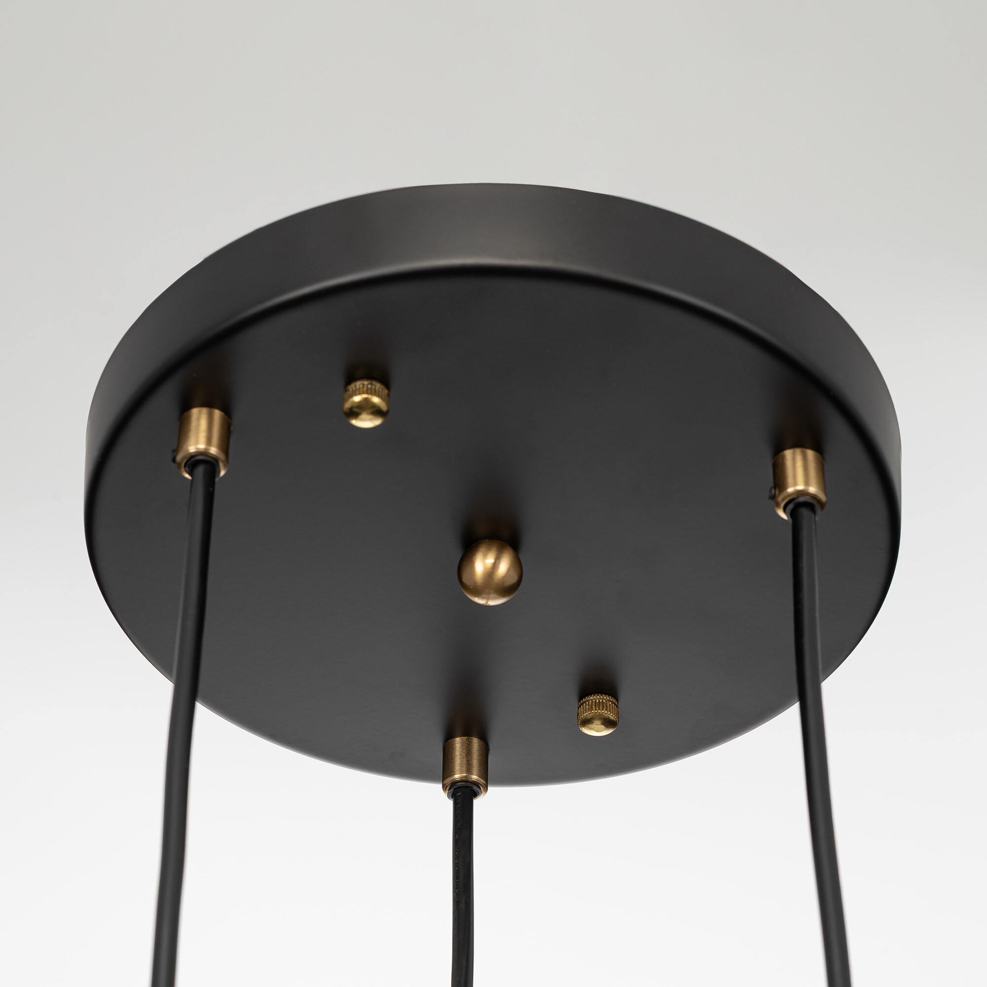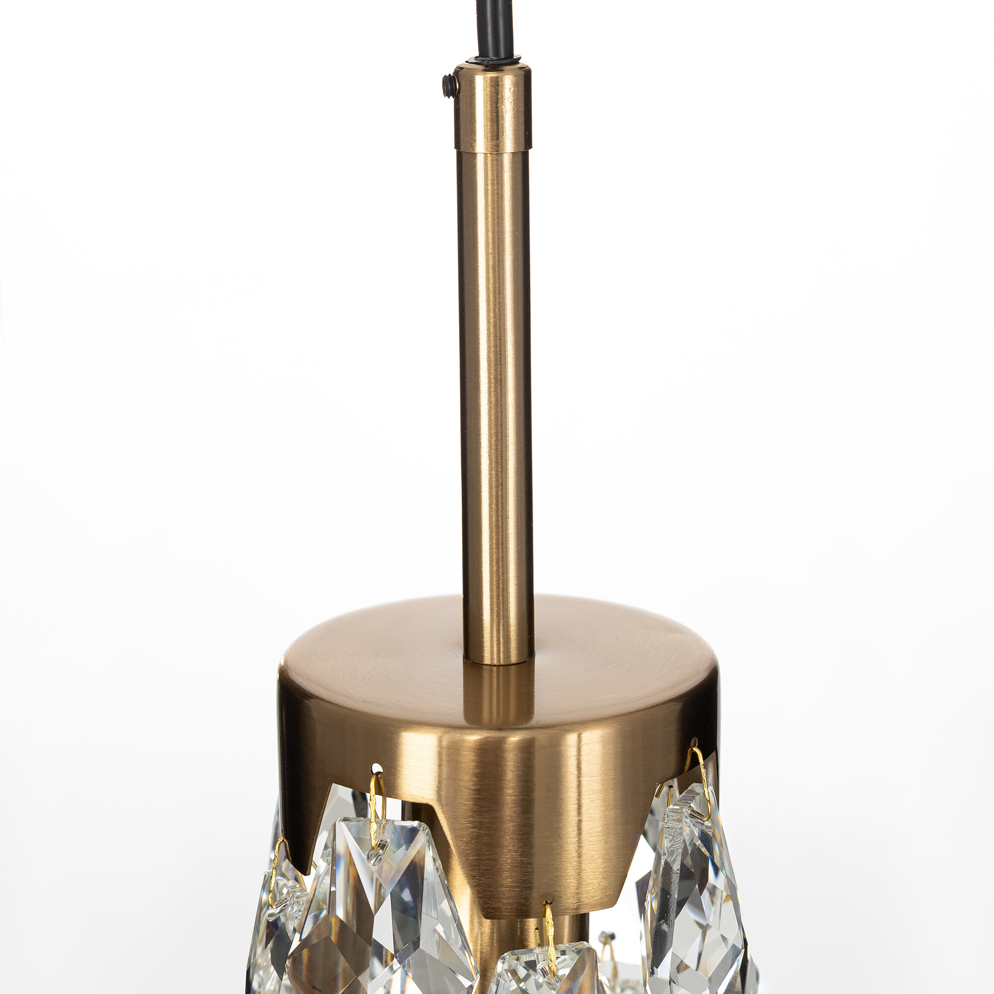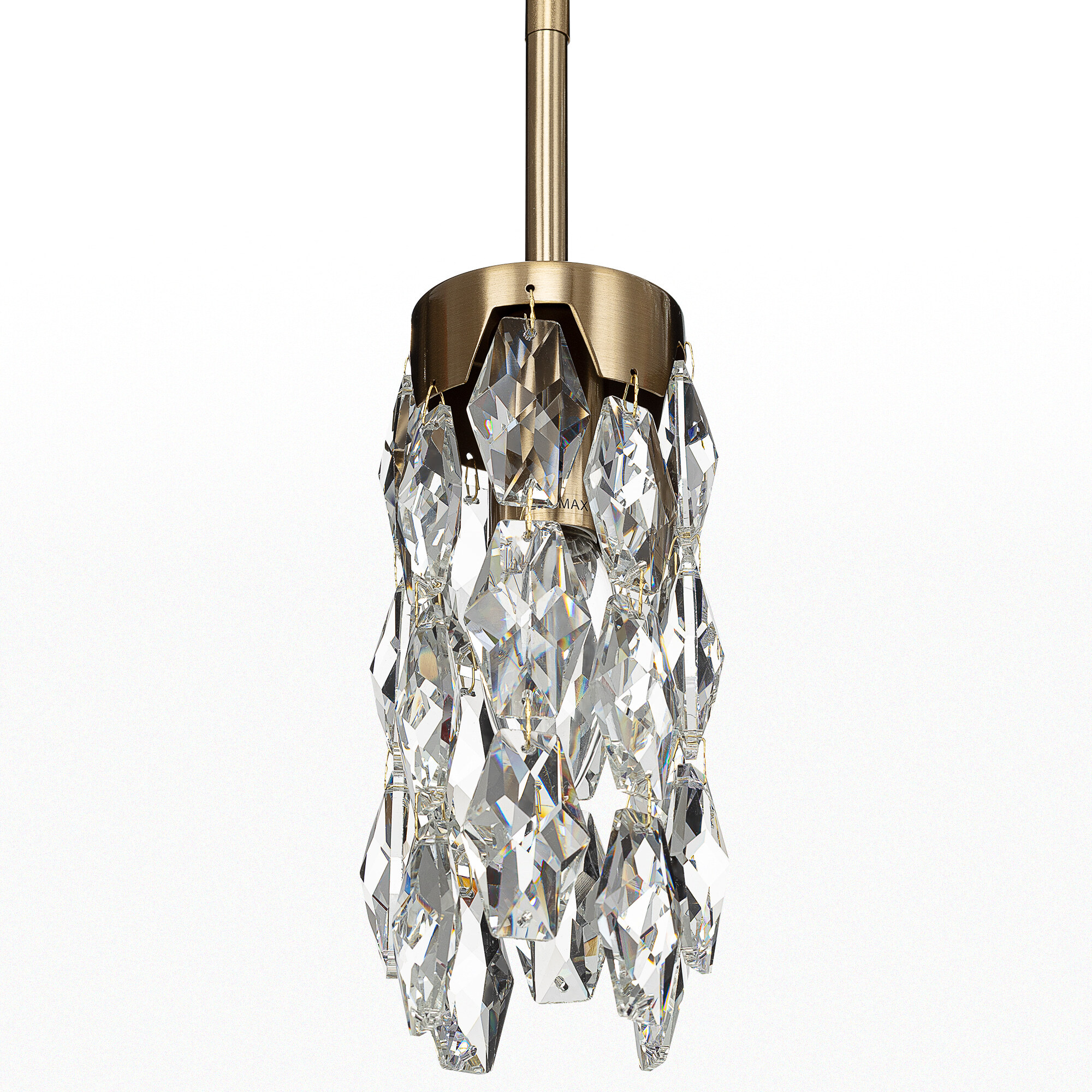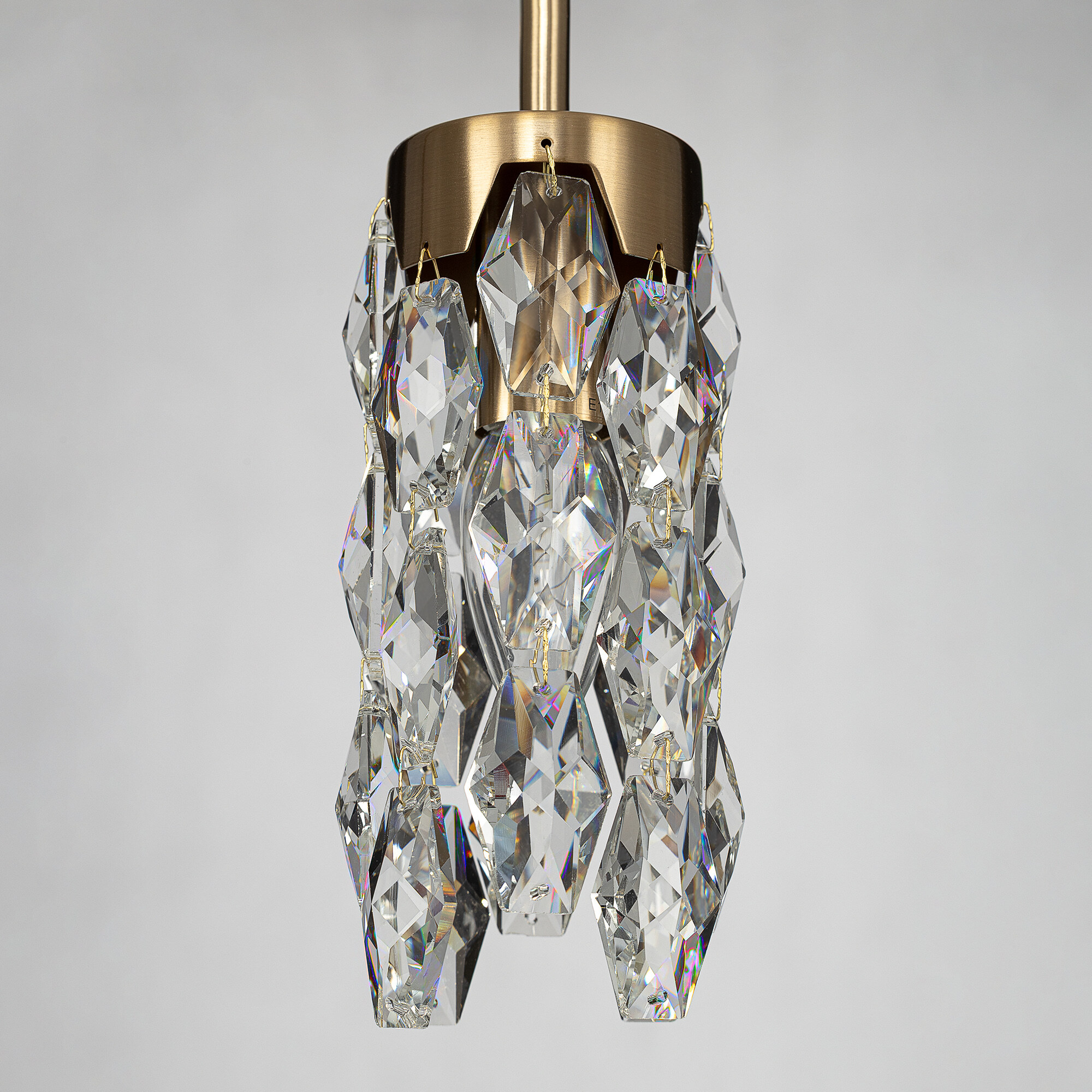 Каркас светильника — металлический, основание круглое, черного оттенка, на нем закреплено три подвеса. Бронзовые плафоны — цилиндрической формы, с хрустальными подвесками. Высоту подвесов можно отрегулировать, подстраиваясь под высоту потолков в помещении. Для изделия используются три лампочки с цоколем Е14, максимальная мощность для ламп накаливания — 40Вт.
