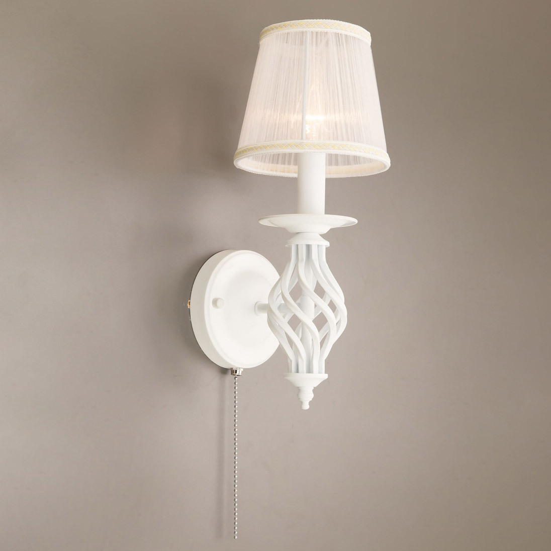 Бра настенная из коллекции «Ровена» выполнена в необычном, оригинальном дизайне - на основании под абажуром добавлен стильный винтажный элемент. Добавление этого элемента идеально позволяет привязать бра к одноименной коллекции подвесных люстр, настольных ламп и напольных торшеров. Так как стиль светильника очень интересный, то бра шикарно будут смотреться и как самостоятельные светильники в интерьере, особенно если устанавливать их по две или более. Модель выполнена из прочного металла, и окрашена в белый цвет. Такая покраска максимально универсальна, отлично смотрится, ни к чему не обязывает и не режет глаз. В комплекте поставляется один полупрозрачный белый абажур, который идеально будет рассеивать свет и создавать уют в вашей комнате. На основании светильника встроен удобный собственный выключатель. Патроны сделаны из качественного термостойкого материала, позволяющие ставить лампочки накаливания до 60 ватт включительно, энергосберегающие и светодиодные лампочки можно применять любой мощности. За счёт этого момента светильник очень яркий, площадь освещения до 3 квадратных метров.