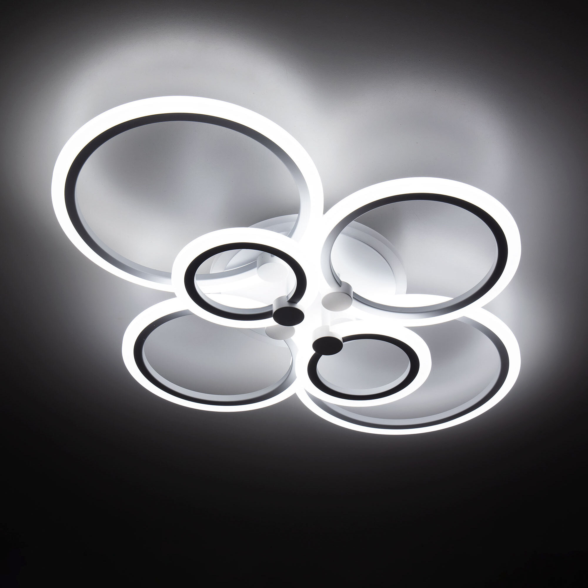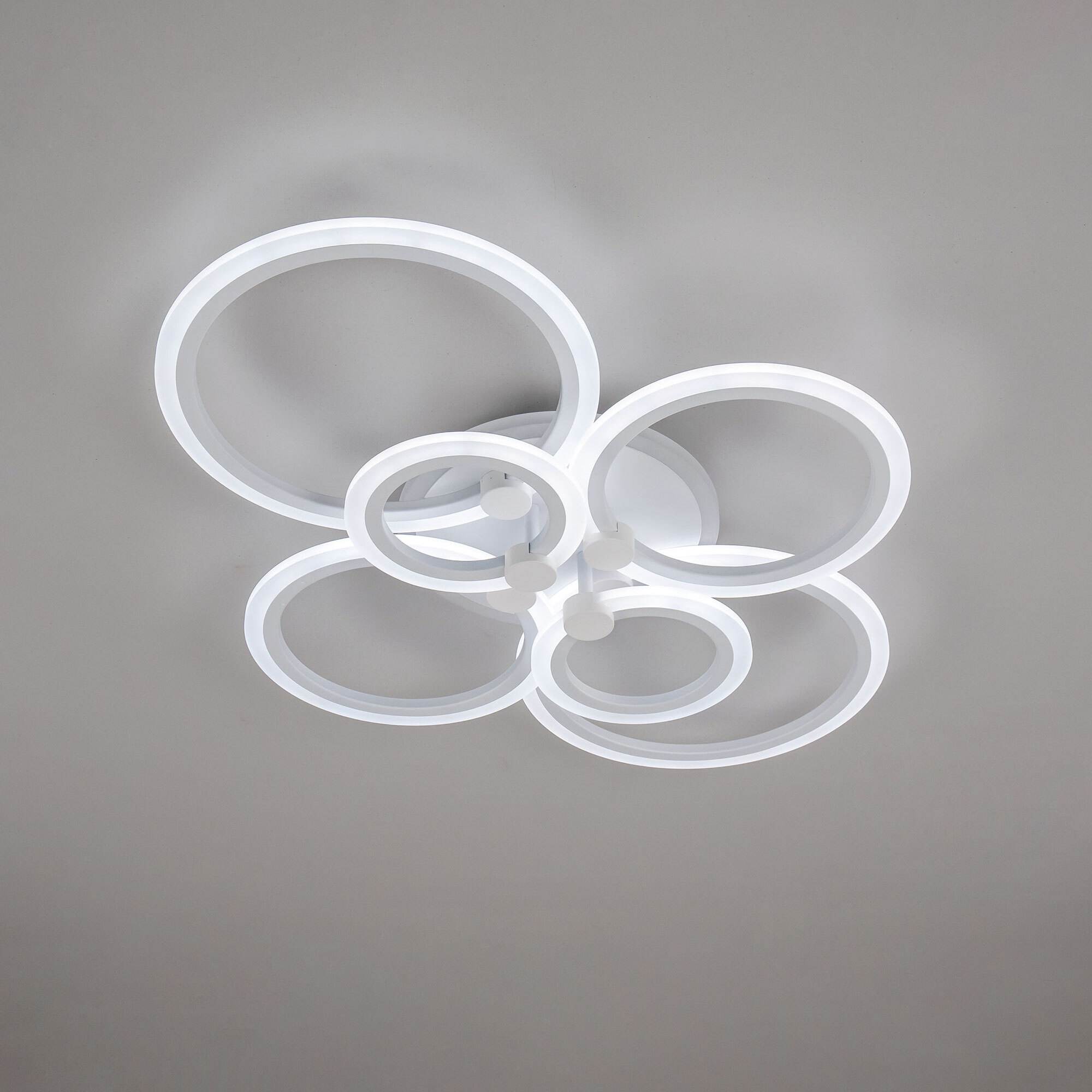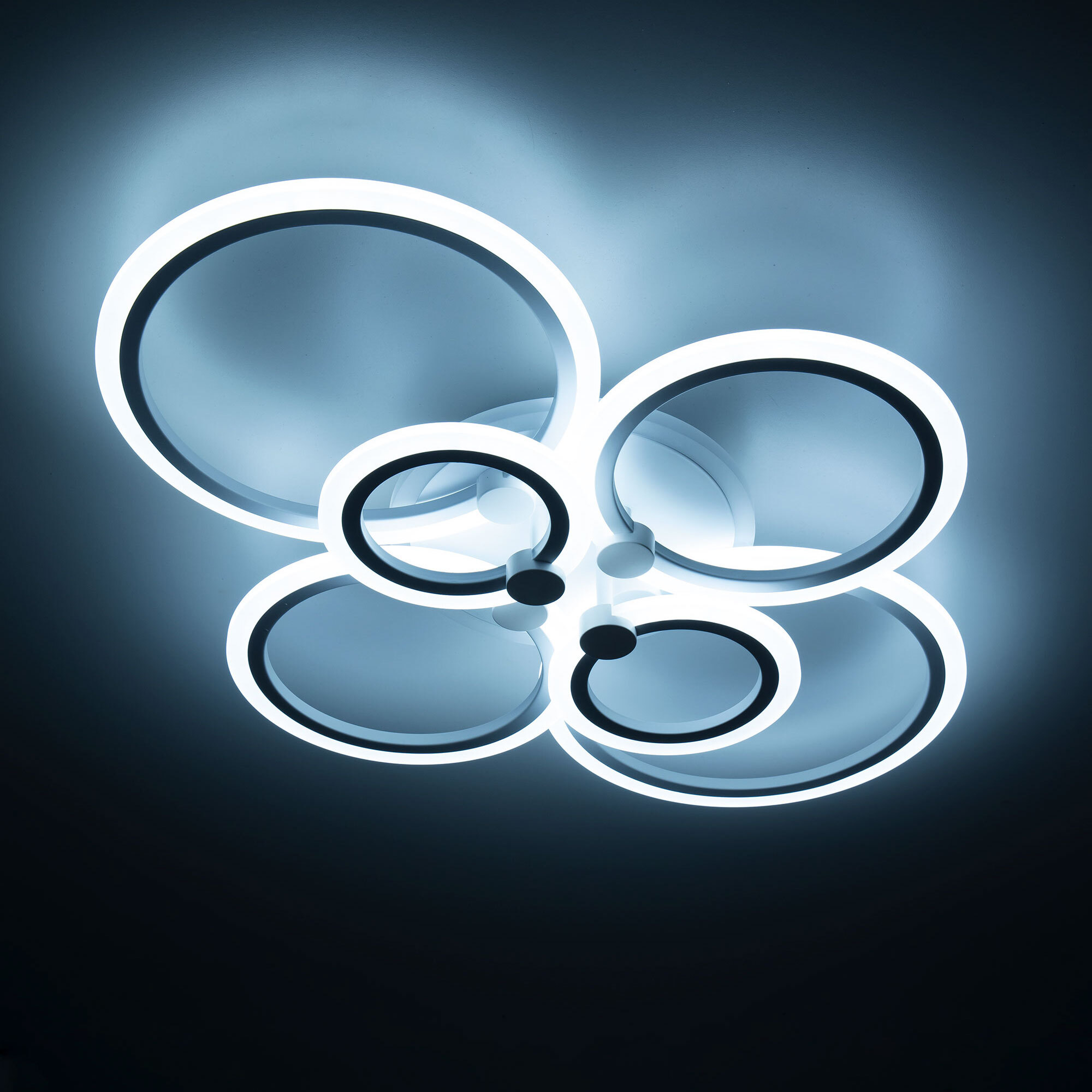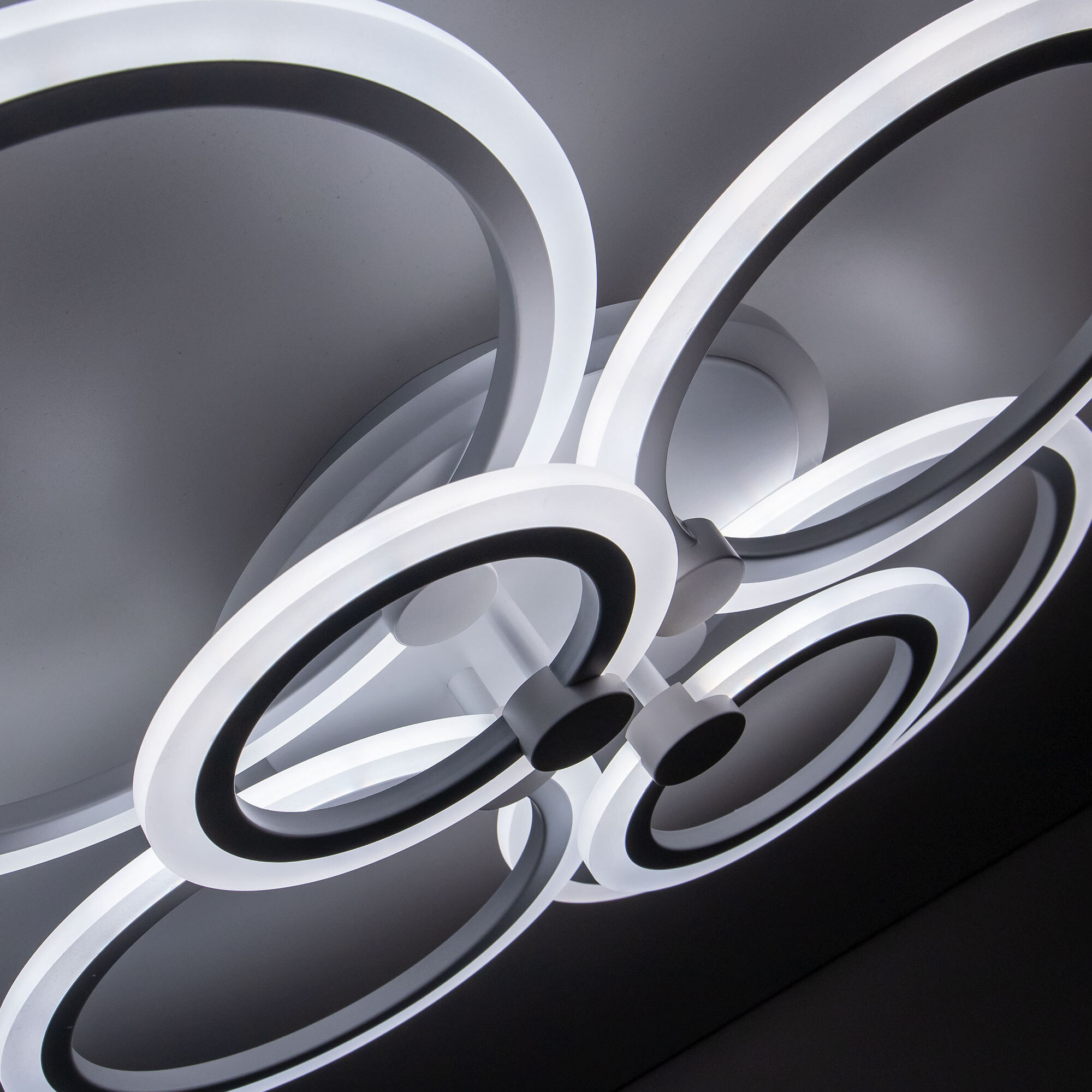 Люстра светодиодная Citilux Сента CL237B160E управляемая. Корпус металлический, цвет белый матовый. Основание круглое, шесть светодиодных модулей-плафонов в формы колец. Светильником можно управлять с помощью радиопульта дистанционного управления и настенным выключателем. Мощность изделия 90Вт, световой поток 7200Лм, осветит около 25м². Пульт ДУ в комплекте, тип батареек ААА (батарейками не комплектуется).Пульт ДУ обладает широким набором функций: регулировка яркости от 100% до 10%; управление цветовой температурой в диапазоне 3000-5500К, позволяет настроить любые оттенки теплого, нейтрального или холодного света; 2 режима цветной RGB подсветки основания; отсроченное выключения и режим ночника; 4 кнопки памяти, на которых можно сохранить любые выбранные настройки и включать их в одно касание; 4 выделенных канала, к которым можно привязать неограниченное количество светильников.