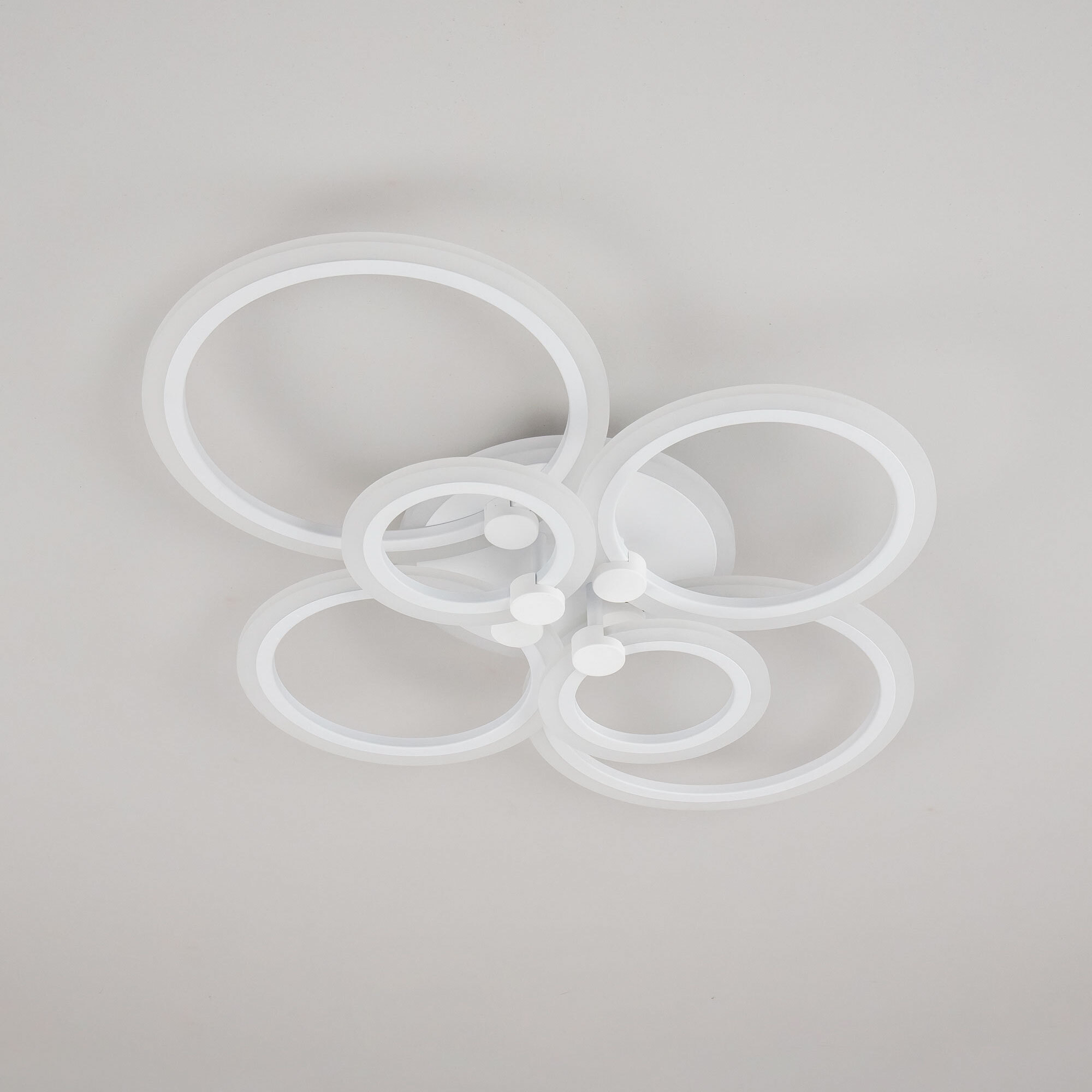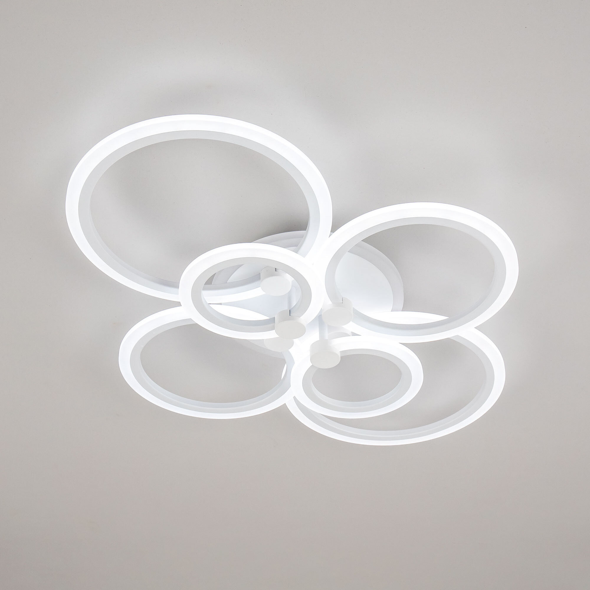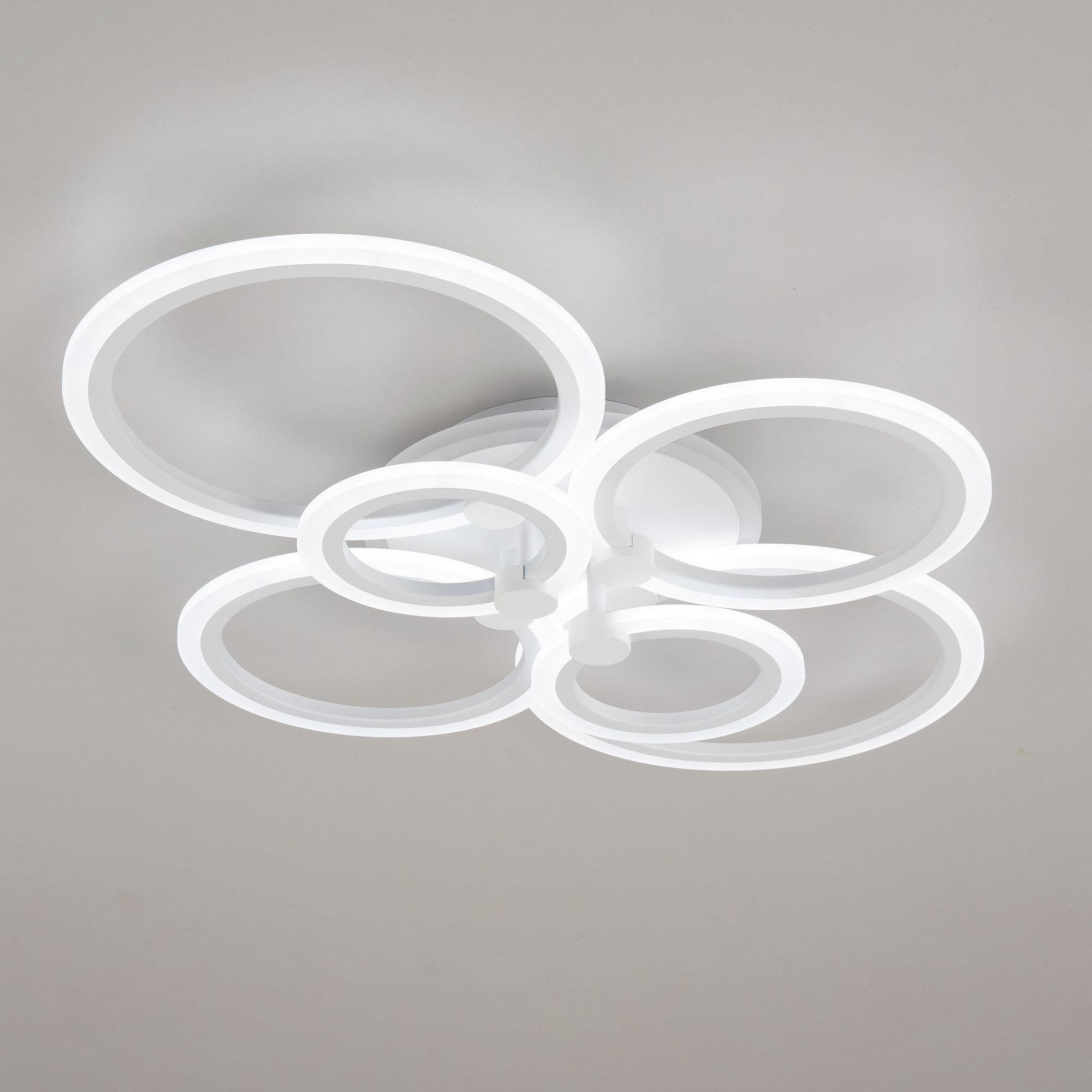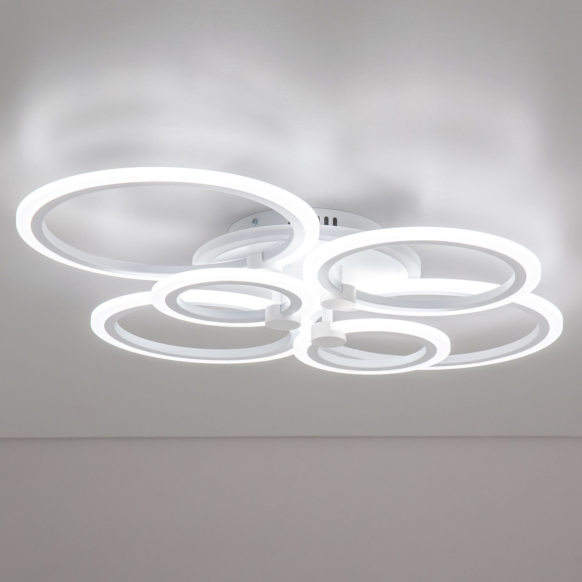Люстра светодиодная Citilux Сента CL237B160E управляемая. Корпус металлический, цвет белый матовый. Основание круглое, шесть светодиодных модулей-плафонов в формы колец. Светильником можно управлять с помощью радиопульта дистанционного управления и настенным выключателем. Мощность изделия 90Вт, световой поток 7200Лм, осветит около 25м². Пульт ДУ в комплекте, тип батареек ААА (батарейками не комплектуется).Пульт ДУ обладает широким набором функций: регулировка яркости от 100% до 10%; управление цветовой температурой в диапазоне 3000-5500К, позволяет настроить любые оттенки теплого, нейтрального или холодного света; 2 режима цветной RGB подсветки основания; отсроченное выключения и режим ночника; 4 кнопки памяти, на которых можно сохранить любые выбранные настройки и включать их в одно касание; 4 выделенных канала, к которым можно привязать неограниченное количество светильников.