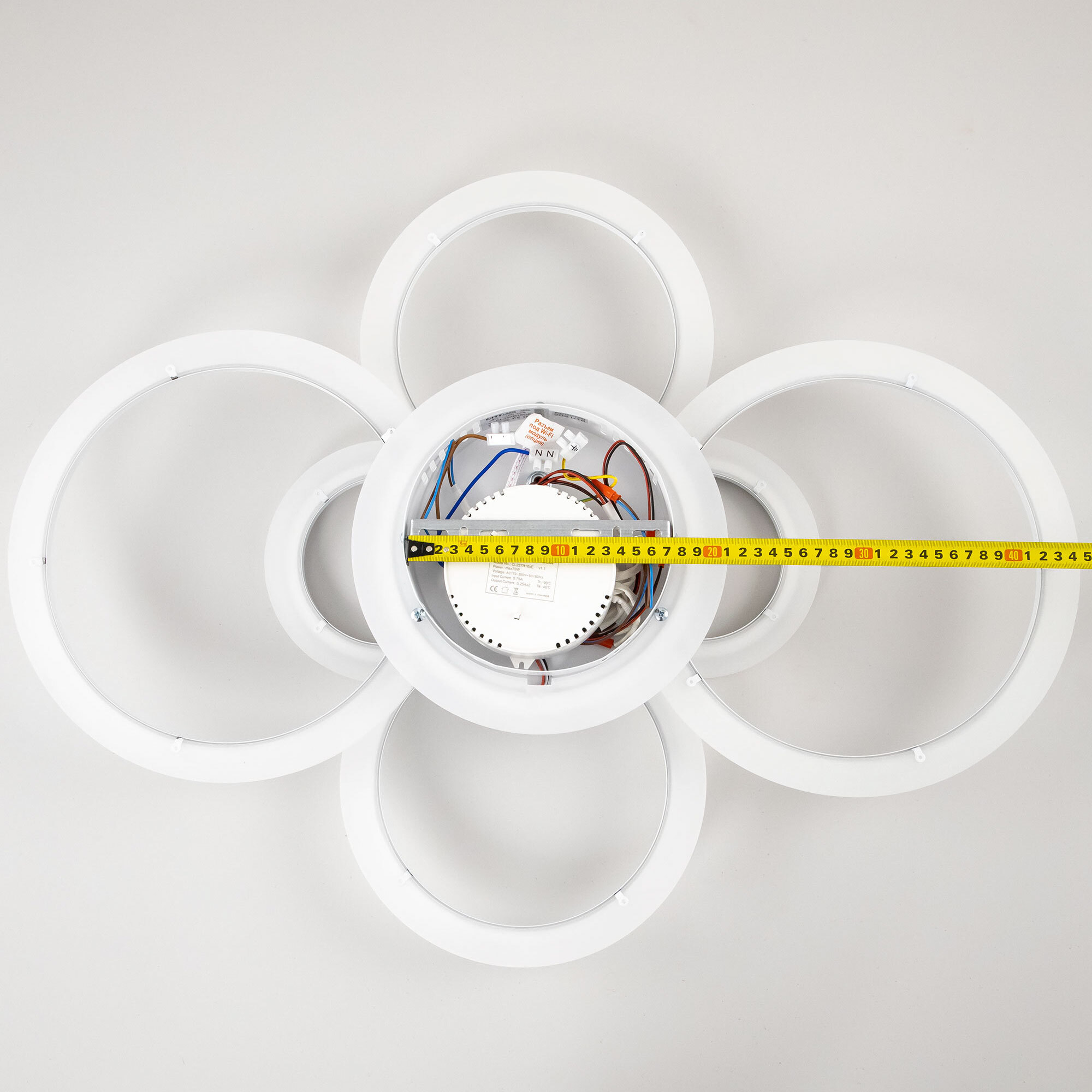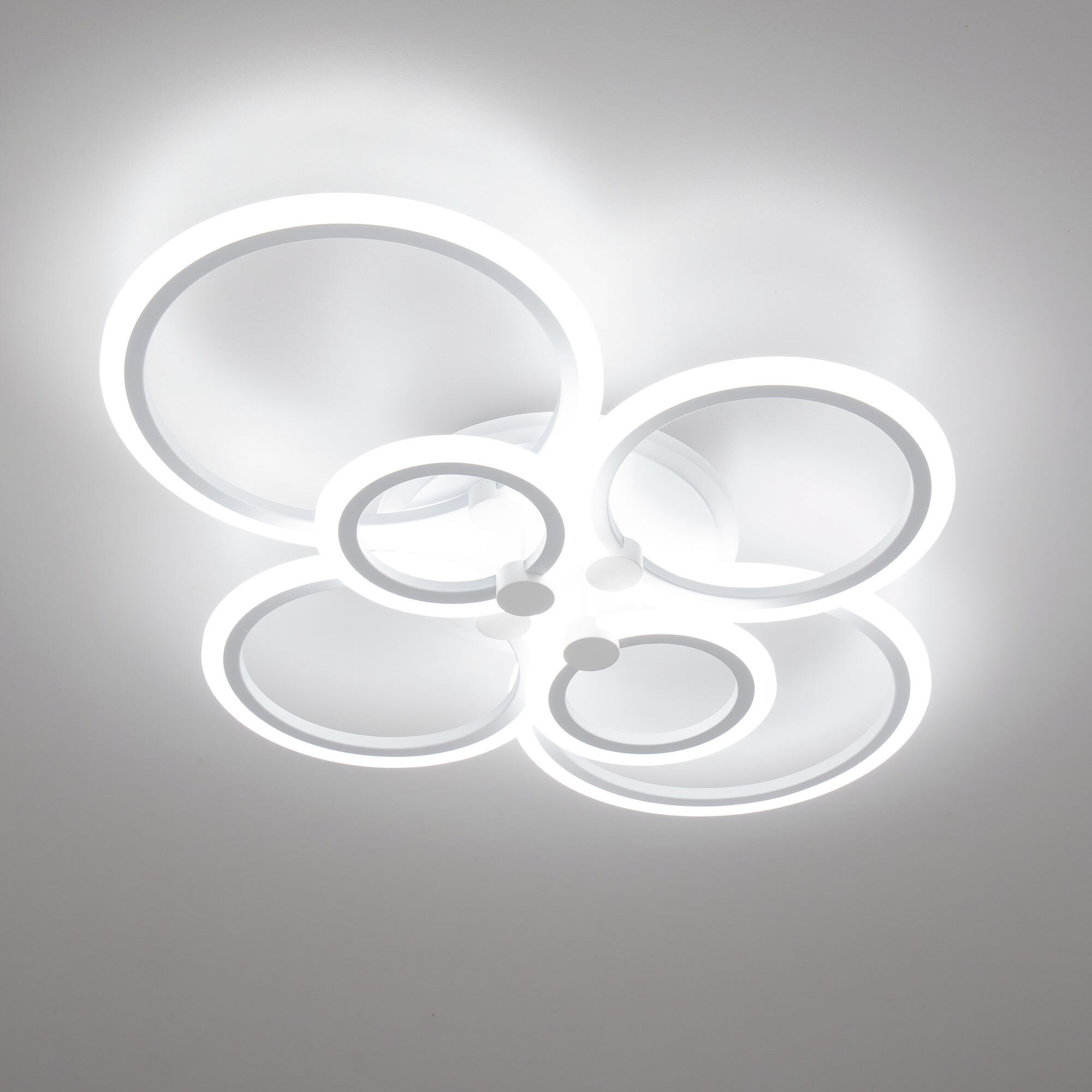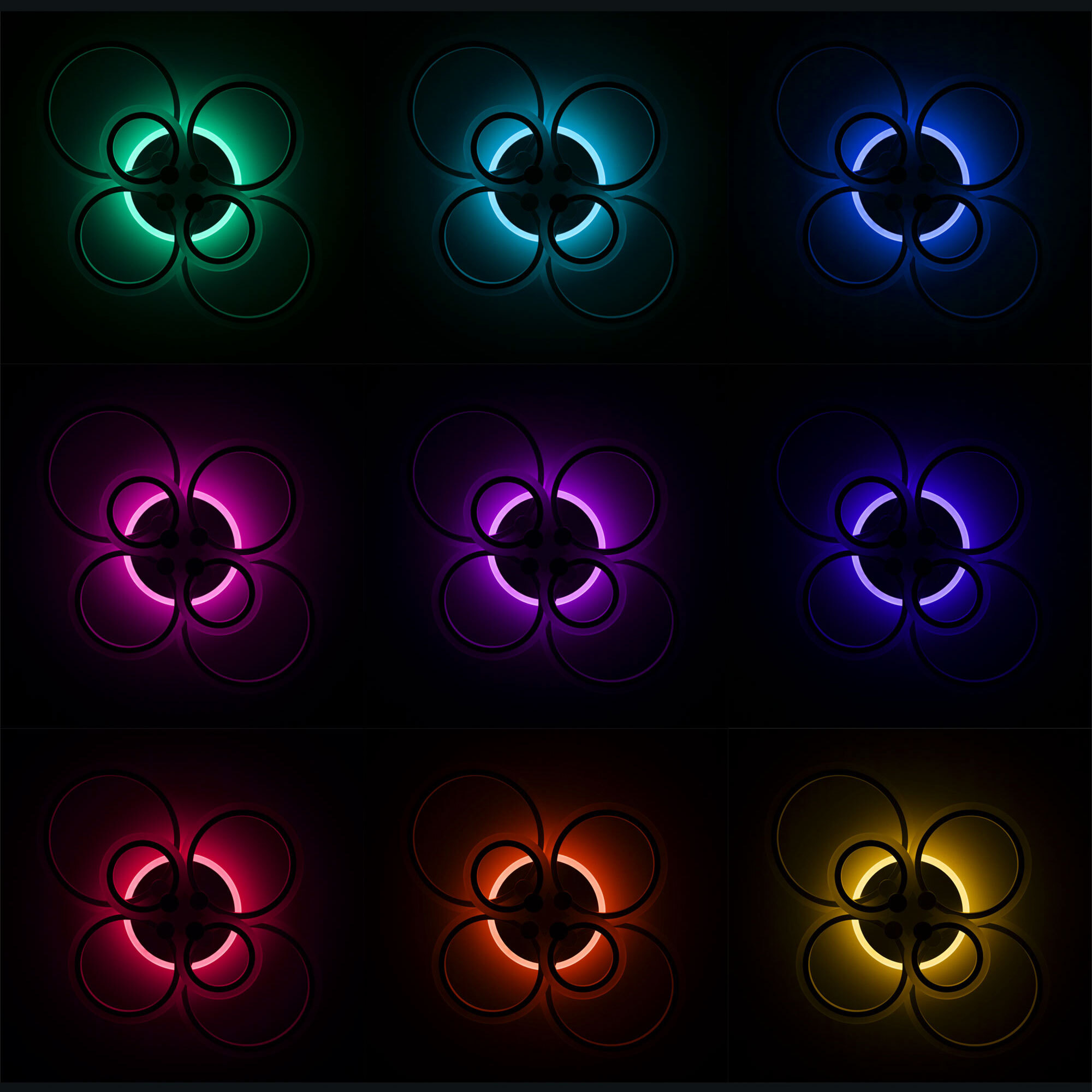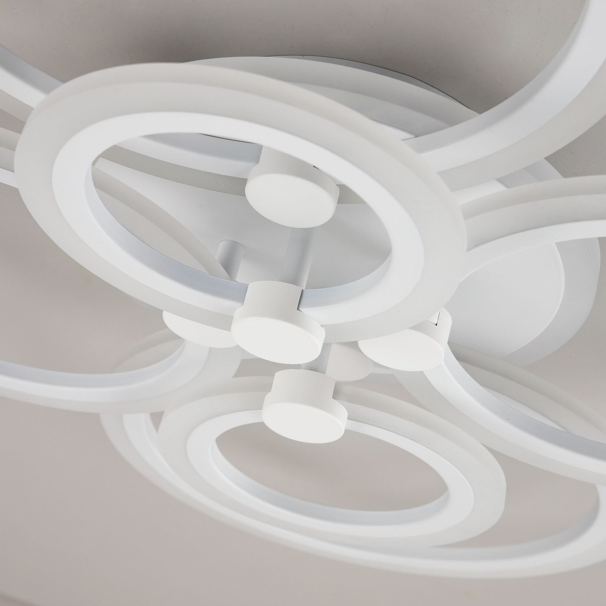 Люстра светодиодная Citilux Сента CL237B160E управляемая. Корпус металлический, цвет белый матовый. Основание круглое, шесть светодиодных модулей-плафонов в формы колец. Светильником можно управлять с помощью радиопульта дистанционного управления и настенным выключателем. Мощность изделия 90Вт, световой поток 7200Лм, осветит около 25м². Пульт ДУ в комплекте, тип батареек ААА (батарейками не комплектуется).Пульт ДУ обладает широким набором функций: регулировка яркости от 100% до 10%; управление цветовой температурой в диапазоне 3000-5500К, позволяет настроить любые оттенки теплого, нейтрального или холодного света; 2 режима цветной RGB подсветки основания; отсроченное выключения и режим ночника; 4 кнопки памяти, на которых можно сохранить любые выбранные настройки и включать их в одно касание; 4 выделенных канала, к которым можно привязать неограниченное количество светильников.