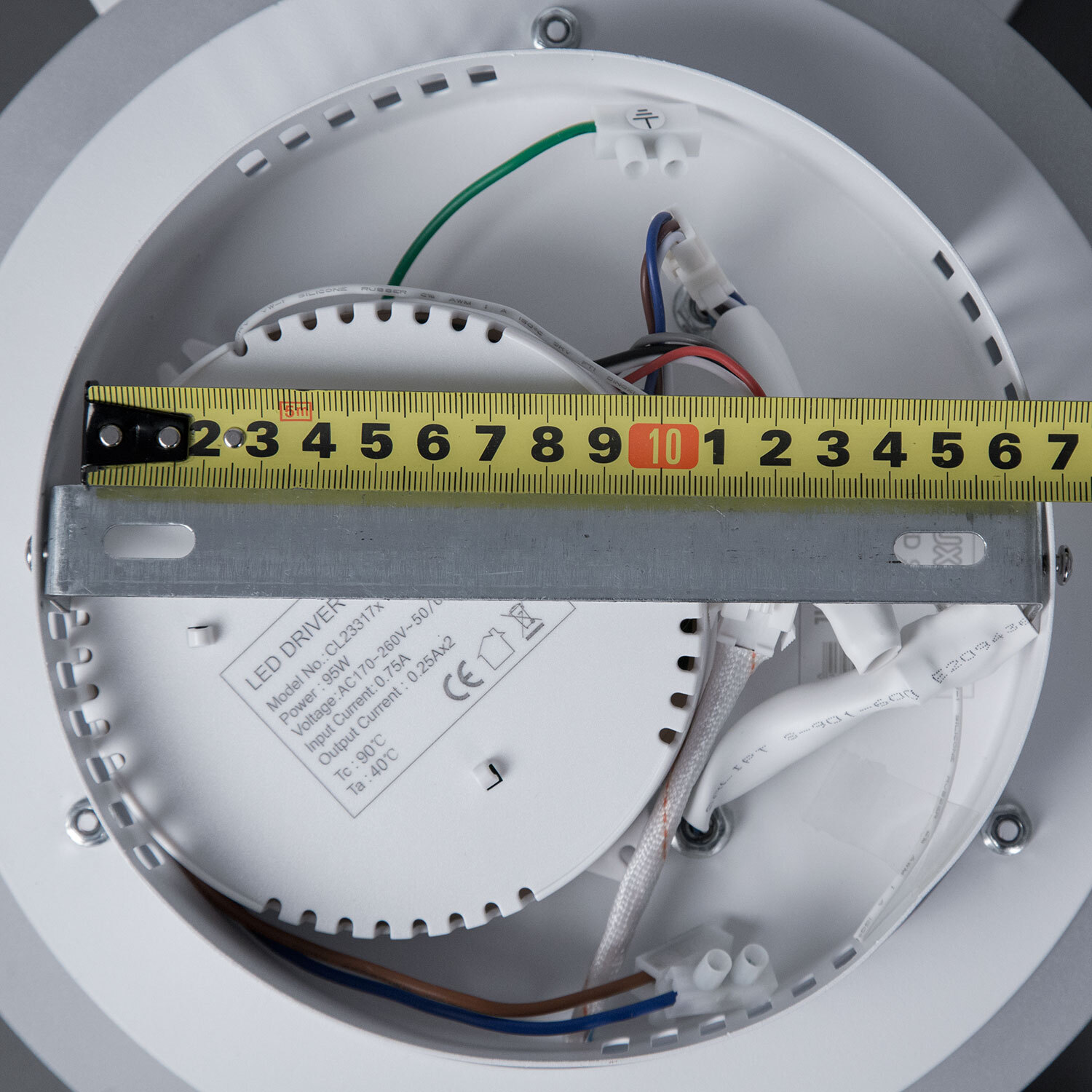 Модель оснащена мощными светодиодами, с возможностью плавной регулировки яркости от 10 до 100%. Цветовая температура регулируется в диапазоне от 3000К до 5500К, позволяя настроить любые оттенки теплого, нейтрального или холодного света. В основании светильника установлена независимая цветная подсветка RGB. Мощность люстры 100Вт, 7000Лм, площадь освещения при стандартной высоте потолков около 25 кв. метра. Пульт ДУ в комплекте, тип батареек ААА (батарейками не комплектуется).
