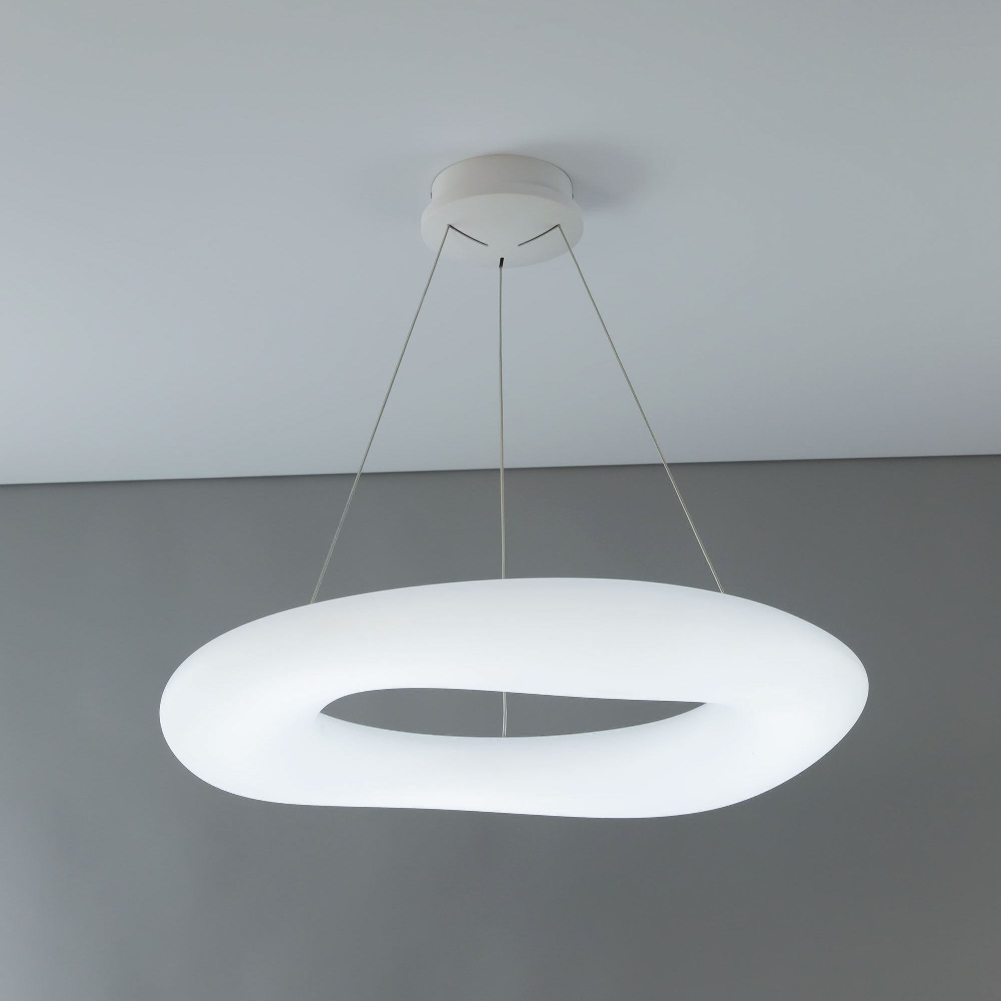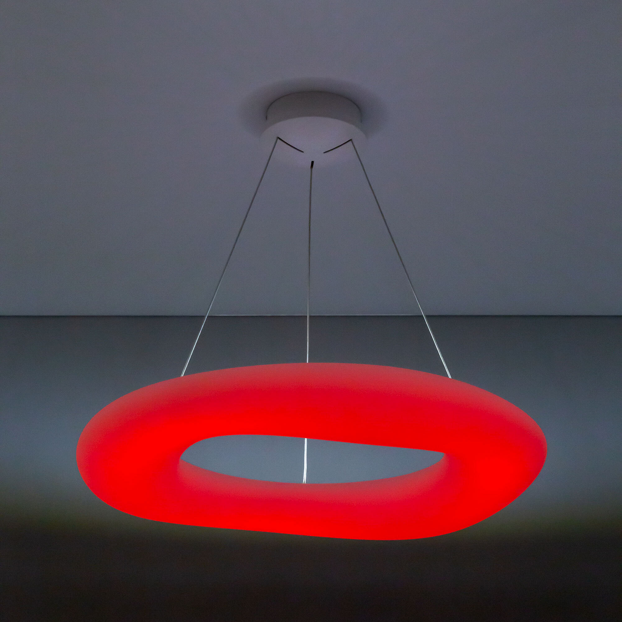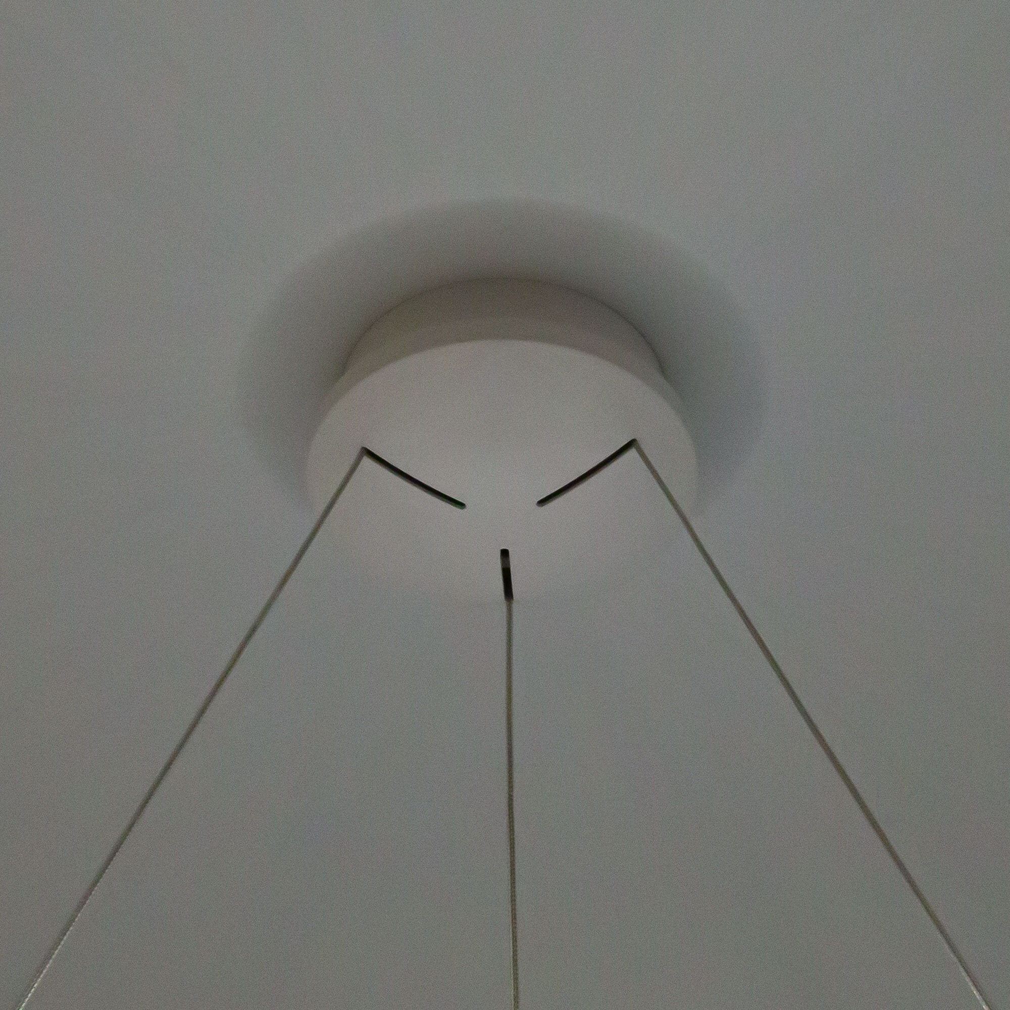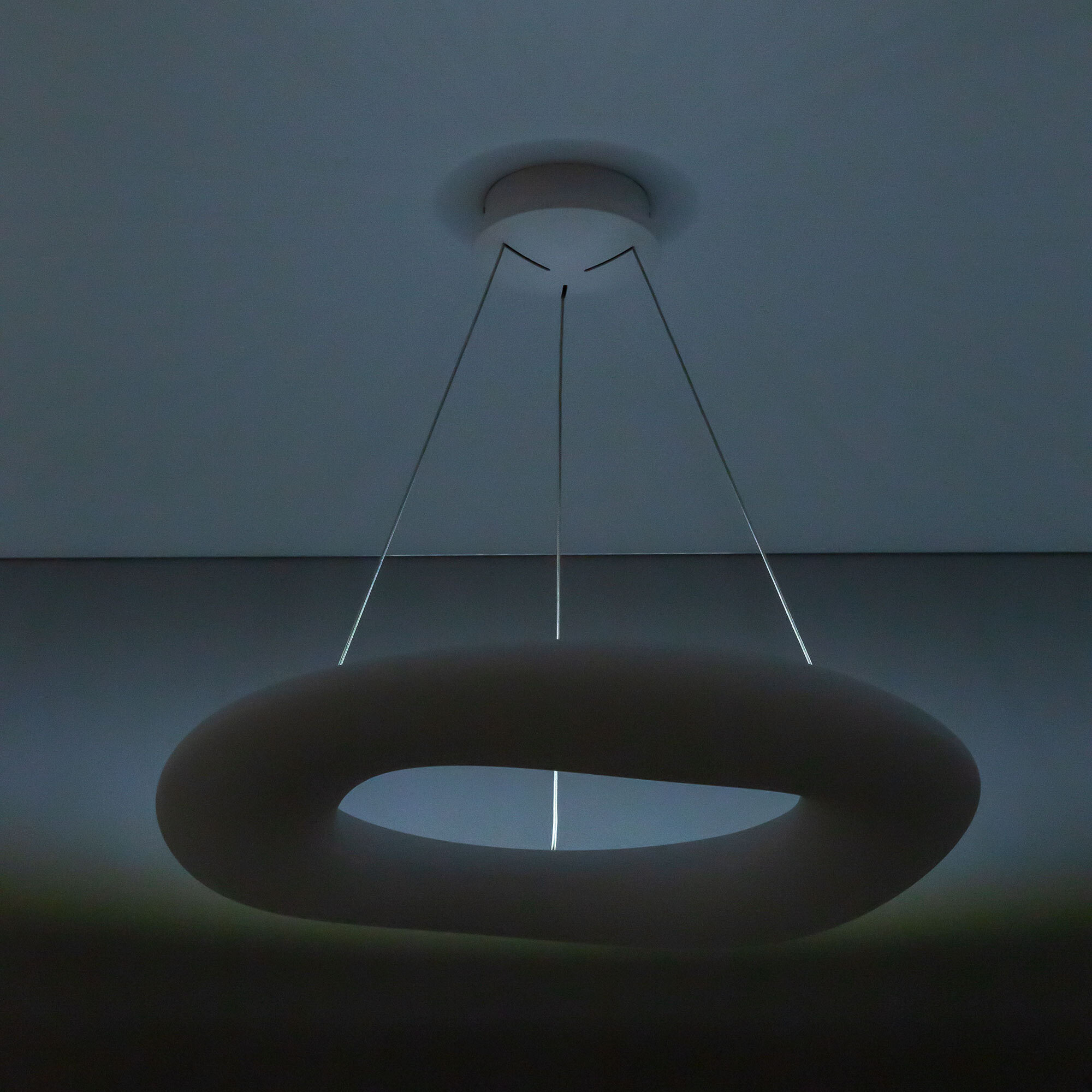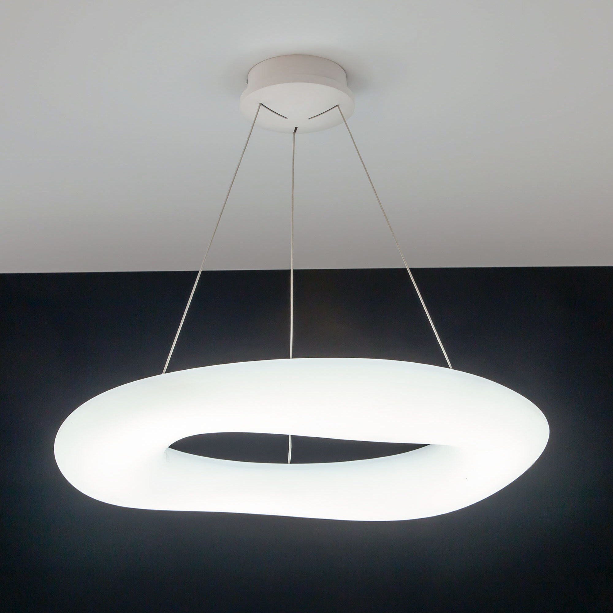 Люстра в форме подвесного кольца, высоту и угол наклона которого можно изменить при помощи регулируемых тросов. Корпус изготовлен из белого ударопрочного полимера, рассеиватель оптический полимер, цвет белый матовый. Крепление люстры подходит для всех типов потолков, в том числе натяжных. Тип крепления – планка. Суммарная мощность светильника 130Вт, что равно 1300Вт ламп накаливания. Световой поток 11500Лм. Свет без мерцаний и пульсаций с высоким качеством цветопередачи (CRI > 85).