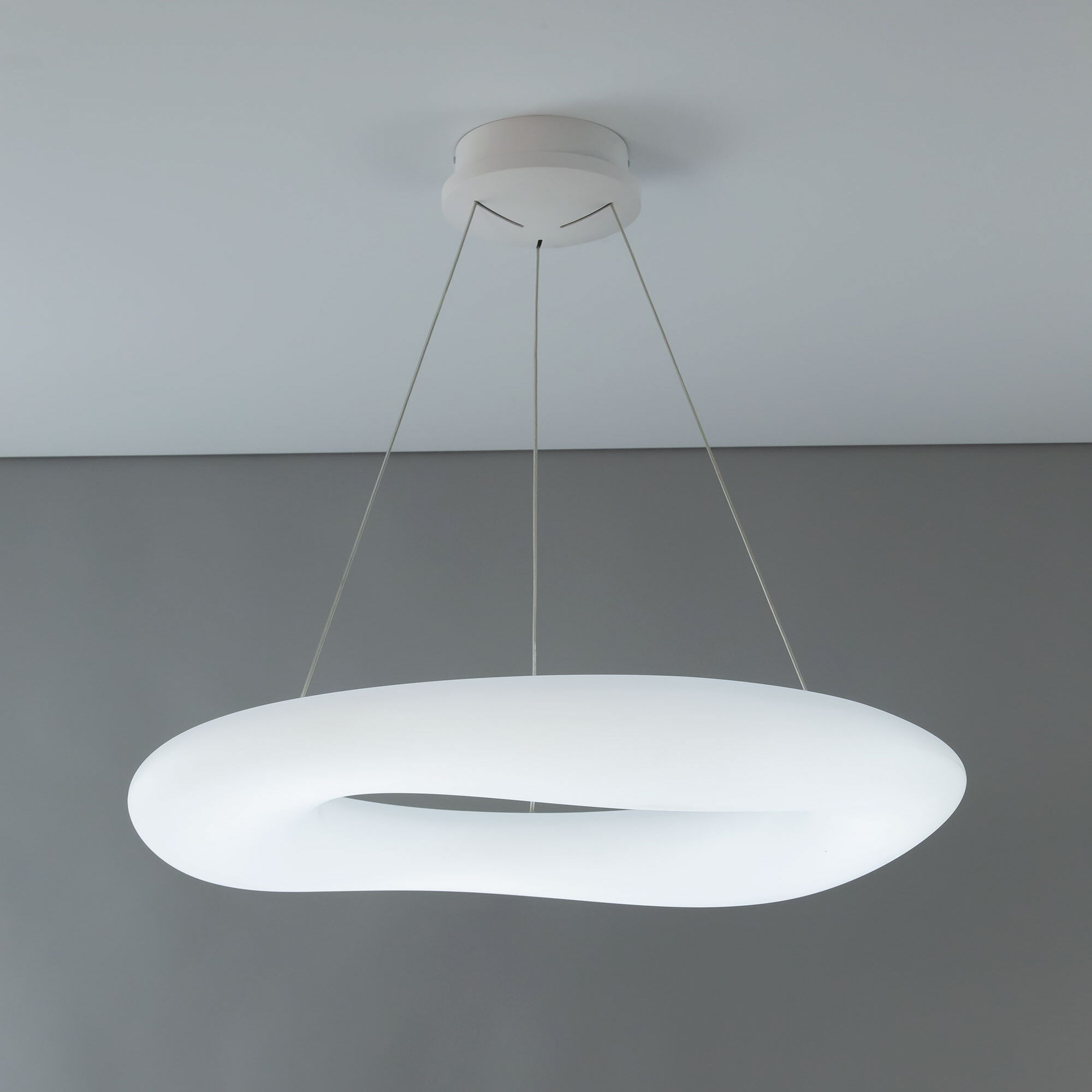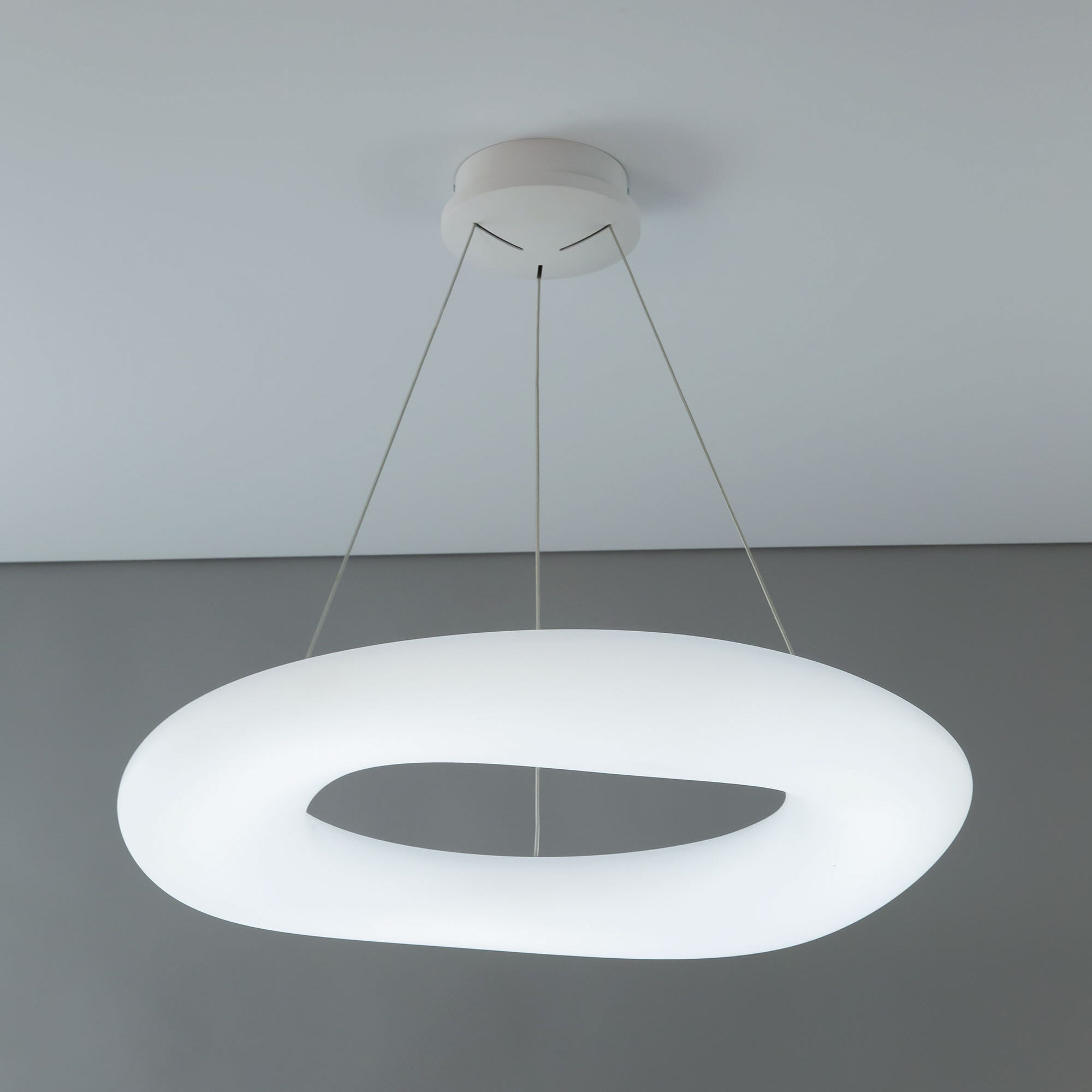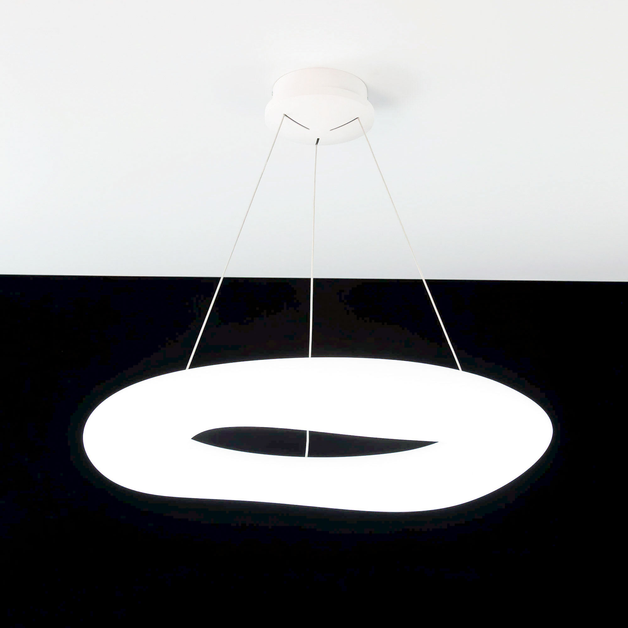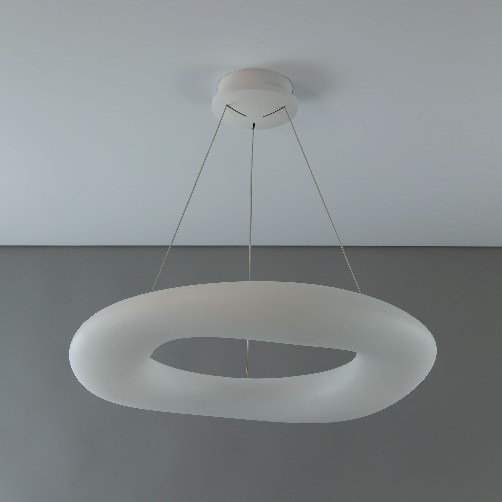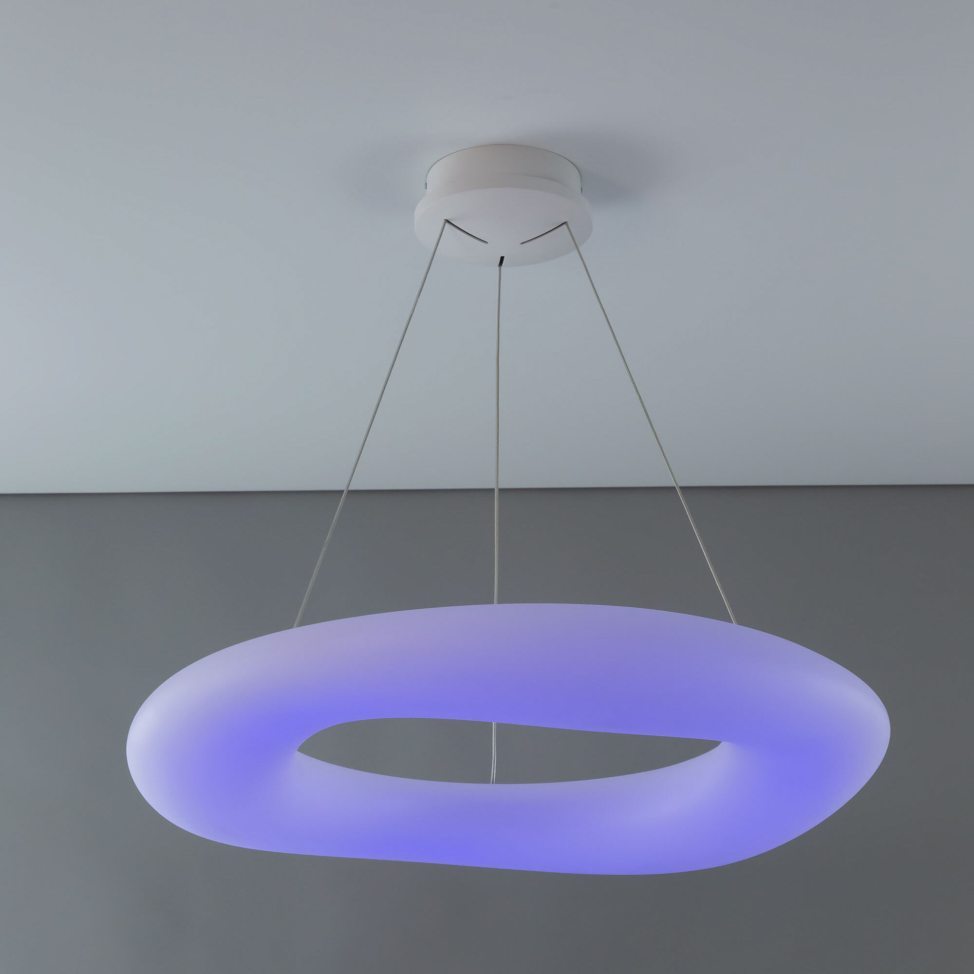Люстра в форме подвесного кольца, высоту и угол наклона которого можно изменить при помощи регулируемых тросов. Корпус изготовлен из белого ударопрочного полимера, рассеиватель оптический полимер, цвет белый матовый. Крепление люстры подходит для всех типов потолков, в том числе натяжных. Тип крепления – планка. Суммарная мощность светильника 130Вт, что равно 1300Вт ламп накаливания. Световой поток 11500Лм. Свет без мерцаний и пульсаций с высоким качеством цветопередачи (CRI > 85).