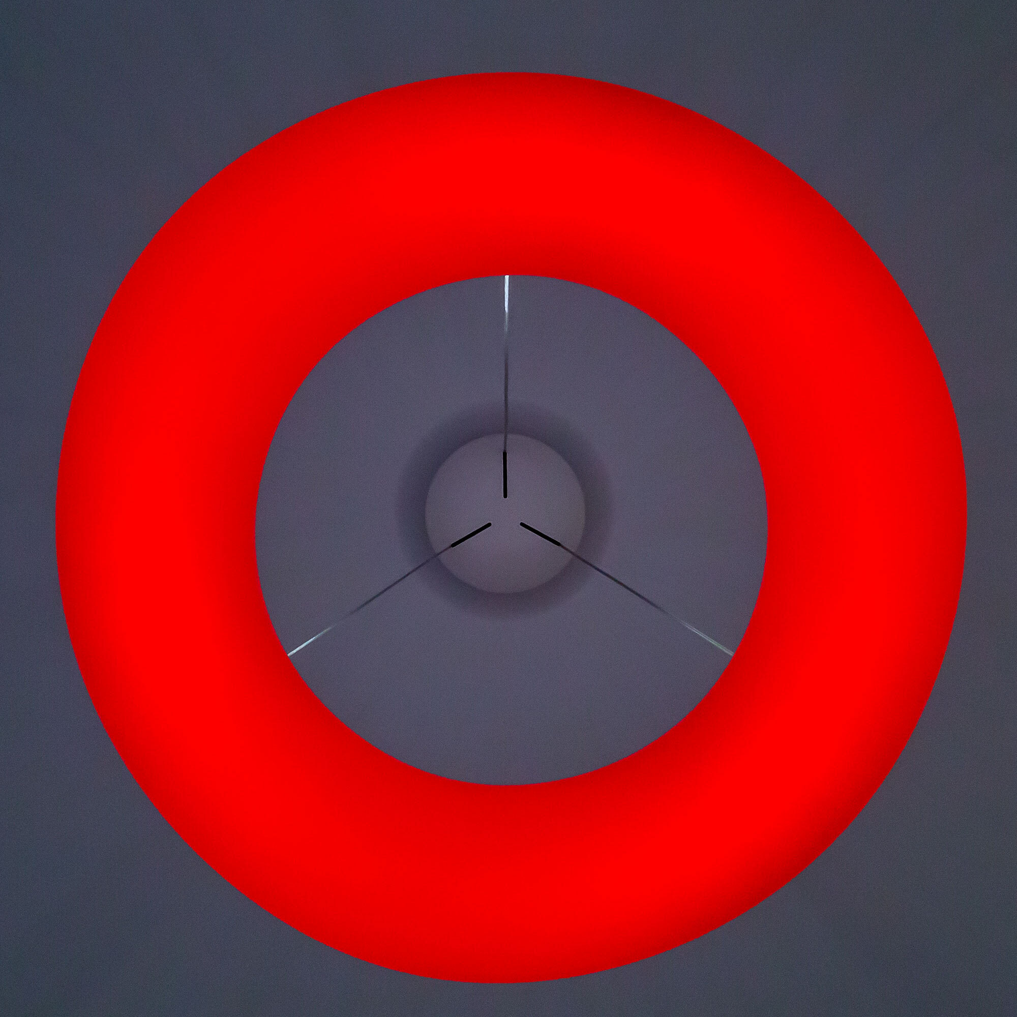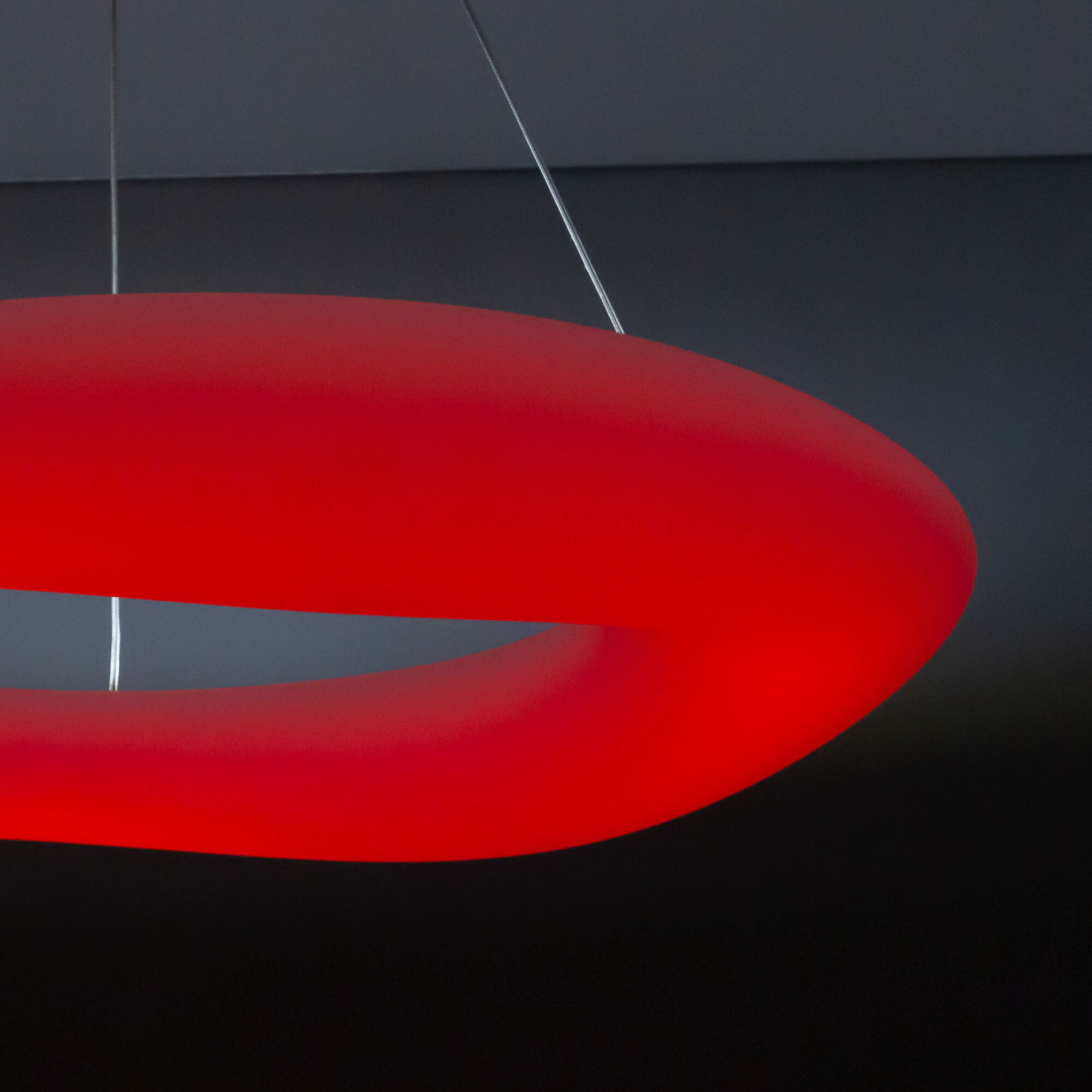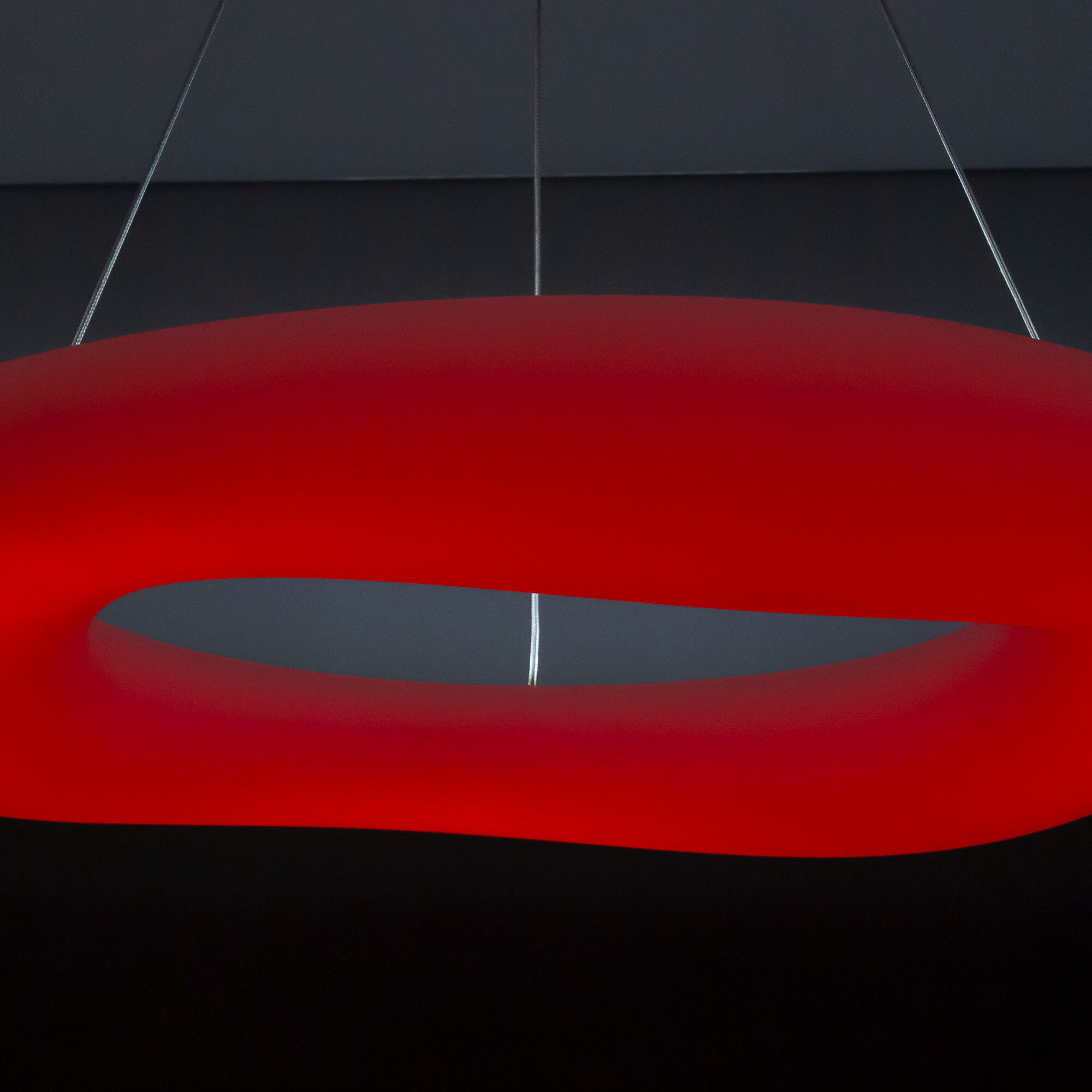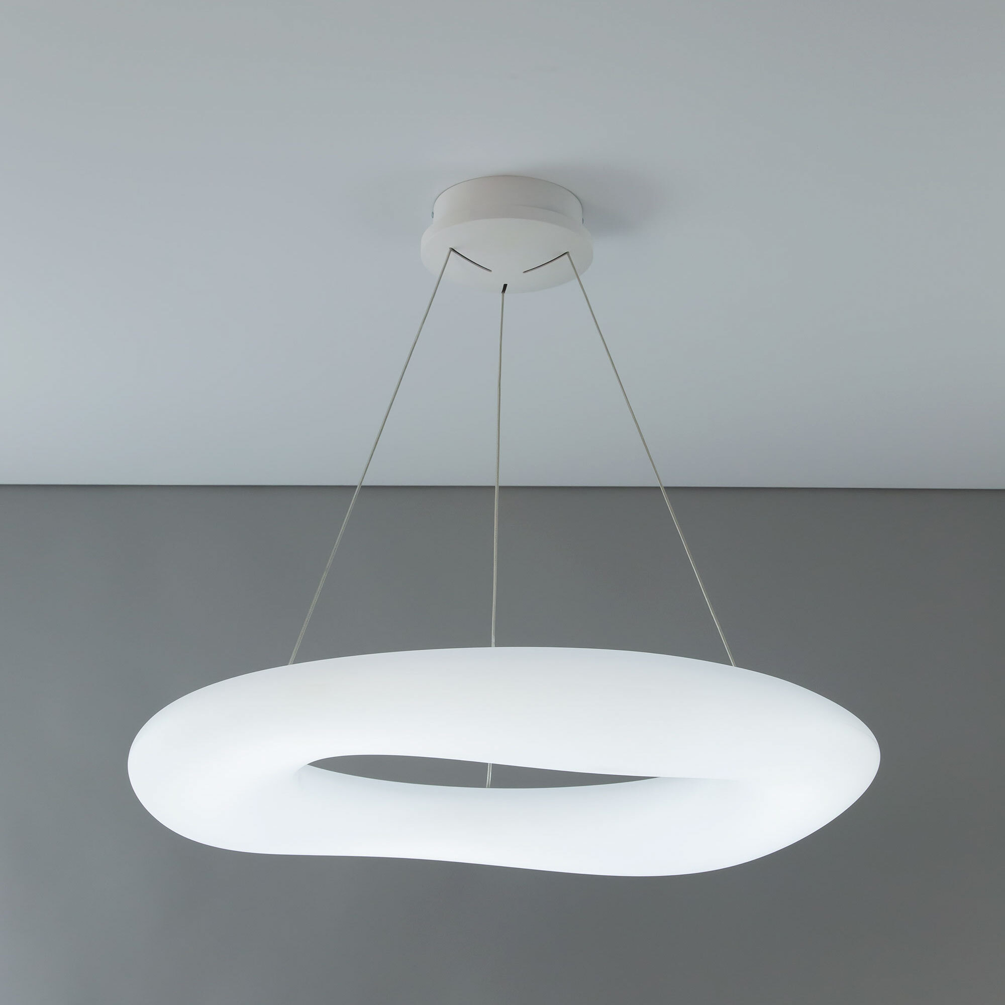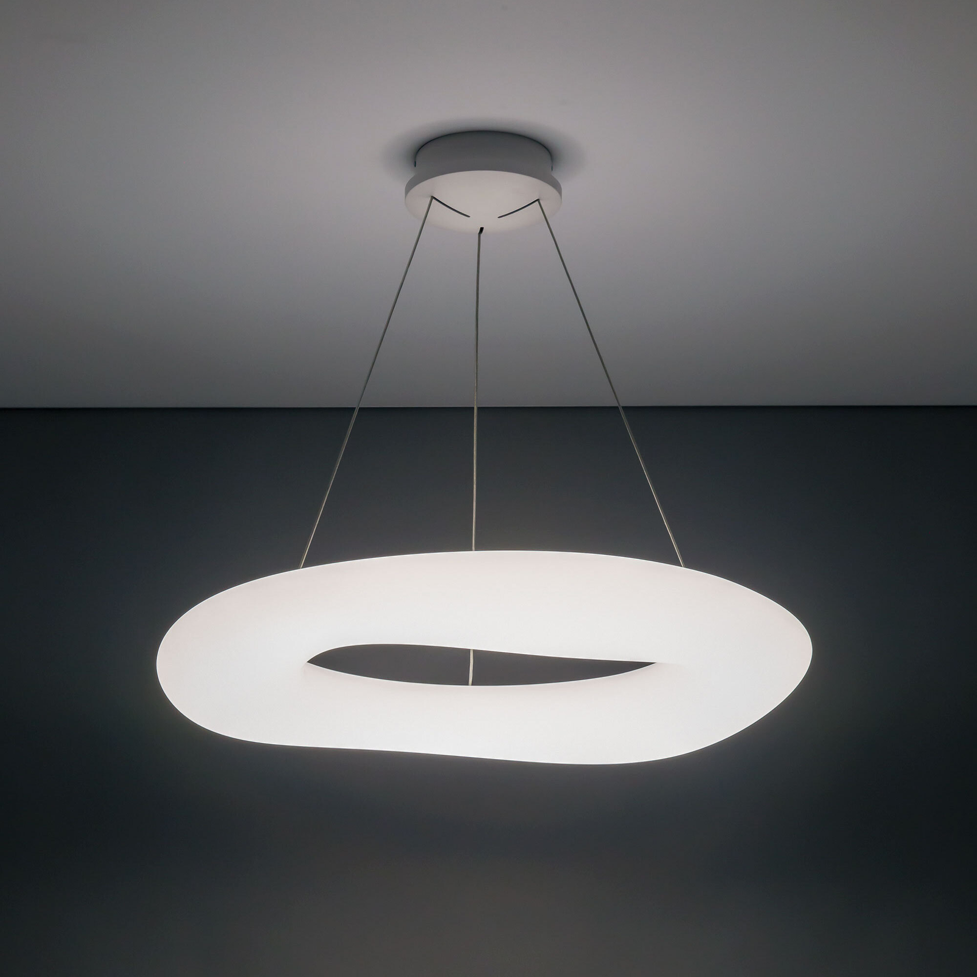Люстра в форме подвесного кольца, высоту и угол наклона которого можно изменить при помощи регулируемых тросов. Корпус изготовлен из белого ударопрочного полимера, рассеиватель оптический полимер, цвет белый матовый. Крепление люстры подходит для всех типов потолков, в том числе натяжных. Тип крепления – планка. Суммарная мощность светильника 130Вт, что равно 1300Вт ламп накаливания. Световой поток 11500Лм. Свет без мерцаний и пульсаций с высоким качеством цветопередачи (CRI > 85).