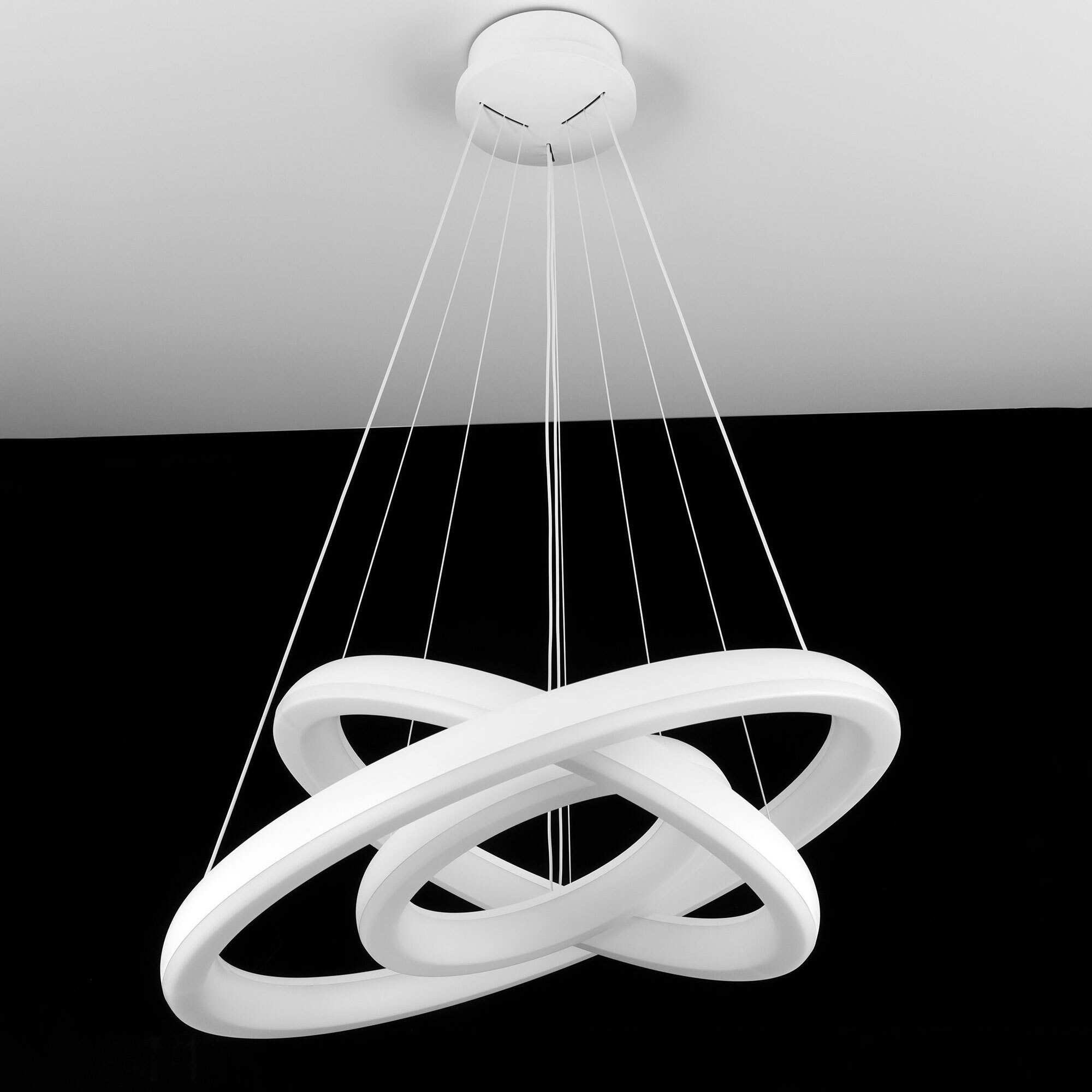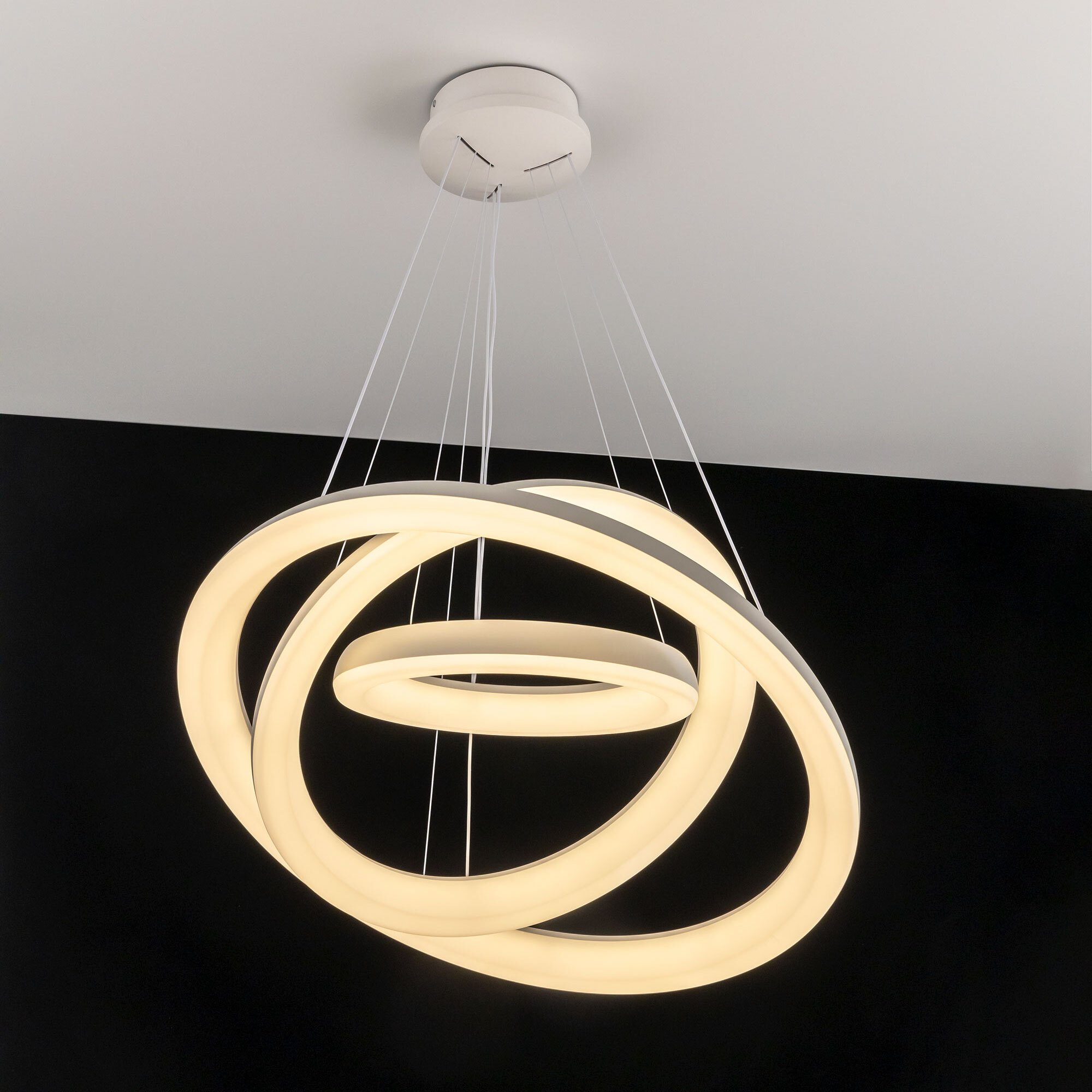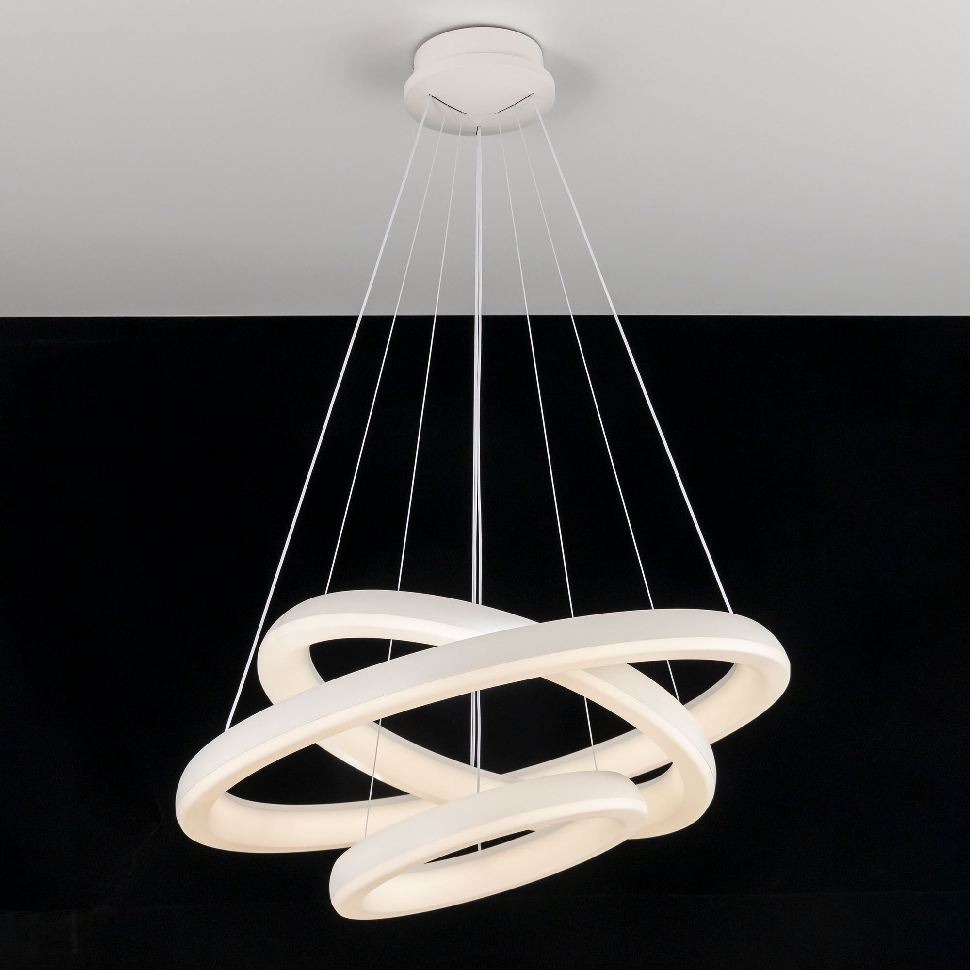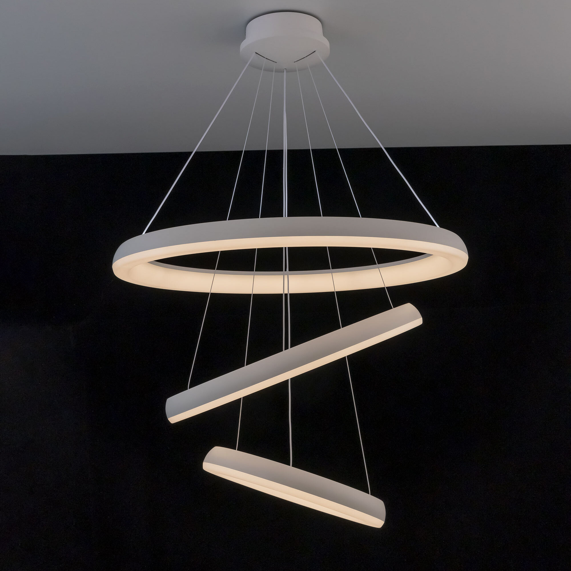 Люстра на тросах в форме каскада из трех подвесных колец, высоту и угол наклона каждого из которых можно изменить. Корпус изготовлен из прочного полимера, рассеиватель оптический полимер, цвет белый матовый. Крепление люстры подходит для всех типов потолков, в том числе натяжных. Тип крепления – планка. Суммарная мощность светильника 170Вт, световой поток 12500Лм.