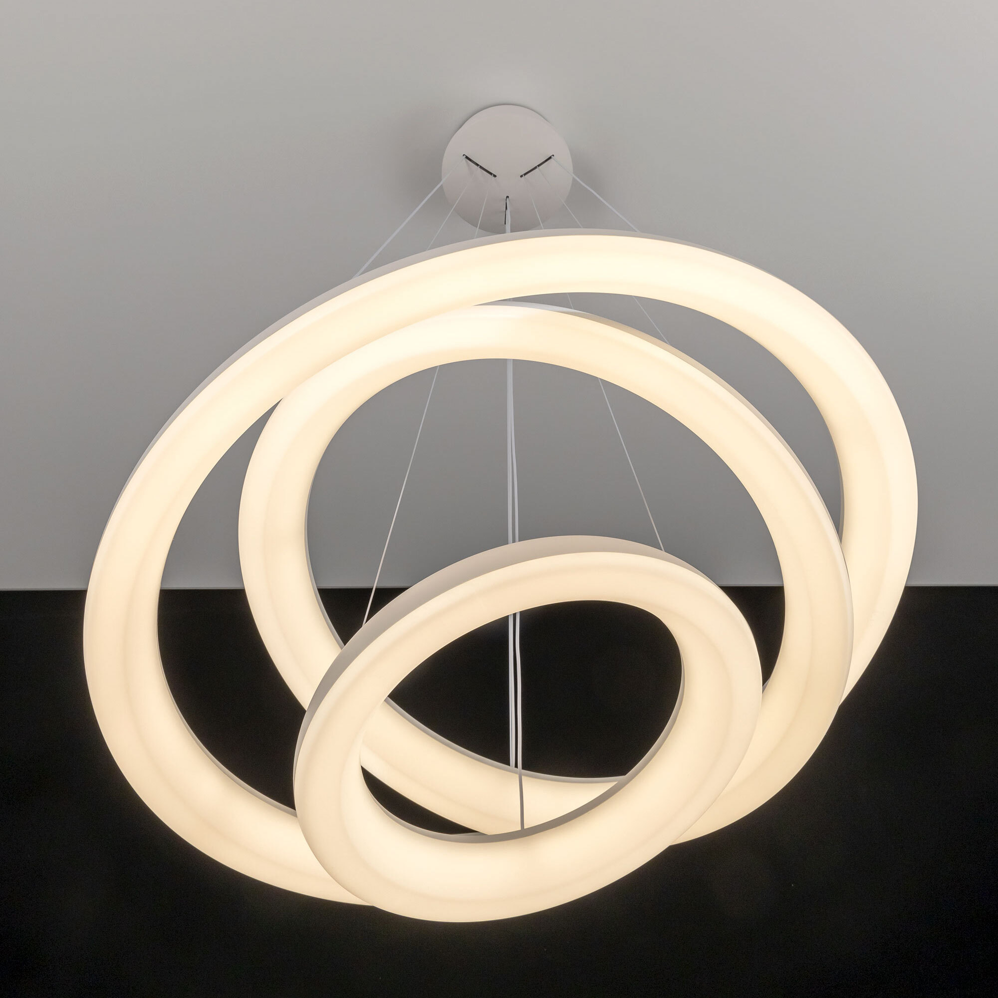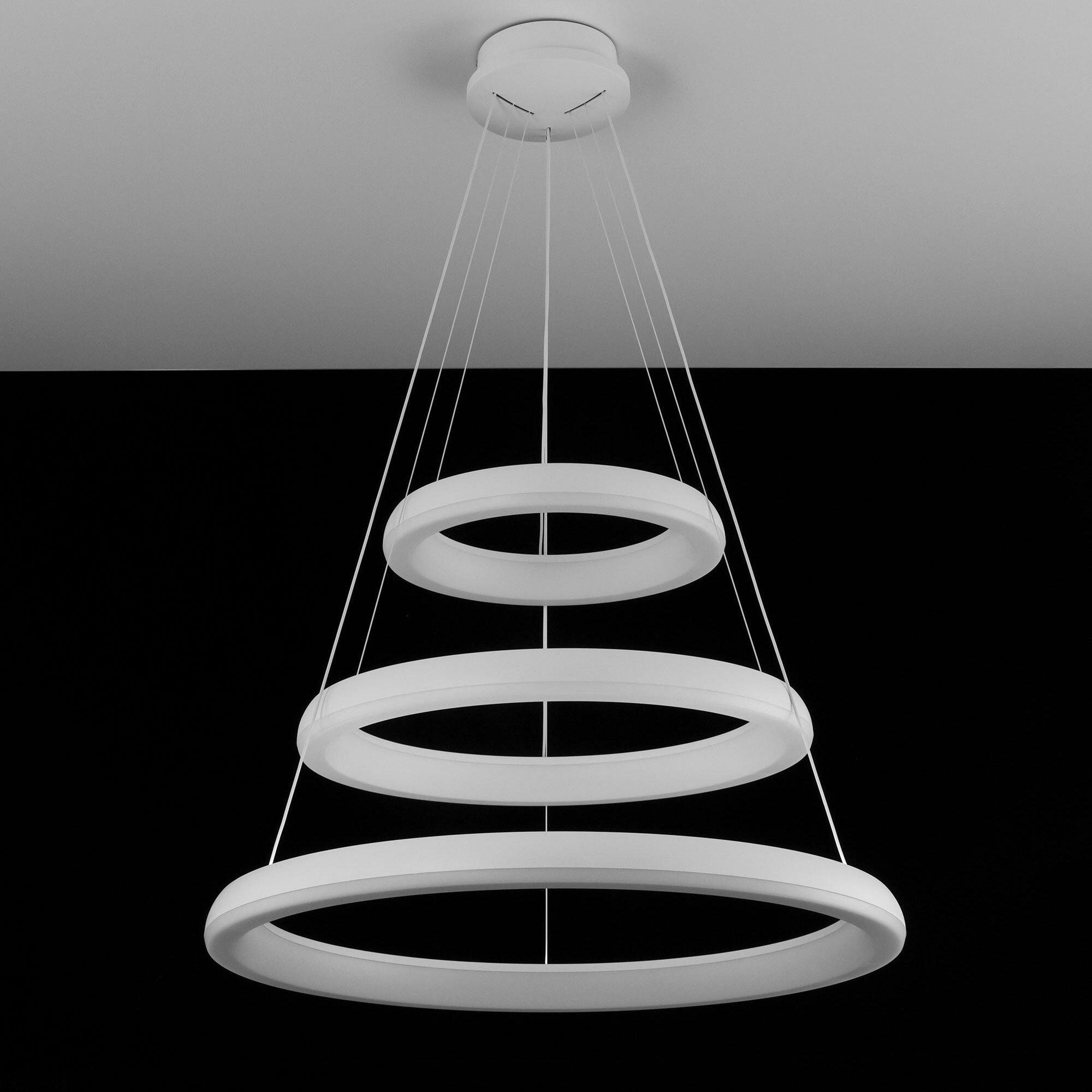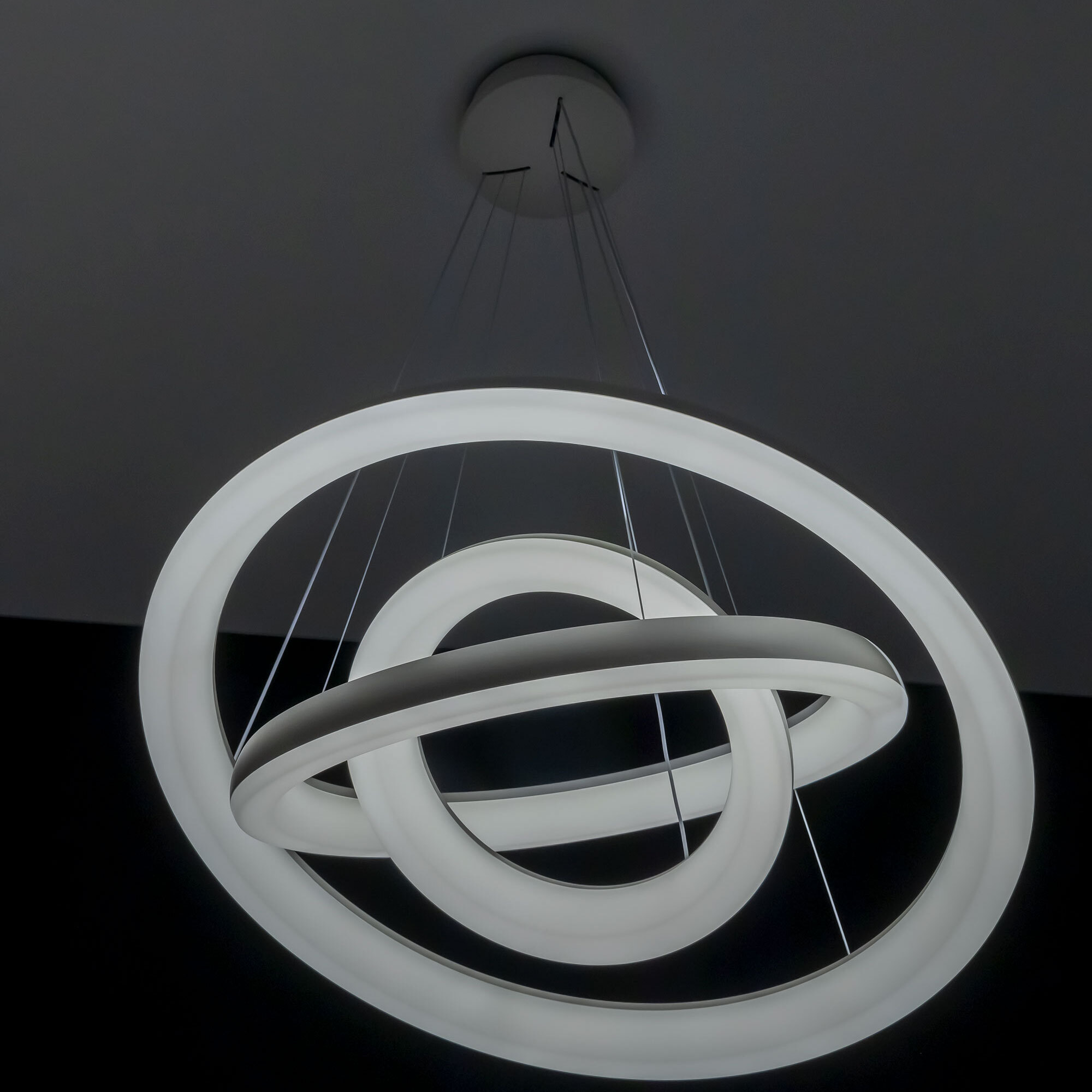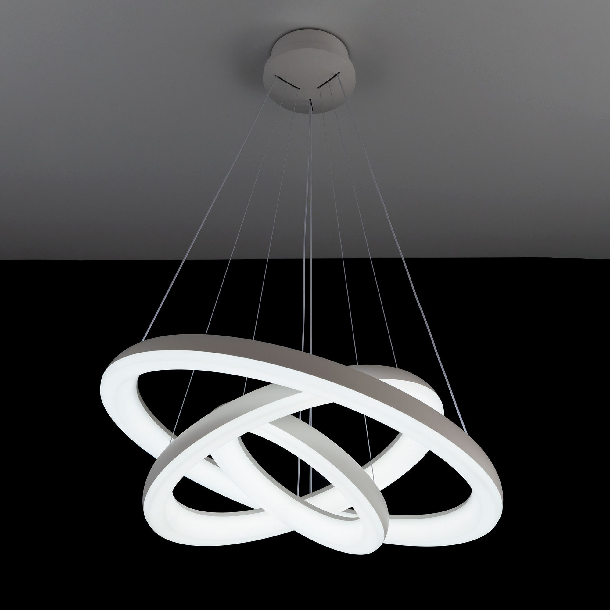 Люстра на тросах в форме каскада из трех подвесных колец, высоту и угол наклона каждого из которых можно изменить. Корпус изготовлен из прочного полимера, рассеиватель оптический полимер, цвет белый матовый. Крепление люстры подходит для всех типов потолков, в том числе натяжных. Тип крепления – планка. Суммарная мощность светильника 170Вт, световой поток 12500Лм.