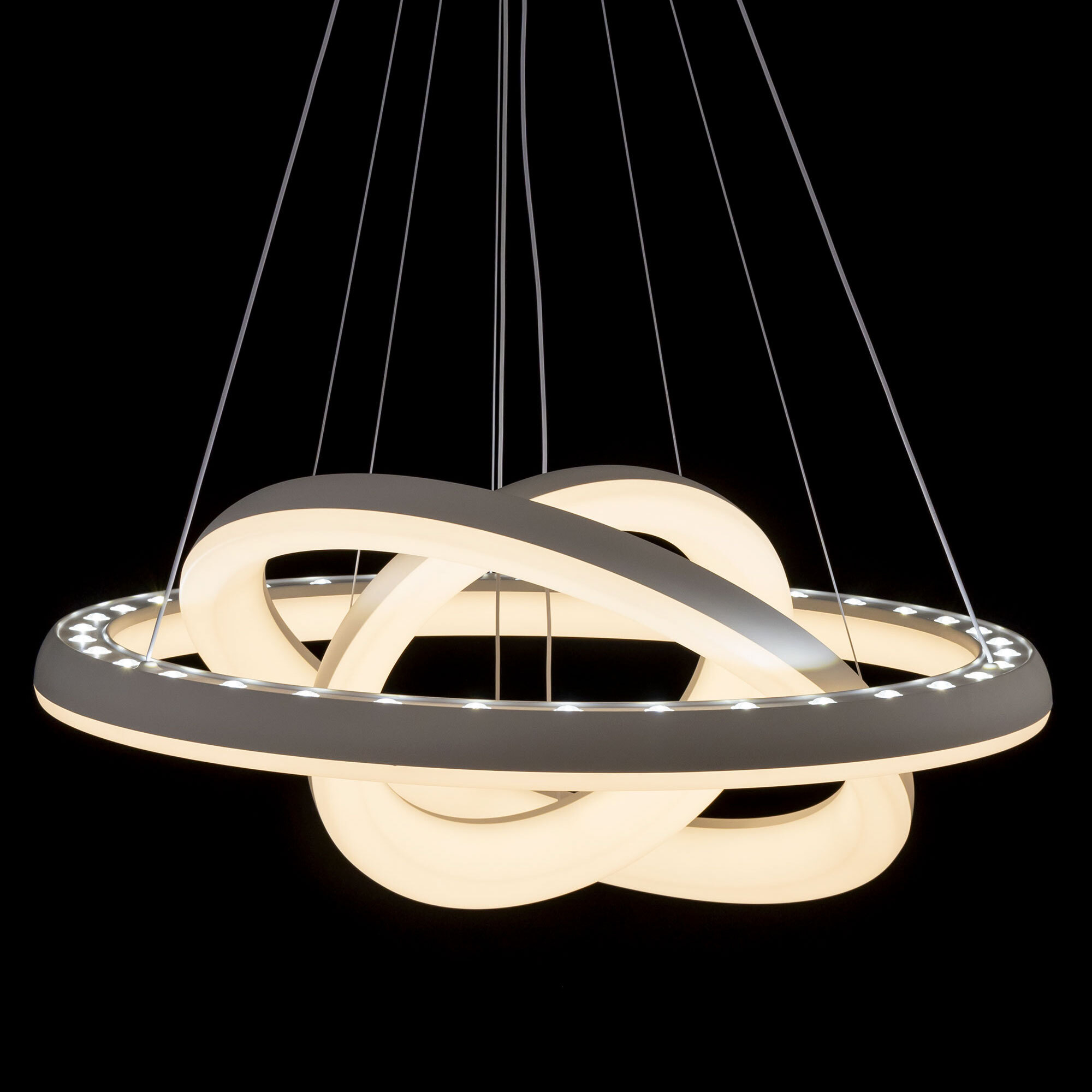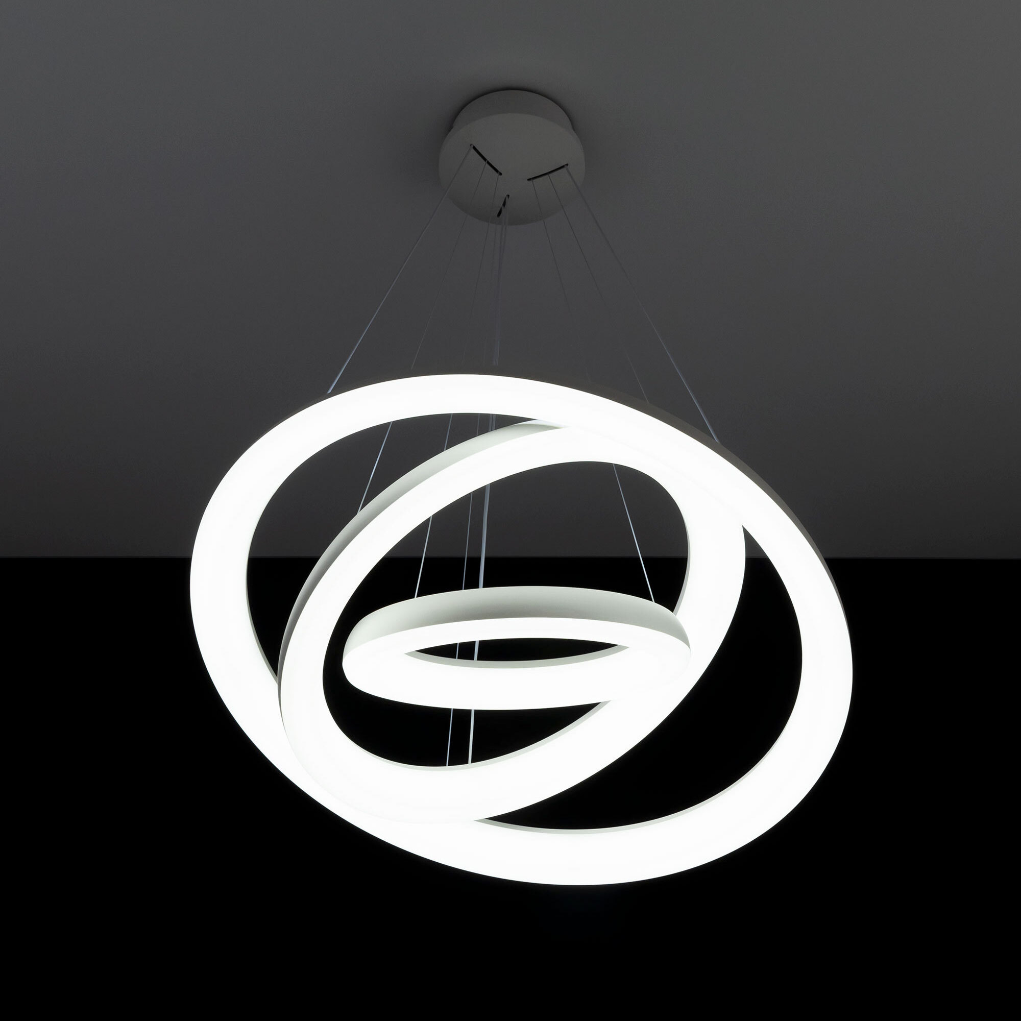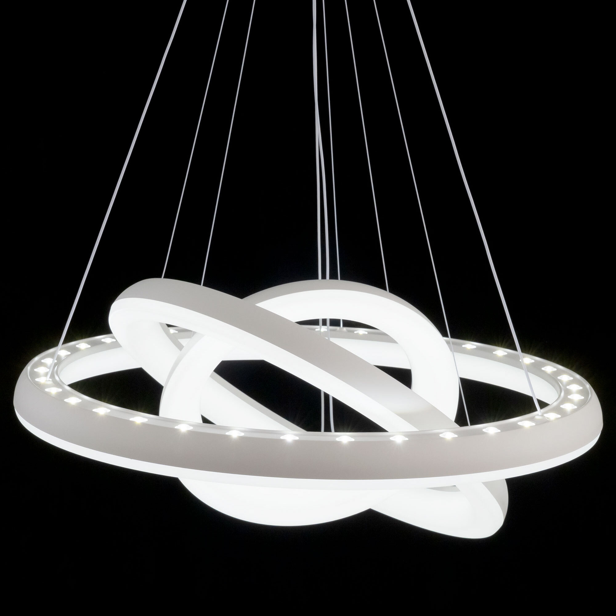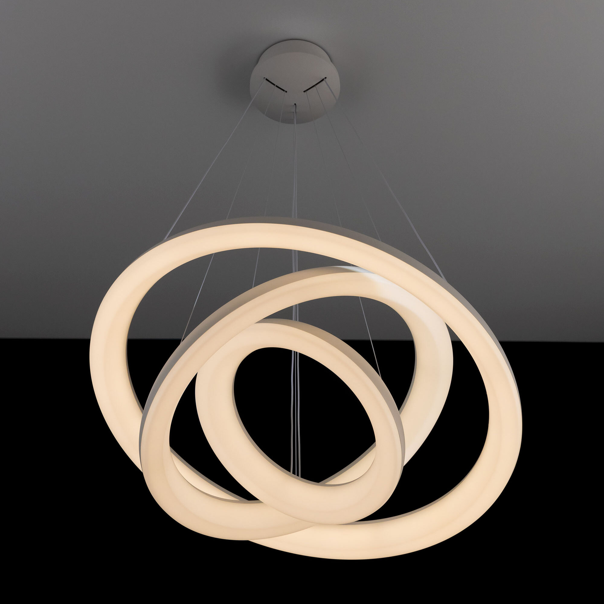 Люстра на тросах в форме каскада из трех подвесных колец, высоту и угол наклона каждого из которых можно изменить. Корпус изготовлен из прочного полимера, рассеиватель оптический полимер, цвет белый матовый. Крепление люстры подходит для всех типов потолков, в том числе натяжных. Тип крепления – планка. Суммарная мощность светильника 170Вт, световой поток 12500Лм.