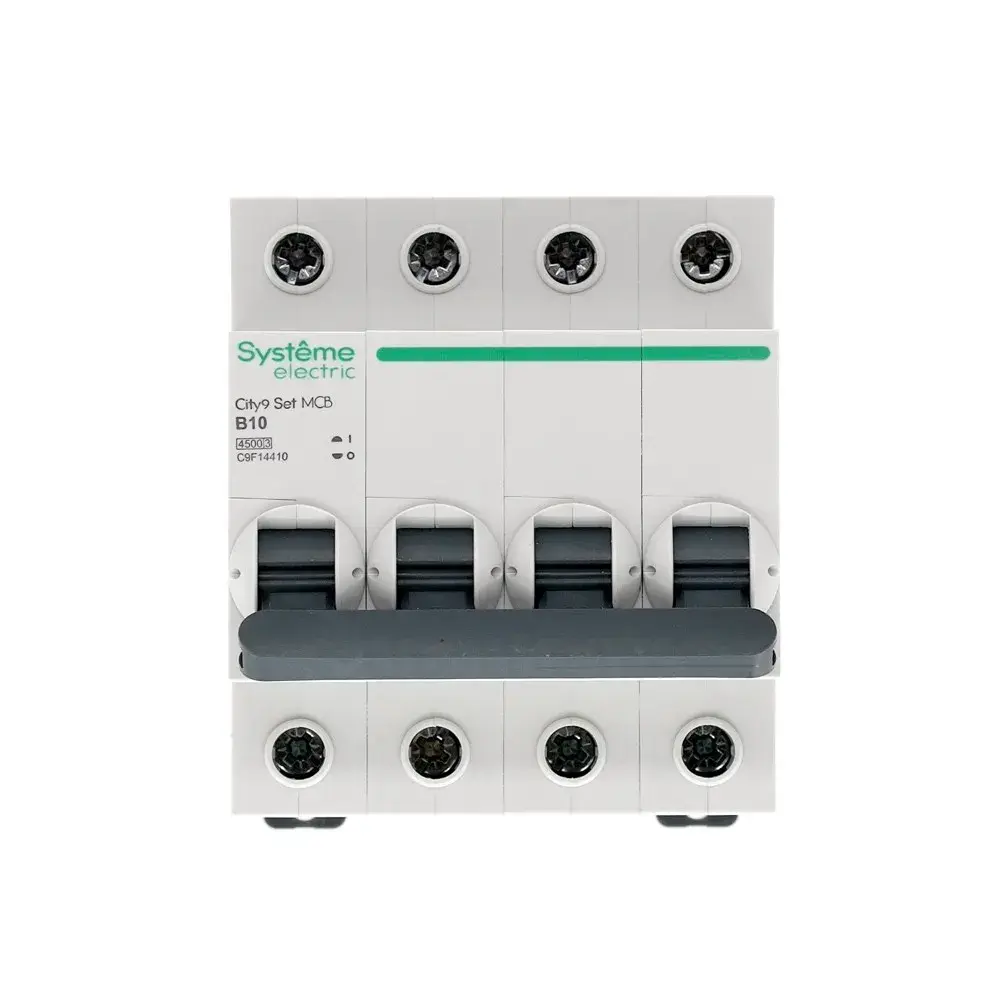Автоматический выключатель серии City9 Set Systeme Electric, 4-полюсный, номинальный ток 10 А, характеристика B, Icn = 4.5 кА. Применяется в электрических сетях напряжением 400 В. Предназначен для защиты от перегрузок и токов короткого замыкания. Оснащен механизмом «мгновенной коммутации». Ударопрочный корпус из специального пластика с 6 металлическими заклепками. Безопасные клеммы исключают попадание кабелей в заклеммное пространство.
