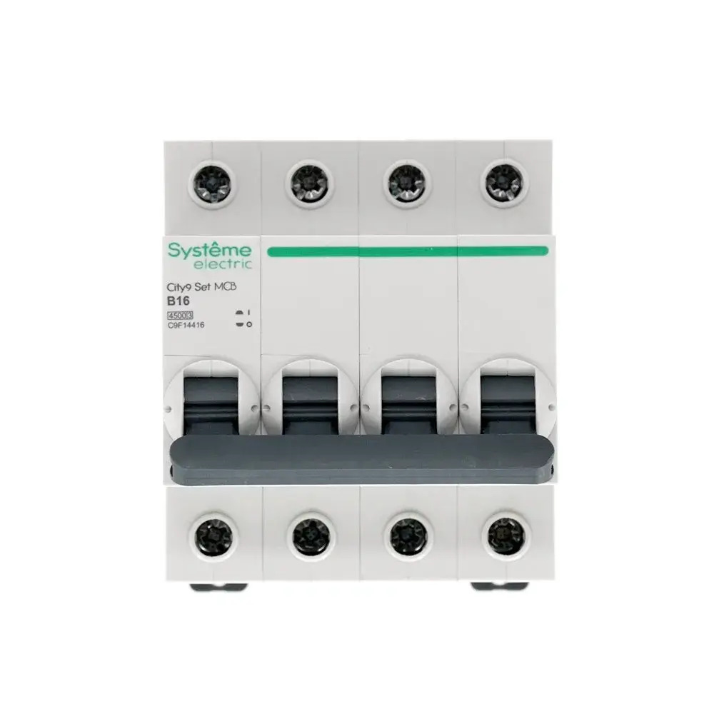 Автоматический выключатель серии City9 Set Systeme Electric, 4-полюсный, номинальный ток 16 А, характеристика B, Icn = 4.5 кА. Применяется в электрических сетях напряжением 400 В. Предназначен для защиты от перегрузок и токов короткого замыкания. Оснащен механизмом «мгновенной коммутации». Ударопрочный корпус из специального пластика с 6 металлическими заклепками. Безопасные клеммы исключают попадание кабелей в заклеммное пространство.