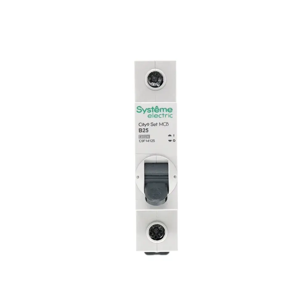 Автоматический выключатель серии City9 Set Systeme Electric, 1-полюсный, номинальный ток 25 А, характеристика B, Icn = 4.5 кА. Применяется в электрических сетях напряжением 230 В. Предназначен для защиты от перегрузок и токов короткого замыкания. Оснащен механизмом «мгновенной коммутации». Ударопрочный корпус из специального пластика с 6 металлическими заклепками. Безопасные клеммы исключают попадание кабелей в заклеммное пространство.