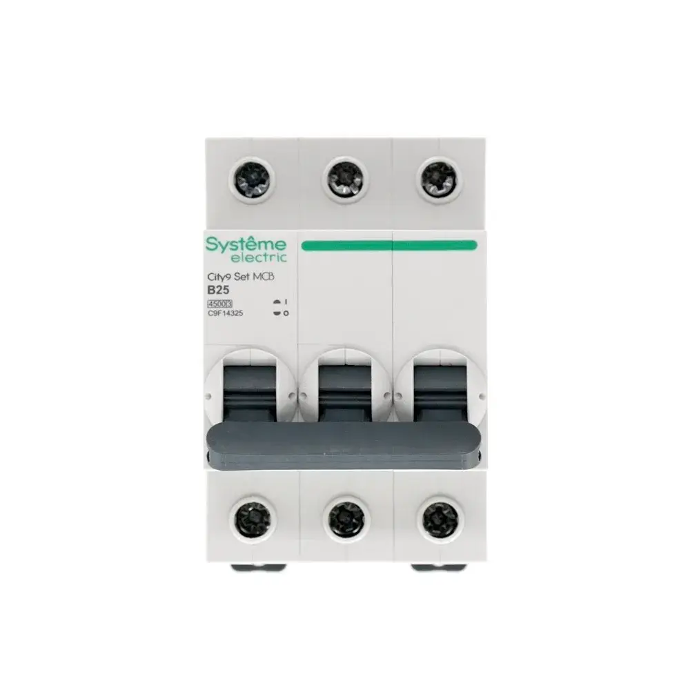 Автоматический выключатель серии City9 Set Systeme Electric, 3-полюсный, номинальный ток 25 А, характеристика B, Icn = 4.5 кА. Применяется в электрических сетях напряжением 400 В. Предназначен для защиты от перегрузок и токов короткого замыкания. Оснащен механизмом «мгновенной коммутации». Ударопрочный корпус из специального пластика с 6 металлическими заклепками. Безопасные клеммы исключают попадание кабелей в заклеммное пространство.