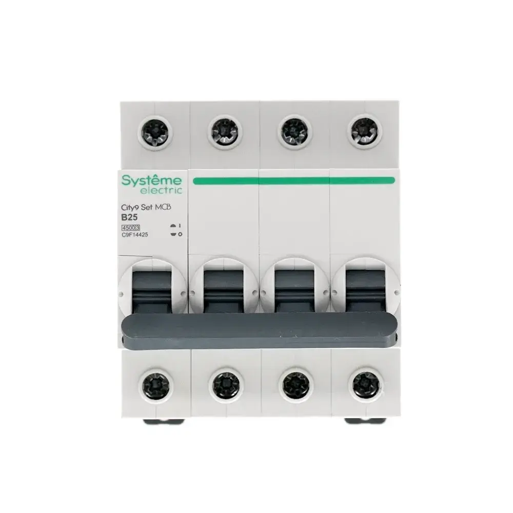 Автоматический выключатель серии City9 Set Systeme Electric, 4-полюсный, номинальный ток 25 А, характеристика B, Icn = 4.5 кА. Применяется в электрических сетях напряжением 400 В. Предназначен для защиты от перегрузок и токов короткого замыкания. Оснащен механизмом «мгновенной коммутации». Ударопрочный корпус из специального пластика с 6 металлическими заклепками. Безопасные клеммы исключают попадание кабелей в заклеммное пространство.