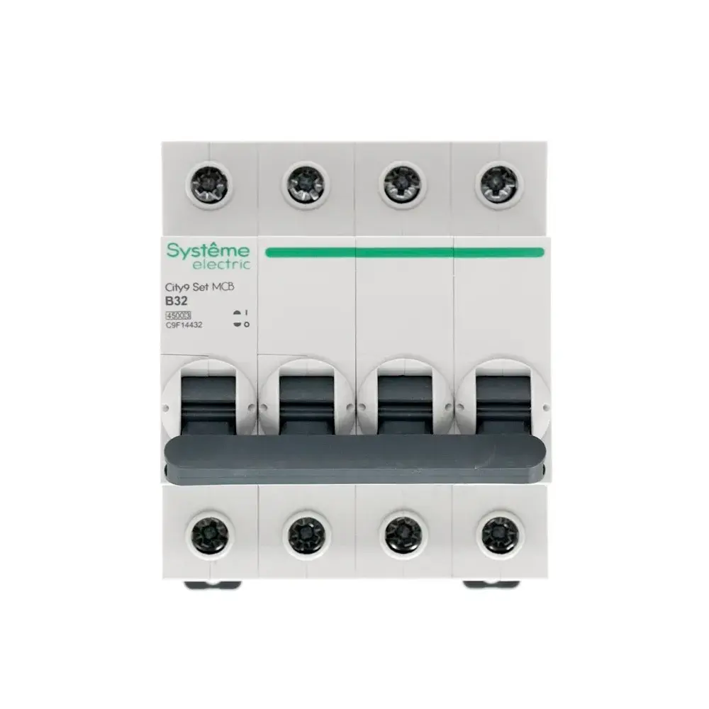 Автоматический выключатель серии City9 Set Systeme Electric, 4-полюсный, номинальный ток 32 А, характеристика B, Icn = 4.5 кА. Применяется в электрических сетях напряжением 400 В. Предназначен для защиты от перегрузок и токов короткого замыкания. Оснащен механизмом «мгновенной коммутации». Ударопрочный корпус из специального пластика с 6 металлическими заклепками. Безопасные клеммы исключают попадание кабелей в заклеммное пространство.