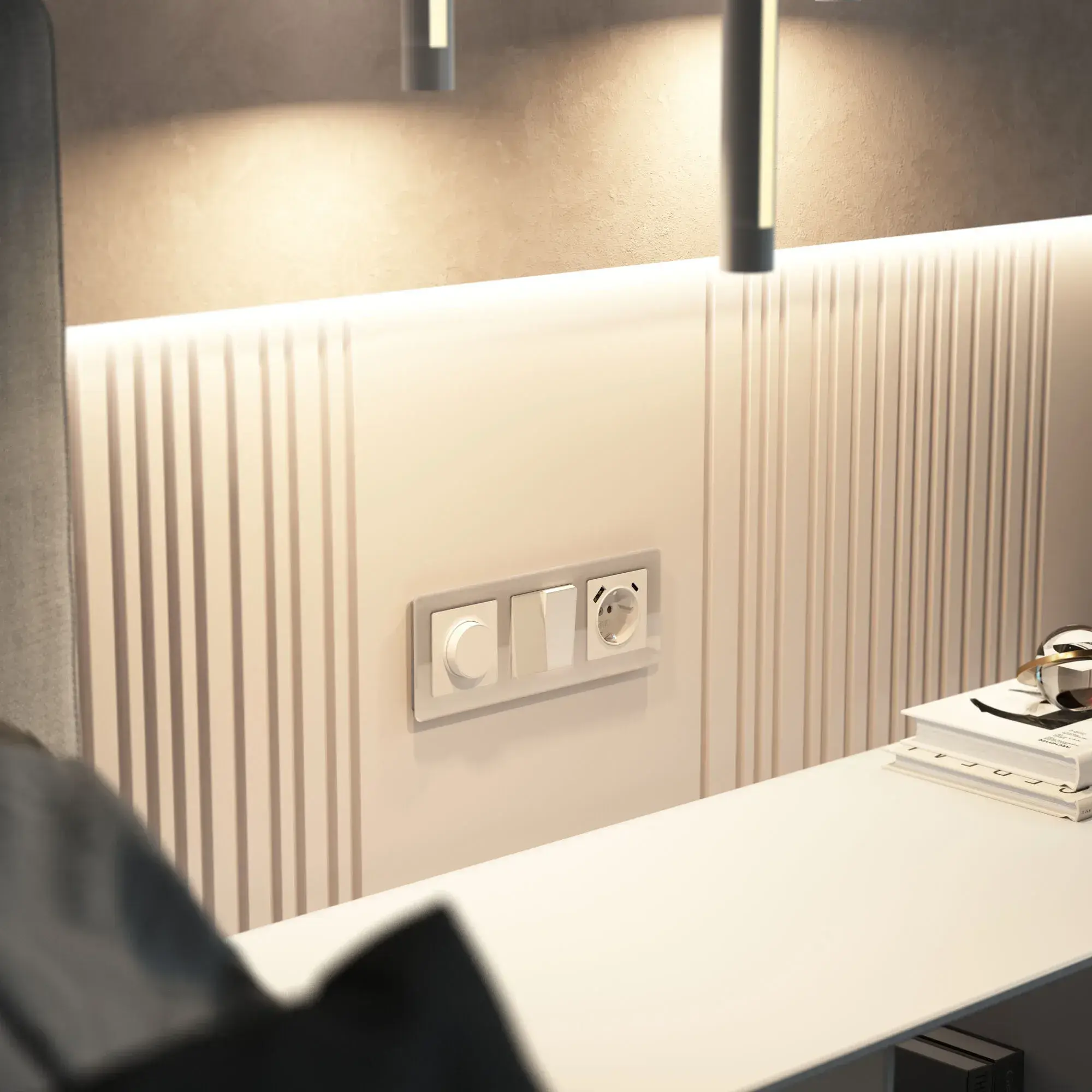 Диммер от Werkel подключается в разрыв цепи как обычный выключатель или по схеме проходного выключателя. Он позволяет заменить обычные или проходные выключатели без необходимости перекладки проводки. Механизм устройства позволяет плавно регулировать уровень освещенности в помещении. Включение и выключение света происходят при нажатии на кнопку, а изменение яркости и интенсивности света — при помощи поворотной кнопки. Диммер встраиваемой серии Werkel совместим со светодиодными диммируемыми лампами, галогенными лампами и лампами накаливания. Также он может использоваться вместе с проходным выключателем. Для стабильной работы диммера рекомендуется оставлять запас мощности около 15%, то есть при максимальной мощности 600 ватт, запас должен составлять примерно 90 ватт. Для светодиодных диммируемых ламп, при максимальной мощности 200 ватт, запас составит около 30 ватт.