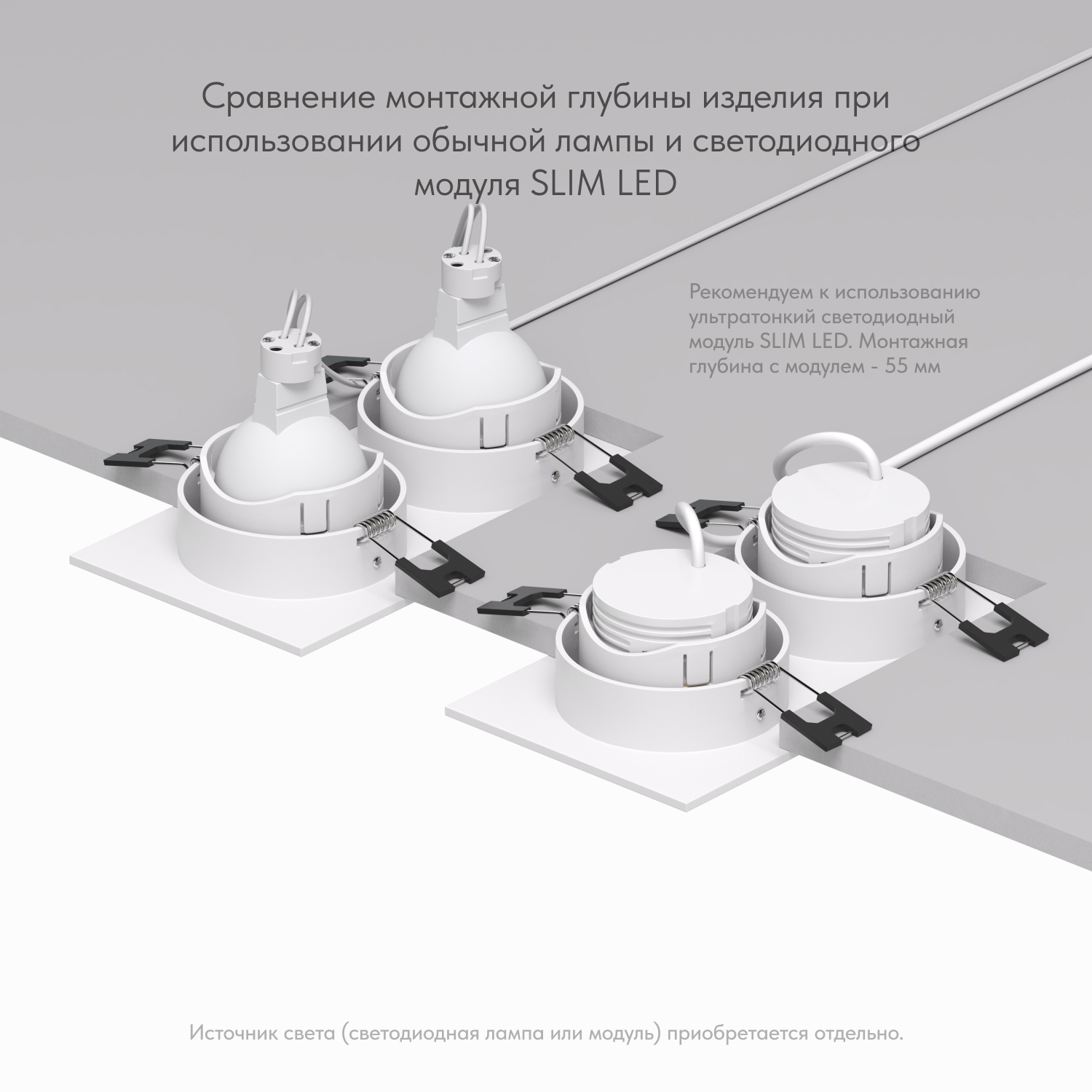 Серия встраиваемых поворотных светильников под сменную лампу из термостойкого полимера, обладающего низкой теплопроводностью. Отличительная особенность серии – рельефный рефлектор, в углублении которого располагается сменная светодиодная лампа. Серия насчитывает большое количество оригинальных цветовых сочетаний на любой вкус. Благодаря лампе, расположенной в углублении корпуса, существенно снижается слепящий эффект. Модель универсальна в своем применении. Светильники из полимера используются только со светодиодными источниками света. Лампа в комплект не входит. Для данной серии рекомендуем ультратонкие модули SLIM LED в качестве источника света, монтажная глубина всего 55 мм. При использовании светодиодной лампы с цоколем GU5.3 монтажная глубина изделия составит 78 мм. В данной серии также представлены накладные и точечные светильникиСветильник предназначен для использования со светодиодной лампой. Установка ламп другого типа не допускается
