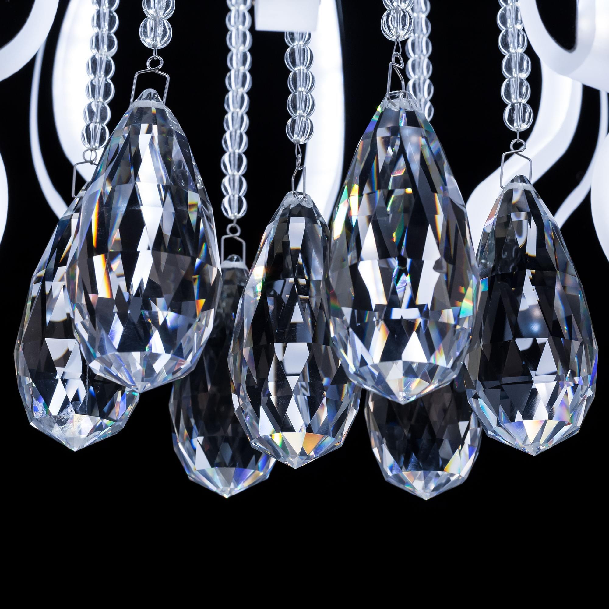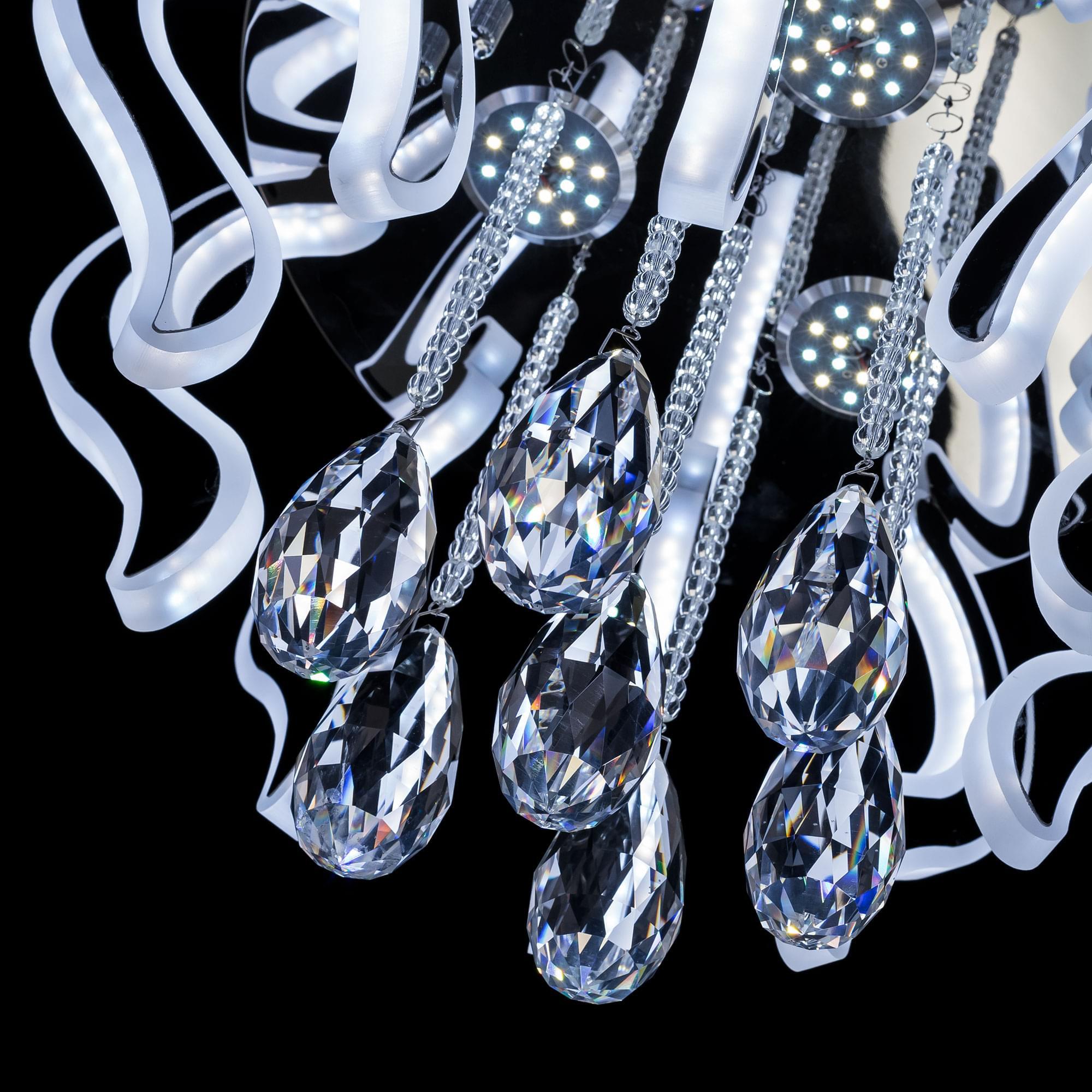Изящная светодиодная люстра Eletto Krown EL334C82.1 выполнена в стиле современной классики. Корпус металлический, основание круглой формы с глянцевым хромированным покрытием. Каждый изогнутый рожок – светодиодный модуль, изготовлен из оптического полимера и декорирован боковыми металлическими накладками. Модель украшают крупные шикарные хрустальные подвески.