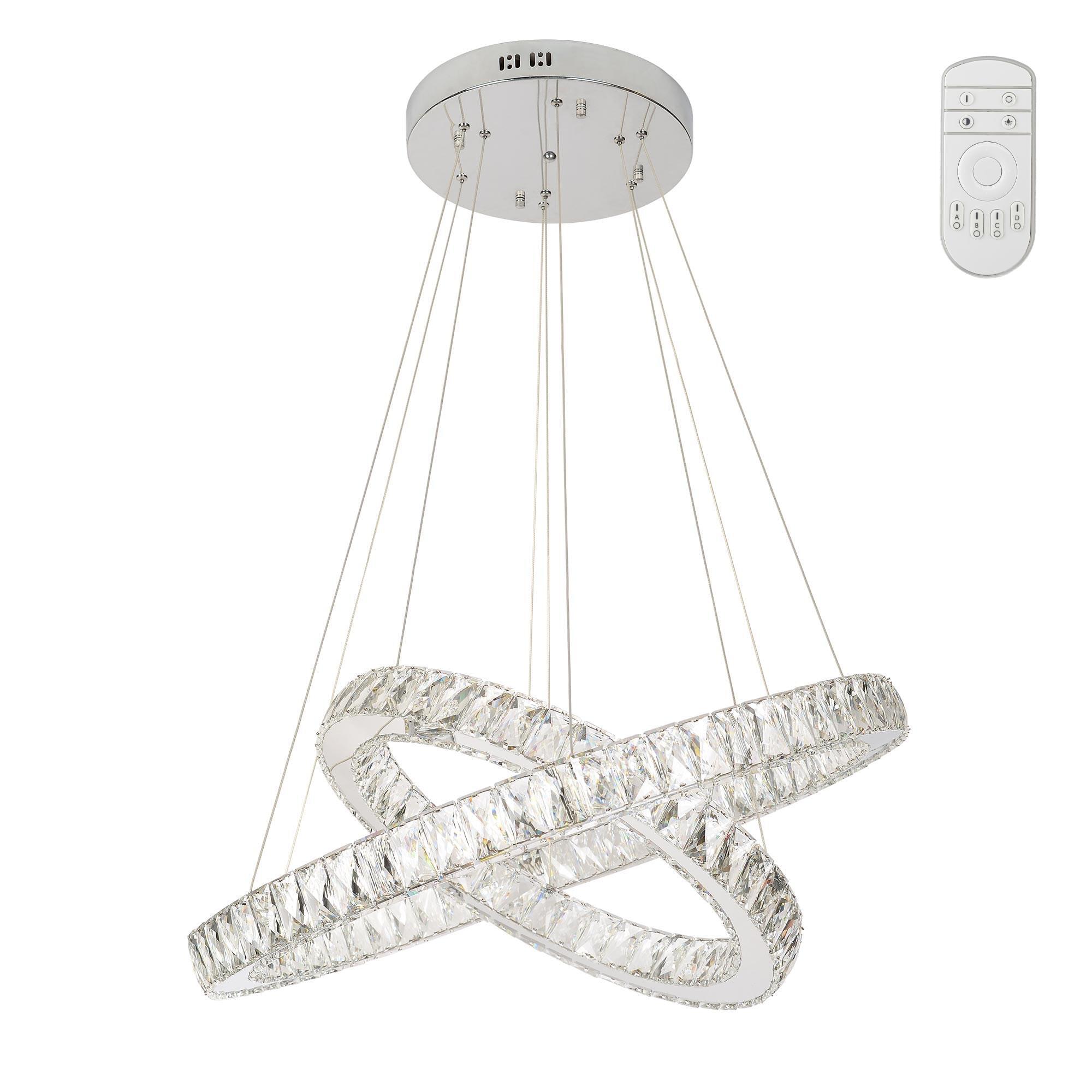 Корпус светильника металлический с глянцевым хромированным покрытием. Два хрустальных кольца, высоту и угол наклона каждого из которых можно легко изменить, изящно подвешены на утончённых стальных тросиках. Высота светильника регулируется при установке в диапазоне от 50см до 1,3м. Источником света являются встроенные светодиоды мощностью 120Вт.