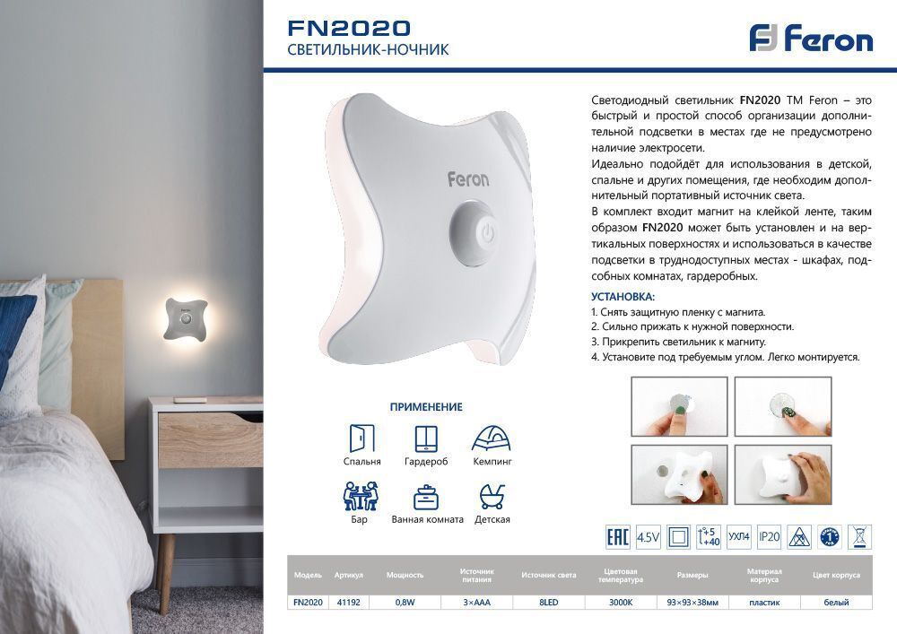 Светильник ночник на магните 8LED , 3*ААА battery 93*93*38мм, FN2020