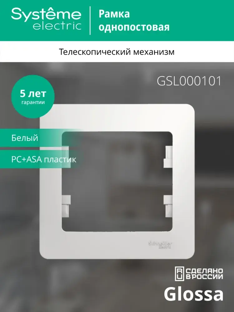 Рамка Systeme Electric (ранее Schneider Electric) серии Glossa (цвет белый) одинарная. - Выполнена из материала PС+ASA, стойкого к УФ-излучению и появлению царапин. - Позволяет гармонично вписать электроустановочное изделие в интерьер помещения.