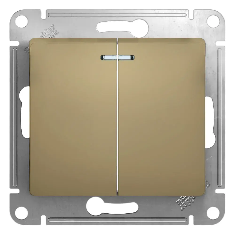 Механизм Systeme Electric (ранее Schneider Electric) серии Glossa (цвет титан) выключателя 2-клавишного c подсветкой подходит для сетей 250 В, на ток 10 А. - Благодаря современной светодиодной подсветке зеленого цвета изделие легко найти в темноте. - Двухклавишный выключатель позволяет управлять двумя источниками света с одной точки. - Выполнен из материала PС+ASA, стойкого к УФ-излучению и появлению царапин. - Эргономичные клеммы расположены в два ряда: сверху и снизу.