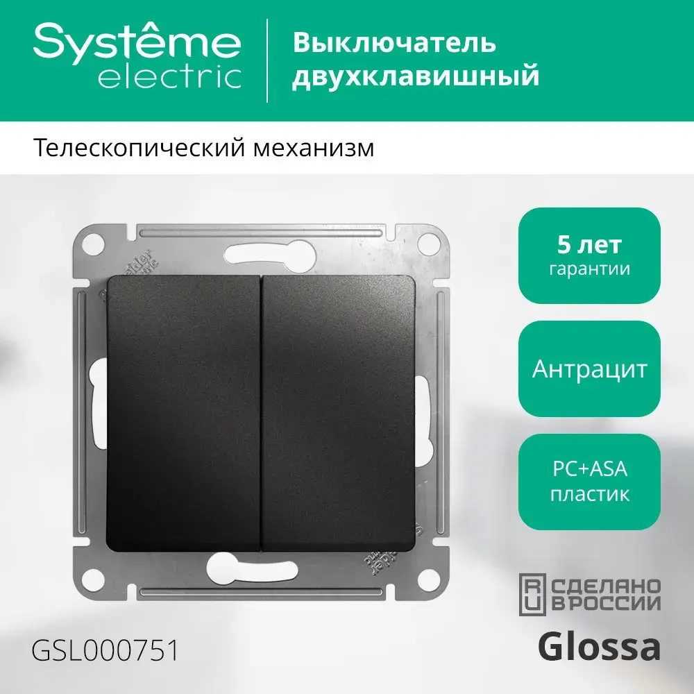 Механизм Systeme Electric (ранее Schneider Electric) серии Glossa (цвет антрацит) выключателя 2-клавишного подходит для сетей 250 В, на ток 10 А. - Двухклавишный выключатель позволяет управлять двумя источниками света с одной точки. - Выполнен из материала PС+ASA, стойкого к УФ-излучению и появлению царапин. - Эргономичные клеммы расположены в два ряда: сверху и снизу.