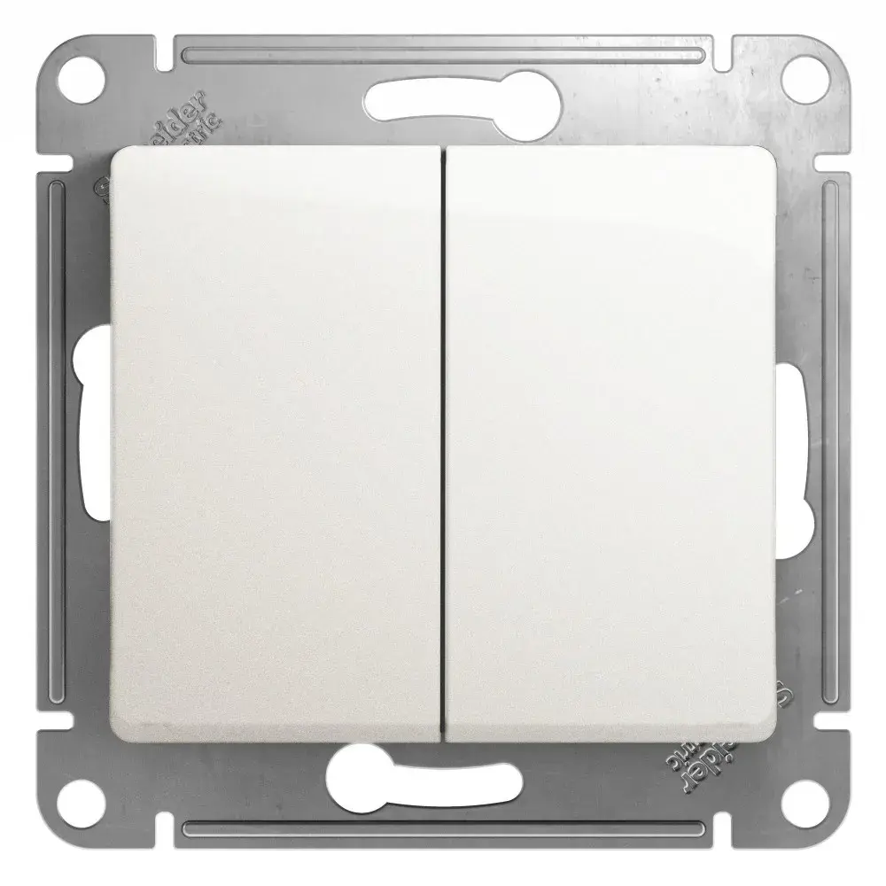 Механизм Systeme Electric (ранее Schneider Electric) серии Glossa (цвет перламутр) выключателя 2-клавишного подходит для сетей 250 В, на ток 10 А. - Двухклавишный выключатель позволяет управлять двумя источниками света с одной точки. - Выполнен из материала PС+ASA, стойкого к УФ-излучению и появлению царапин. - Эргономичные клеммы расположены в два ряда: сверху и снизу.