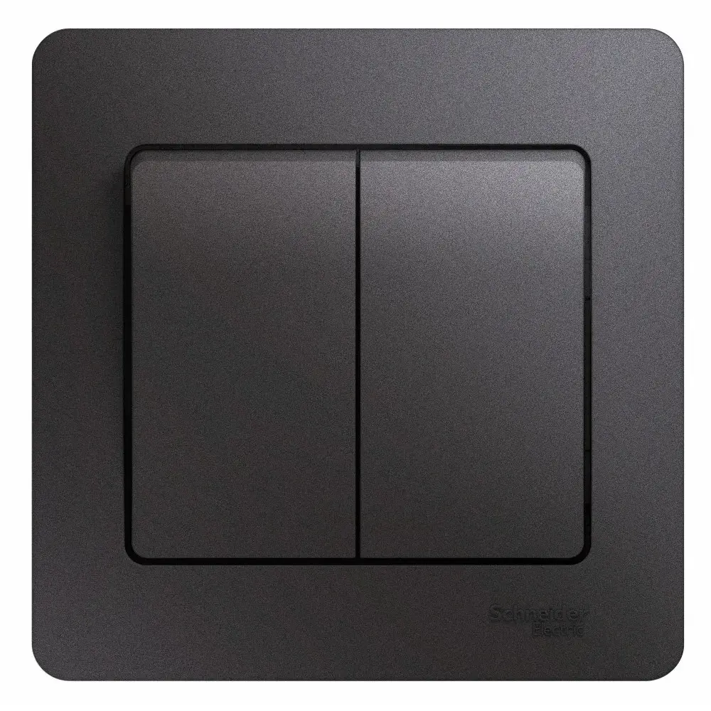 Выключатель Systeme Electric (ранее Schneider Electric) серии Glossa (в сборе, цвет графит) двухклавишный подходит для сетей 250 В, на ток 10 А. - Двухклавишный выключатель позволяет управлять двумя источниками света с одной точки. - Выполнен из материала PС+ASA, стойкого к УФ-излучению и появлению царапин. - Эргономичные клеммы расположены в два ряда: сверху и снизу.