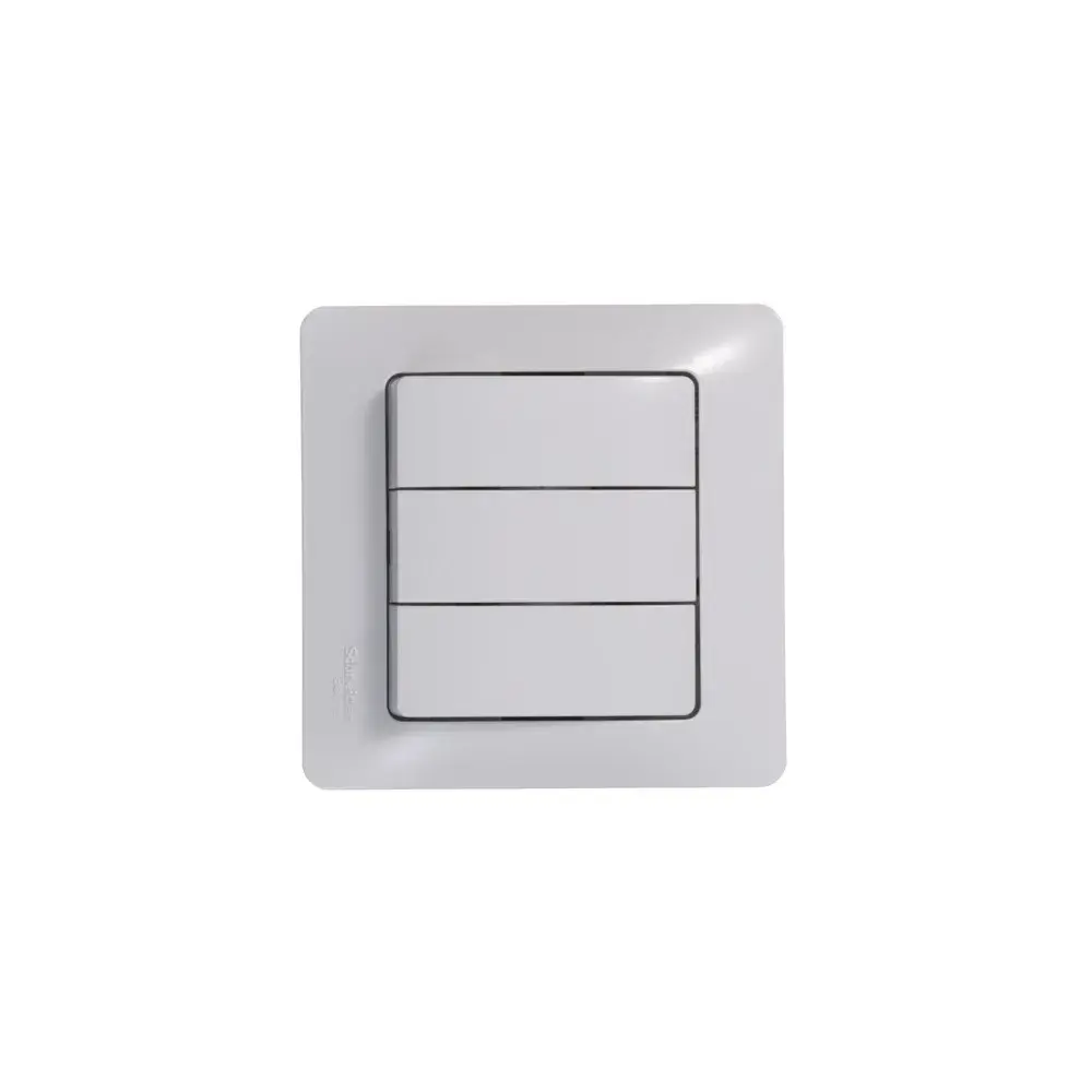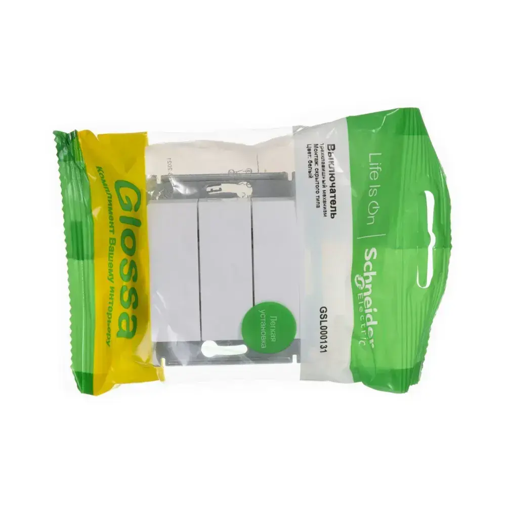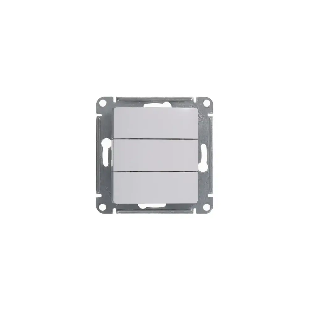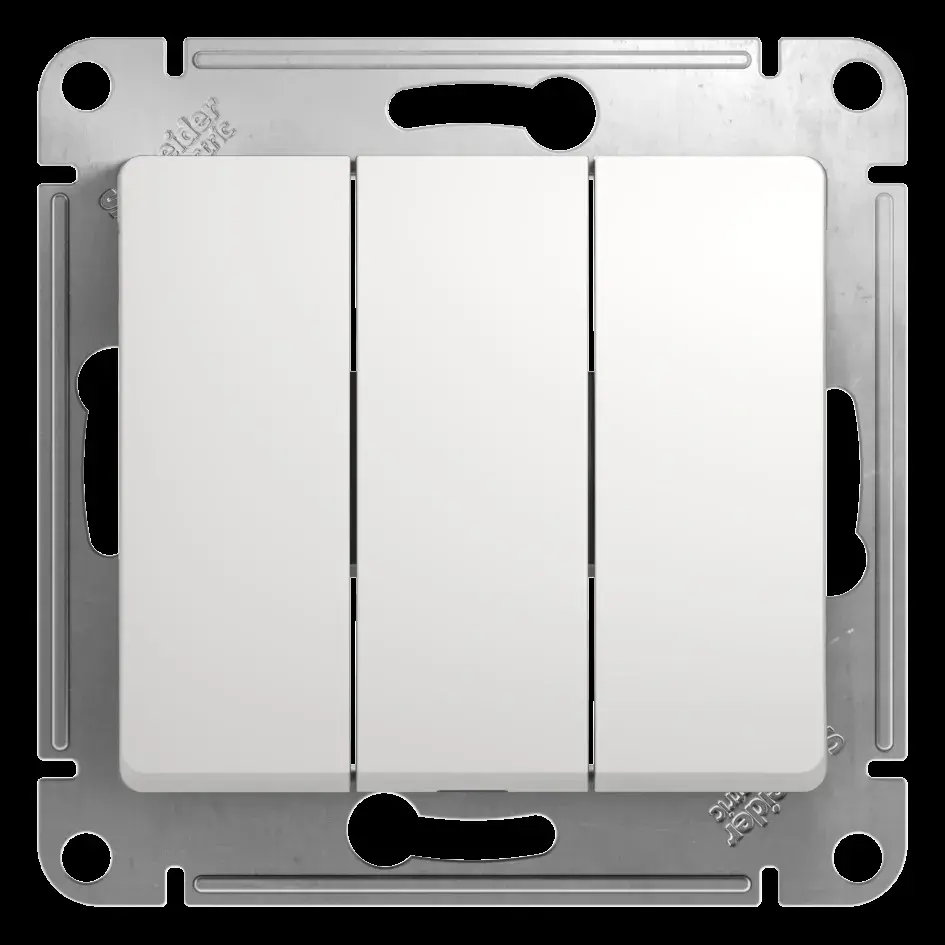 Механизм Systeme Electric (ранее Schneider Electric) серии Glossa (цвет белый) выключателя 3-клавишного подходит для сетей 250 В, на ток 10 А. - Трёхклавишный выключатель позволяет управлять тремя источниками света из одной точки. - Выполнен из материала PС+ASA, стойкого к УФ-излучению и появлению царапин. - Эргономичные клеммы расположены в два ряда: сверху и снизу.