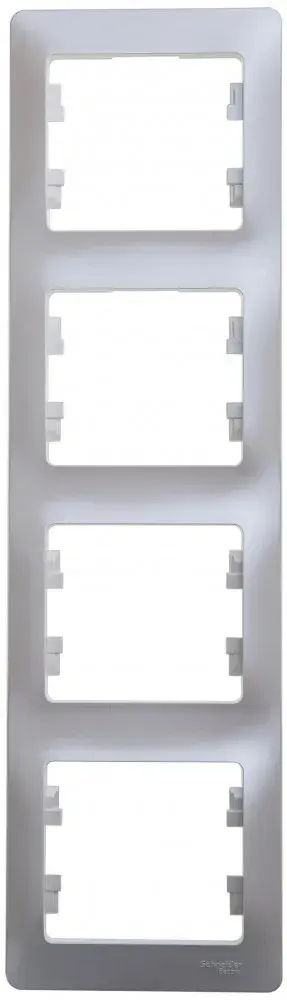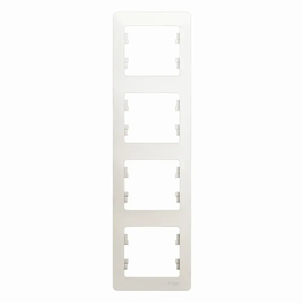 Рамка Systeme Electric (ранее Schneider Electric) серии Glossa (цвет перламутр) четырёхместная. - Устанавливается в вертикальном положении. - Выполнена из материала PС+ASA, стойкого к УФ-излучению и появлению царапин. - Позволяет гармонично вписать электроустановочное изделие в интерьер помещения.