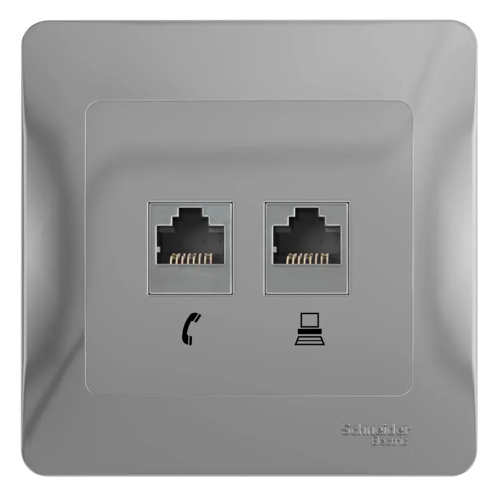Механизм Systeme Electric (ранее Schneider Electric) серии Glossa (цвет алюминий) двойной розетки разъёмами RJ45 категория 5е и RJ11 предназначен для удобного и быстрого подключения вашего компьютера и телефона к соответствующим сетям. - Выполнен из материала PС+ASA, стойкого к УФ-излучению и появлению царапин.