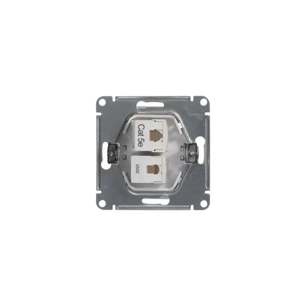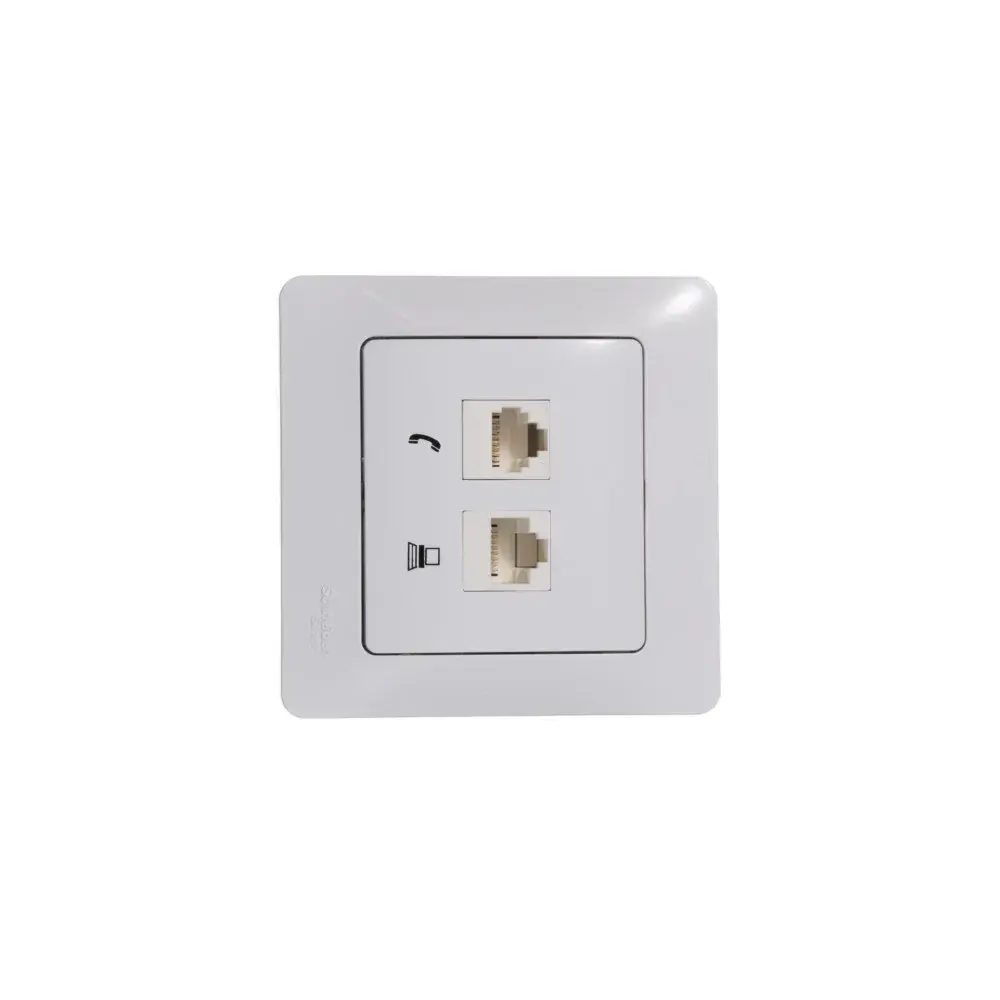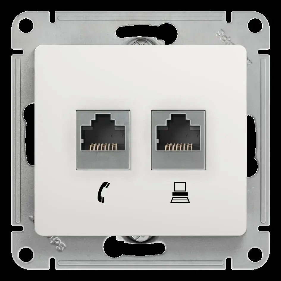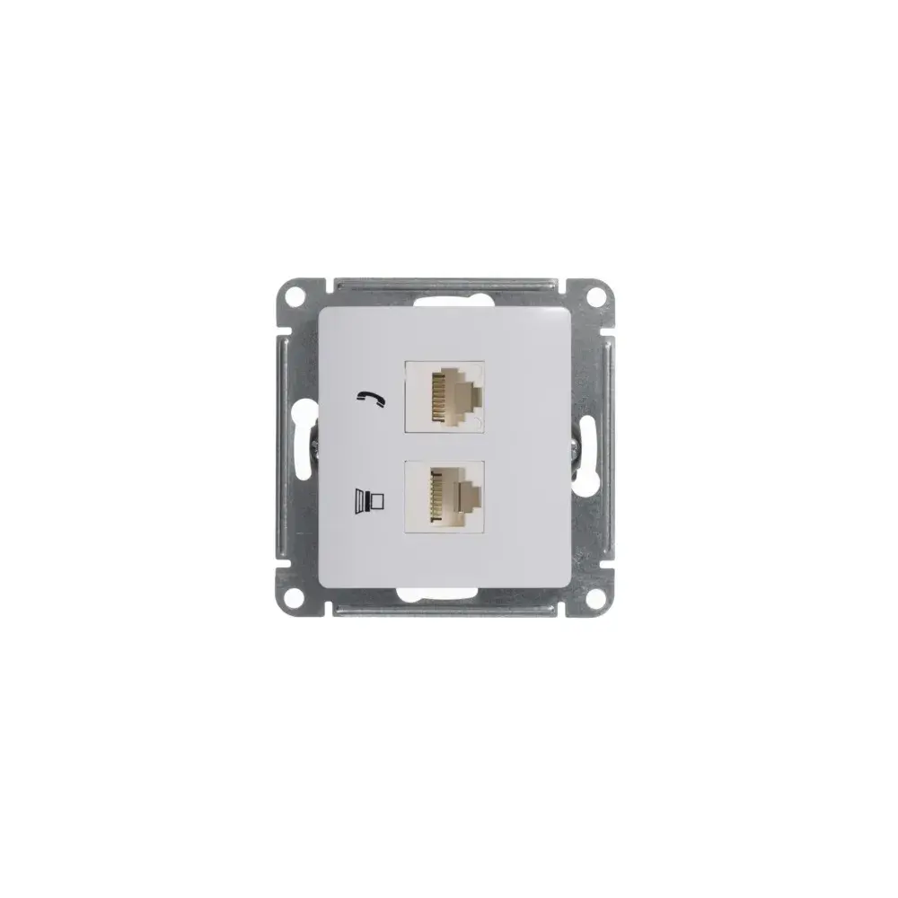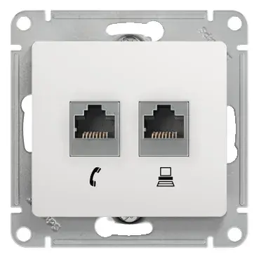 Механизм Systeme Electric (ранее Schneider Electric) серии Glossa (цвет белый) двойной розетки разъёмами RJ45 категория 5е и RJ11 предназначен для удобного и быстрого подключения вашего компьютера и телефона к соответствующим сетям. - Выполнен из материала PС+ASA, стойкого к УФ-излучению и появлению царапин.