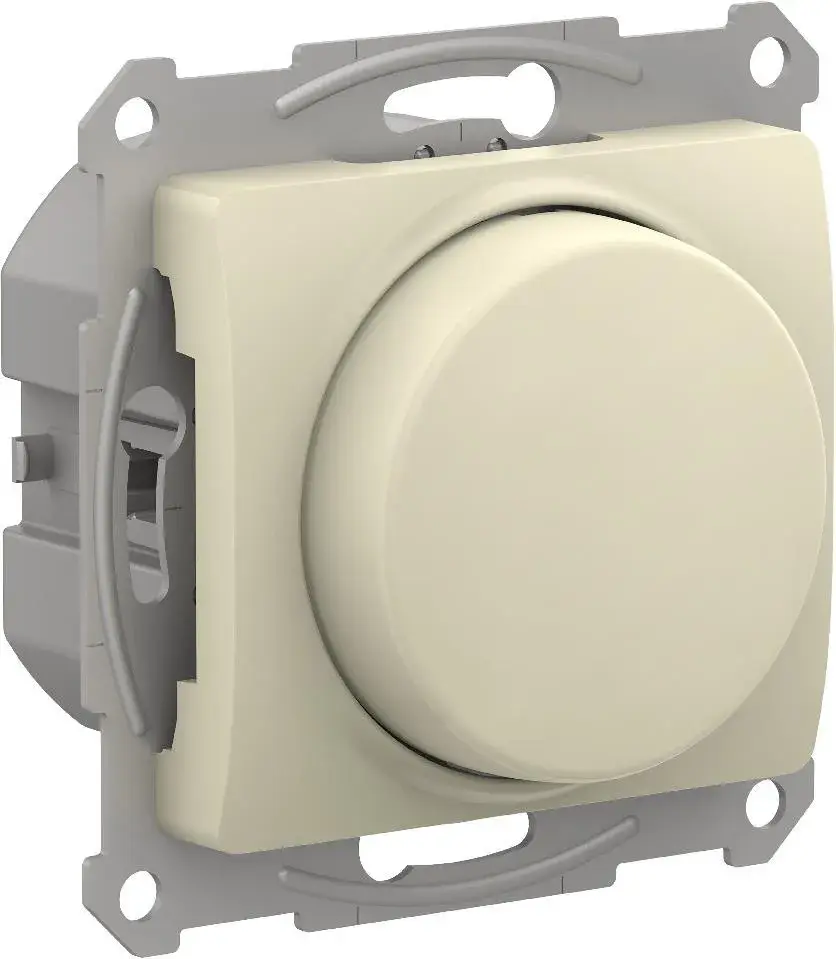 Механизм светорегулятора Systeme Electric (ранее Schneider Electric) серии Glossa (цвет бежевый) поворотно-нажимной для нагрузки мощностью до 400 Вт, подходит для LED ламп. - Светорегулятор позволяет установить в помещении комфортный уровень освещения. - При подключении второго переключателя диммер может использоваться как проходной переключатель. - Может использоваться как выключатель или переключатель. - Выполнен из материала, стойкого к УФ-излучению и появлению царапин.