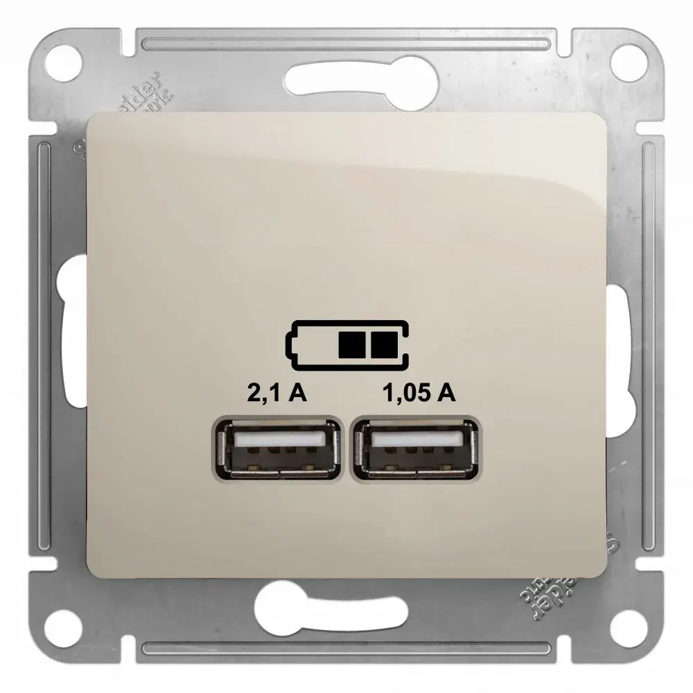 Механизм Systeme Electric (ранее Schneider Electric) серии Glossa (цвет молочный) розетки с двумя разъёмами USB с выходными напряжением 5 В постоянного тока и выходами с номинальным током по 2,1 А. - Предназначен для зарядки мобильных устройств: телефоны, планшетные компьютеры, mp3/mp4 плееры. - Может заряжать одно или два устройства одновременно. - Выполнен из материала PС+ASA, стойкого к УФ-излучению и появлению царапин.