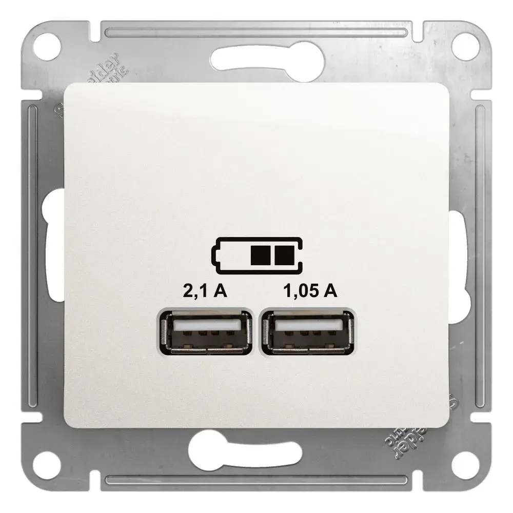 Механизм Systeme Electric (ранее Schneider Electric) серии Glossa (цвет перламутр) розетки с двумя разъёмами USB с выходными напряжением 5 В постоянного тока и выходами с номинальным током по 2,1 А. - Предназначен для зарядки мобильных устройств: телефоны, планшетные компьютеры, mp3/mp4 плееры. - Может заряжать одно или два устройства одновременно. - Выполнен из материала PС+ASA, стойкого к УФ-излучению и появлению царапин.