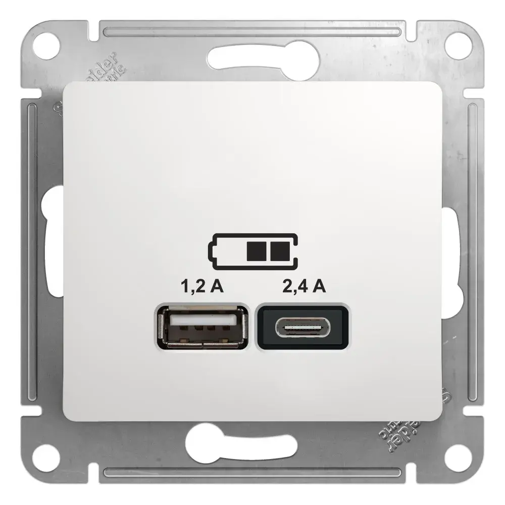 Розетка Systeme Electric (ранее Schneider Electric) серии Glossa (цвет белый) двойная USB с разъемами типа A+C. - Выполнена из материала PС+ASA, стойкого к УФ-излучению и появлению царапин. - Самая современная USB-зарядка с двумя разъемами позволяет заряжать как стандартные мобильные устройства через разъем типа А, так и новейшии устройства, в том числе ноутбуки, с разъемом типа С.