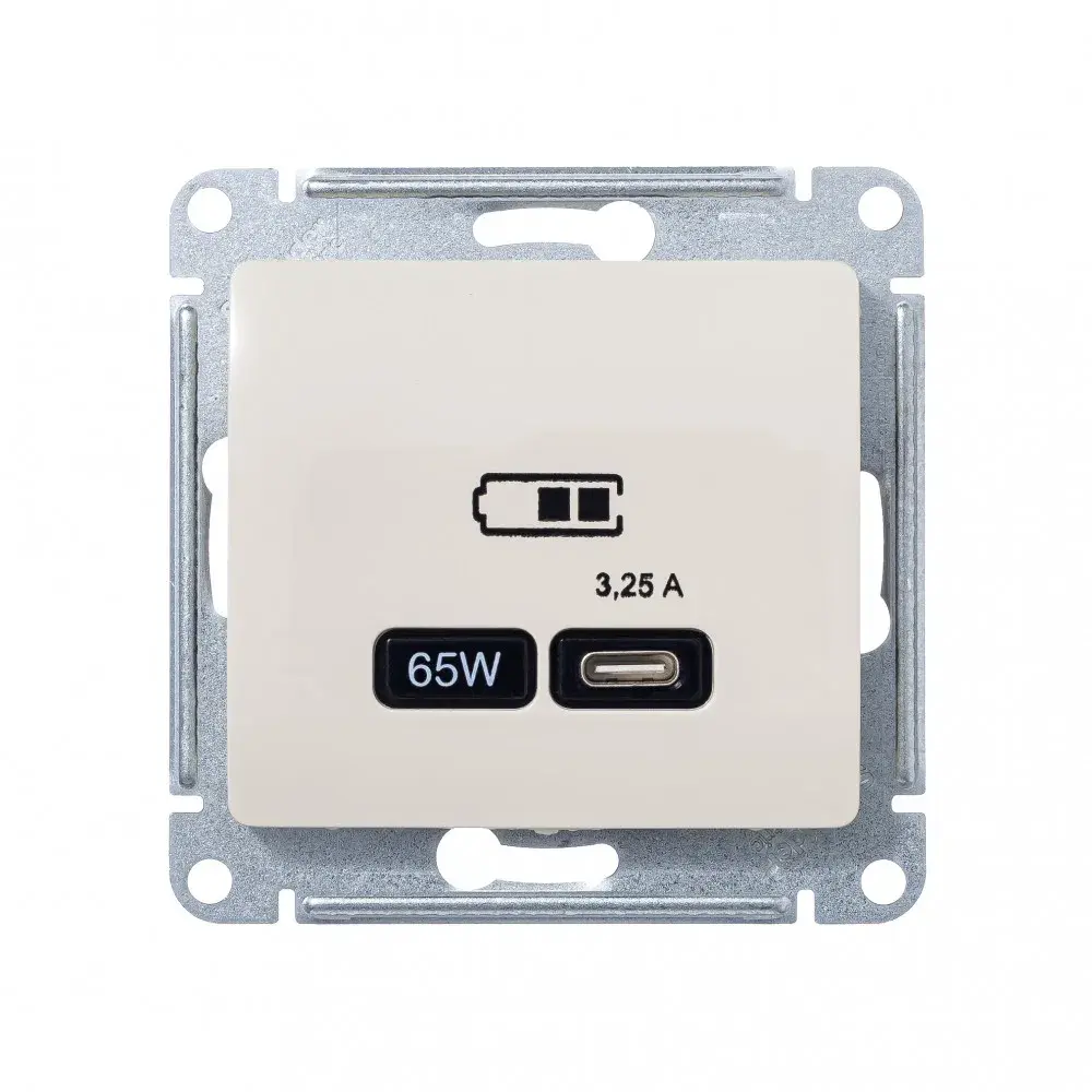 Розетка Systeme Electric (ранее Schneider Electric) серии Glossa (цвет бежевый) USB с разъемом типа C высокоскоростная. - Самая современная USB-зарядка позволяет заряжать ноутбук, а также смартфоны последнего поколения, которые поддерживают функцию быстрой зарядки. - Мощность: тип-С - 65Вт. - Поддерживает современные протоколы быстрой зарядки QC, PD, последних версий. - Лицевые детали из качественного ABS-пластика, устойчивого к царапинам и УФ-излучению.