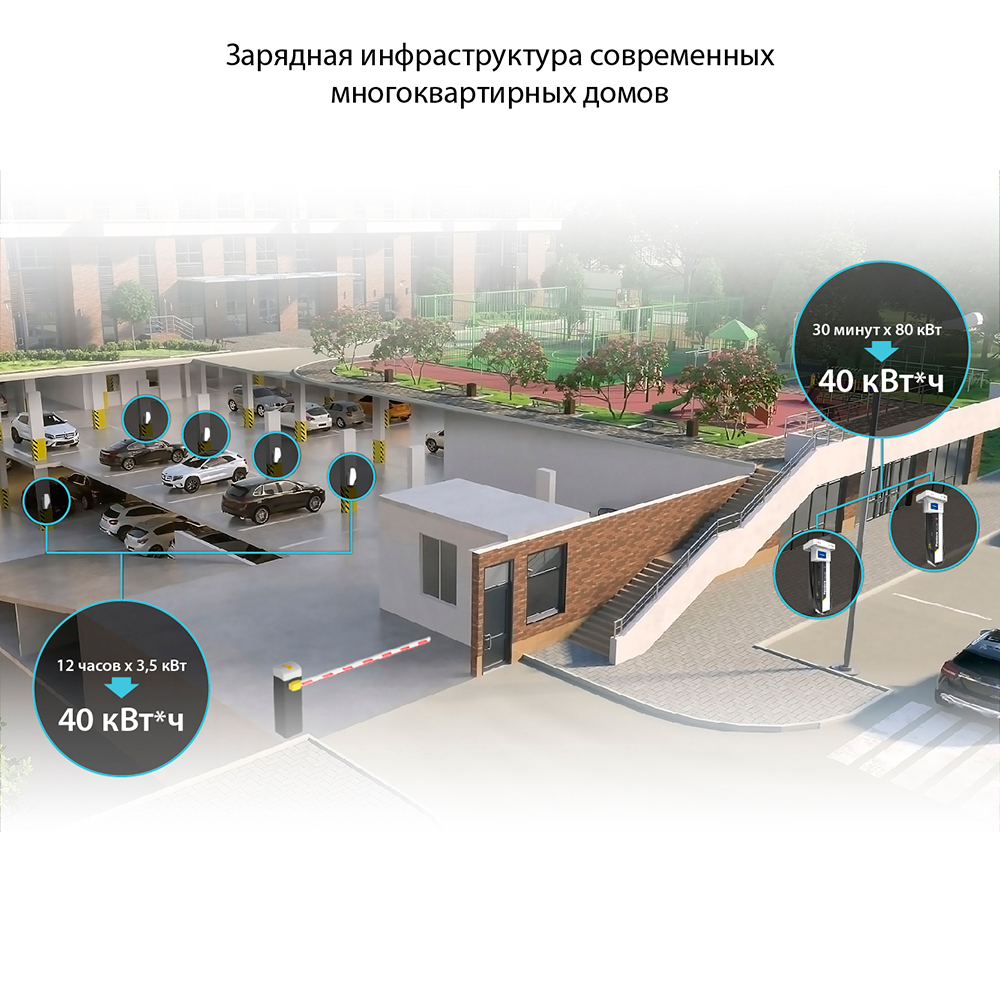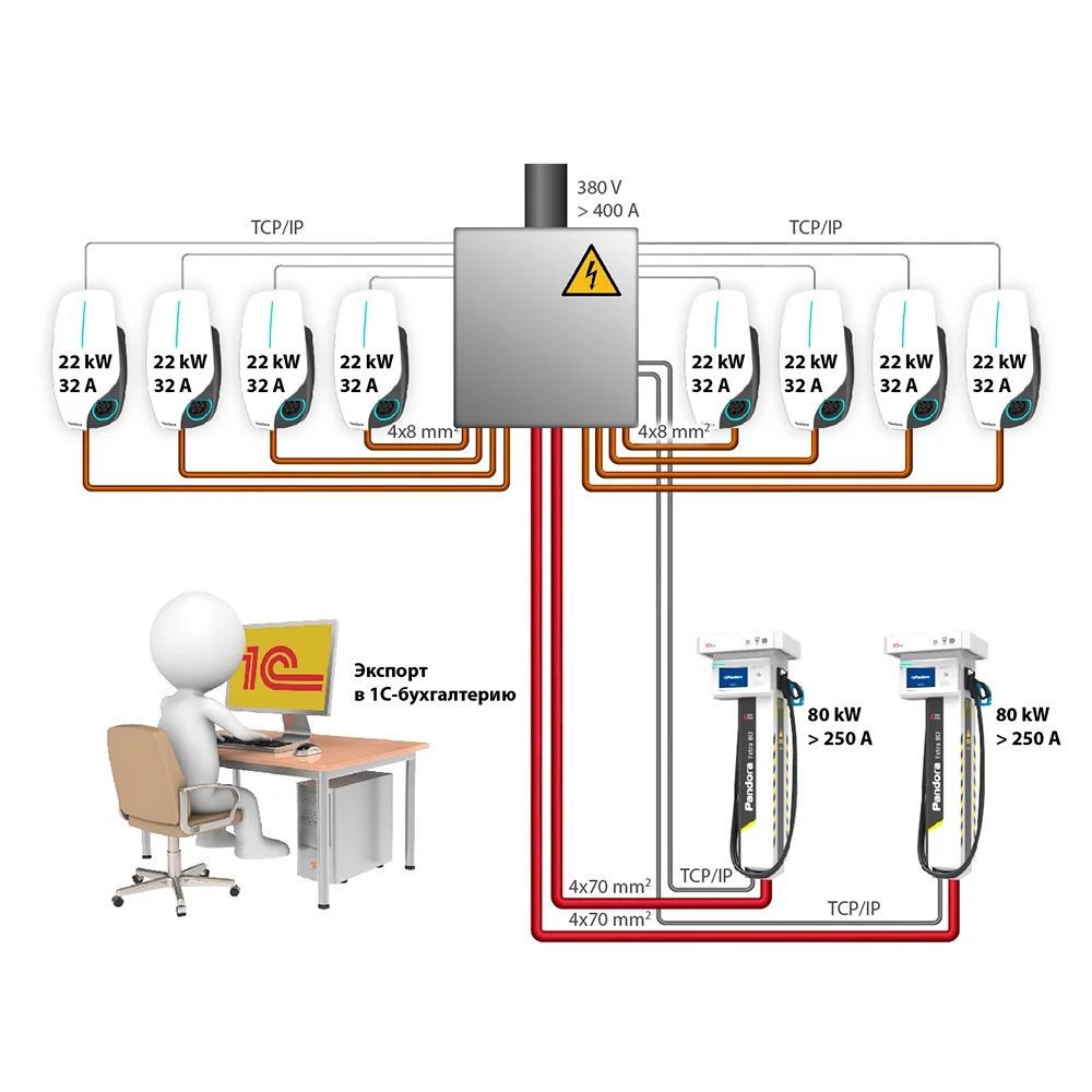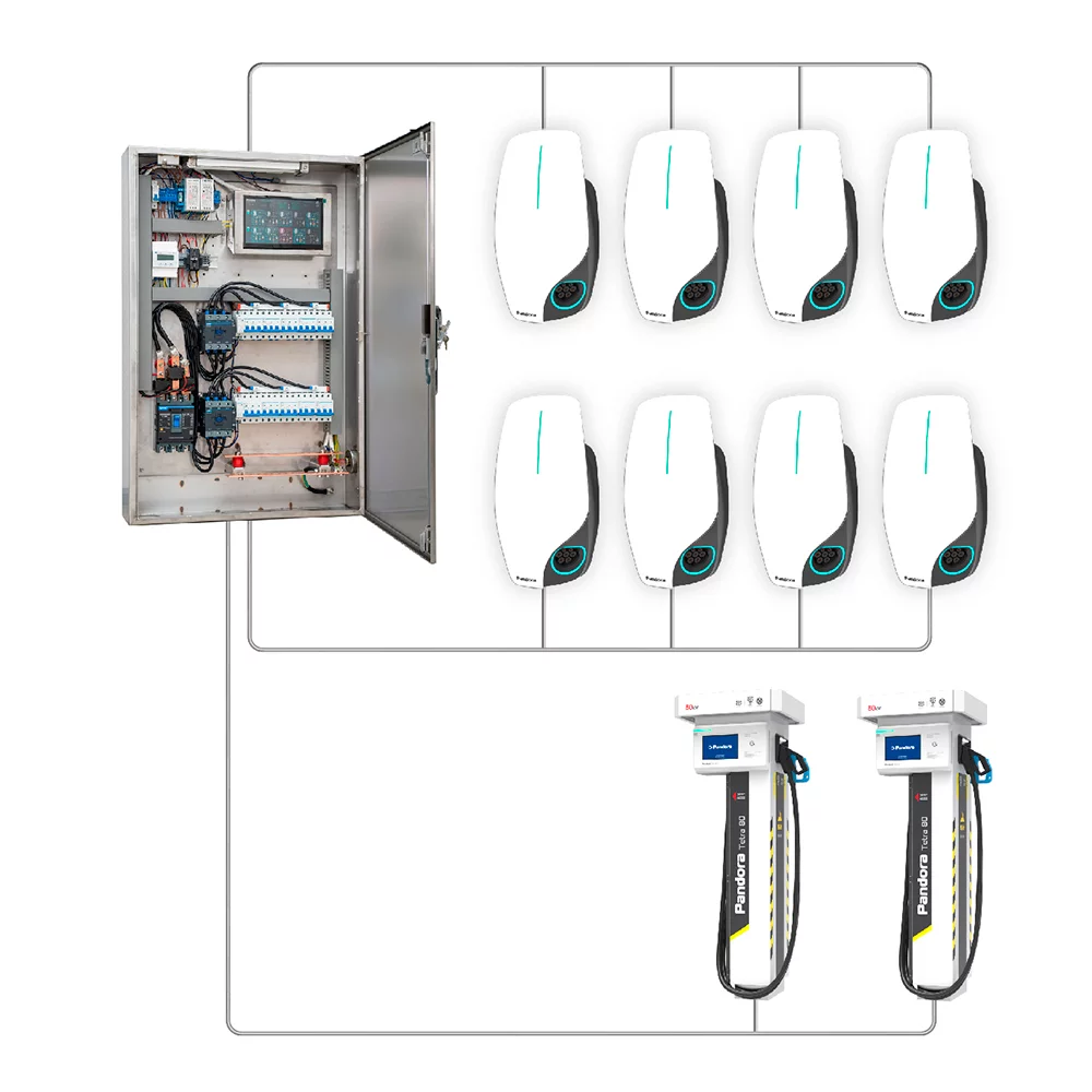 Комплект позволяет оснастить 8 парковочных мест универсальными зарядными станциями переменного тока PandoraWall-E , а также установить две быстрых зарядных станции PandoraTetra 80/22, каждая из которых может заряжать одновременно 2 электромобиля (заряд по DC + заряд через AC розетка Type 2), и таким образом добавить еще 4 парковочных места с возможностью заряда электромобилей, итого комплект позволяет оснастить 12 мест.