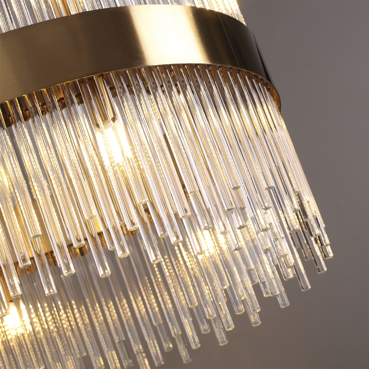 Стеклянный декор серии Focco в виде тонких стеклянных трубочек выглядит очень эффектно, особенно в сочетании с ободом бронзового цвета. Высококачественное стекло не уступает хрусталю по своим качествам: свет будет мерцать и переливаться, усиливая великолепное рассеивание.