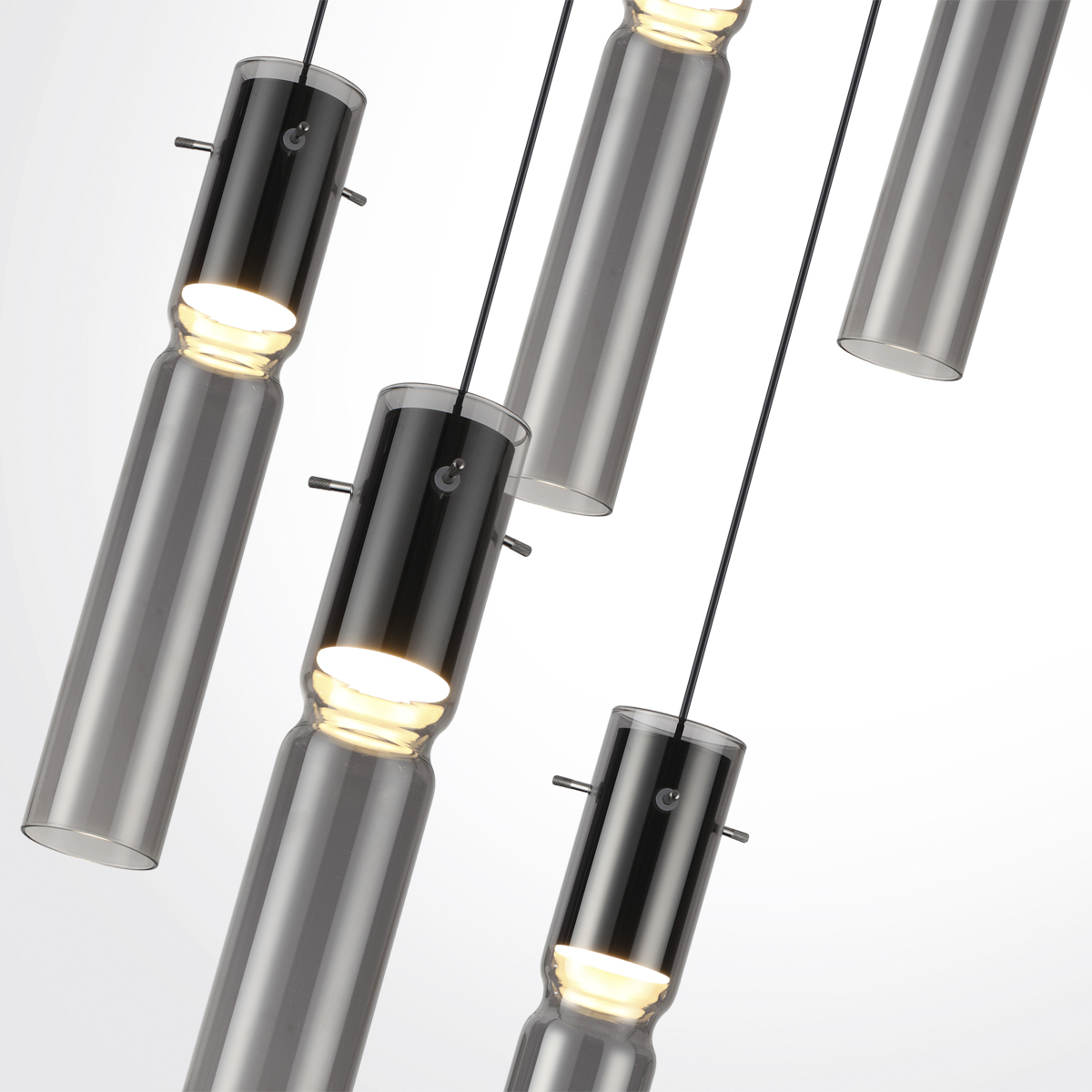 Линия Scrow — это вытянутые узкие подвесы из стекла популярных универсальных цветов smoky (дымчатый), amber (янтарный) и прозрачный. В линии есть каскадные люстры на базе подвесов. Трубчатые формы — это актуальный тренд в декоративном освещении, поэтому люстровые модели прекрасно будут смотреться в современных интерьерах. Цветовая температура LED- 3000К .