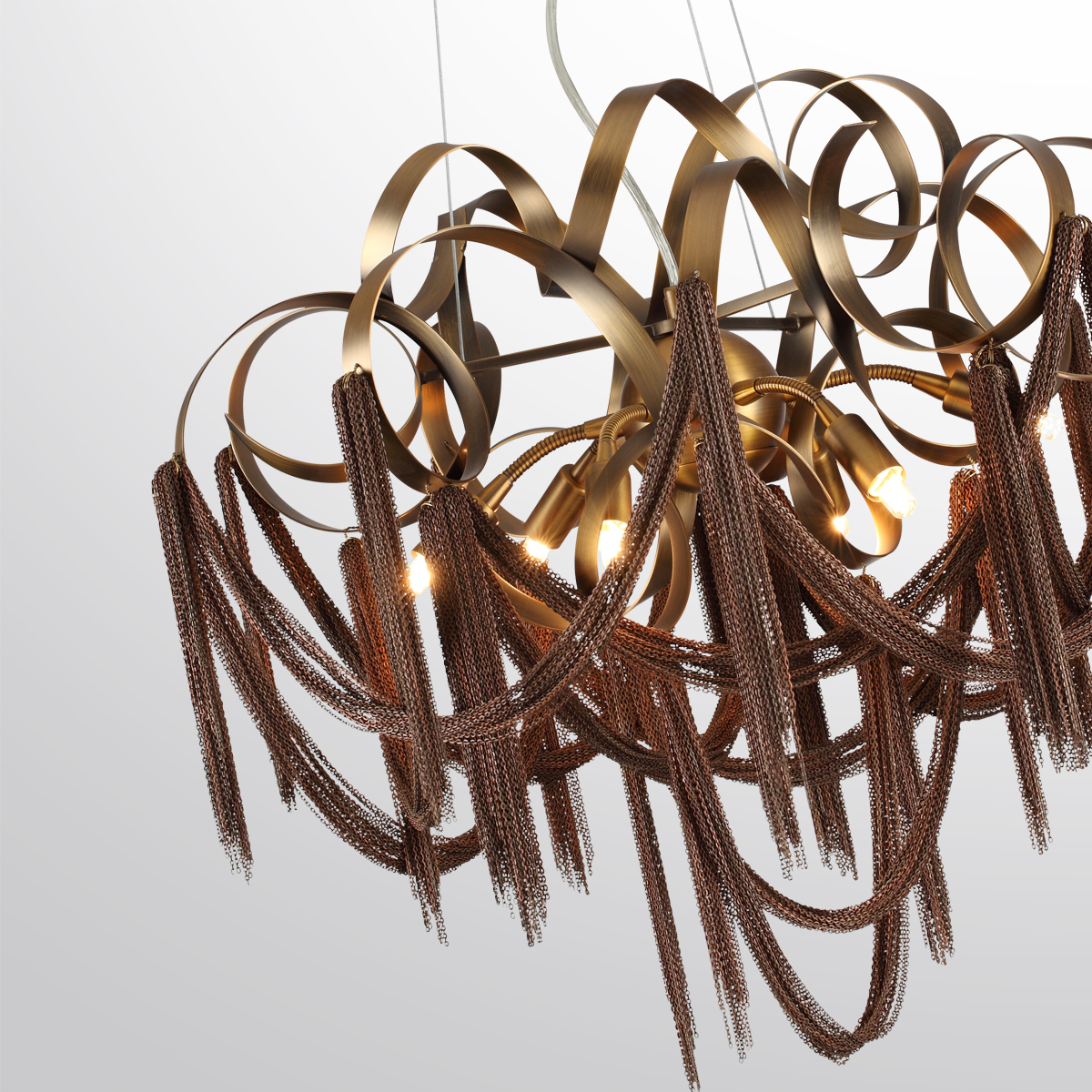 Коллекция Chainy — это люстровая линия в неоклассическом стиле коричневого цвета. Основу дизайна люстр составляют множество цепочек глубокого шоколадного оттенка, которые образуют элегантные провисы и создают красивую единую композицию. Красивое сочетание металлического каркаса в гальваническом брашированном исполнении коричневого цвета и цепочек позволяют использовать светильники как световые акценты в неоклассических интерьерах теплых светлых оттенков, которые сейчас невероятно актуальны. В линии 2 круглых и 1 горизонтальная люстра и бра.Светильники станут великолепным акцентом в неоклассических интерьерах.