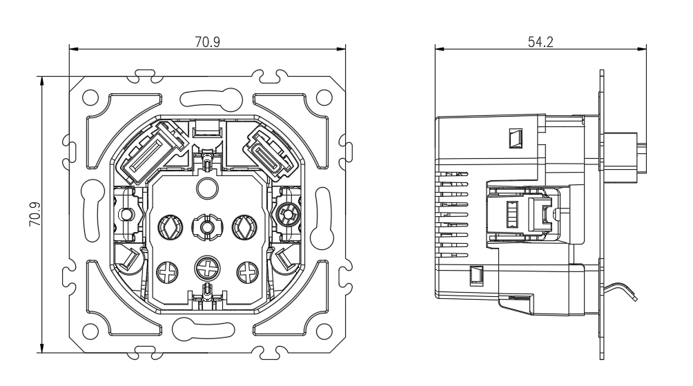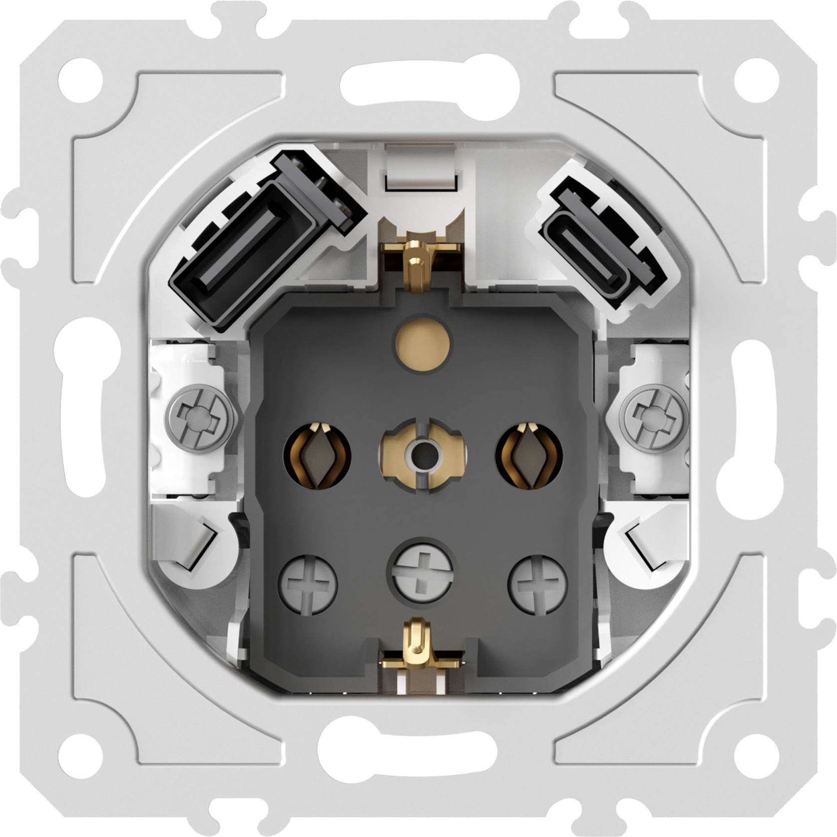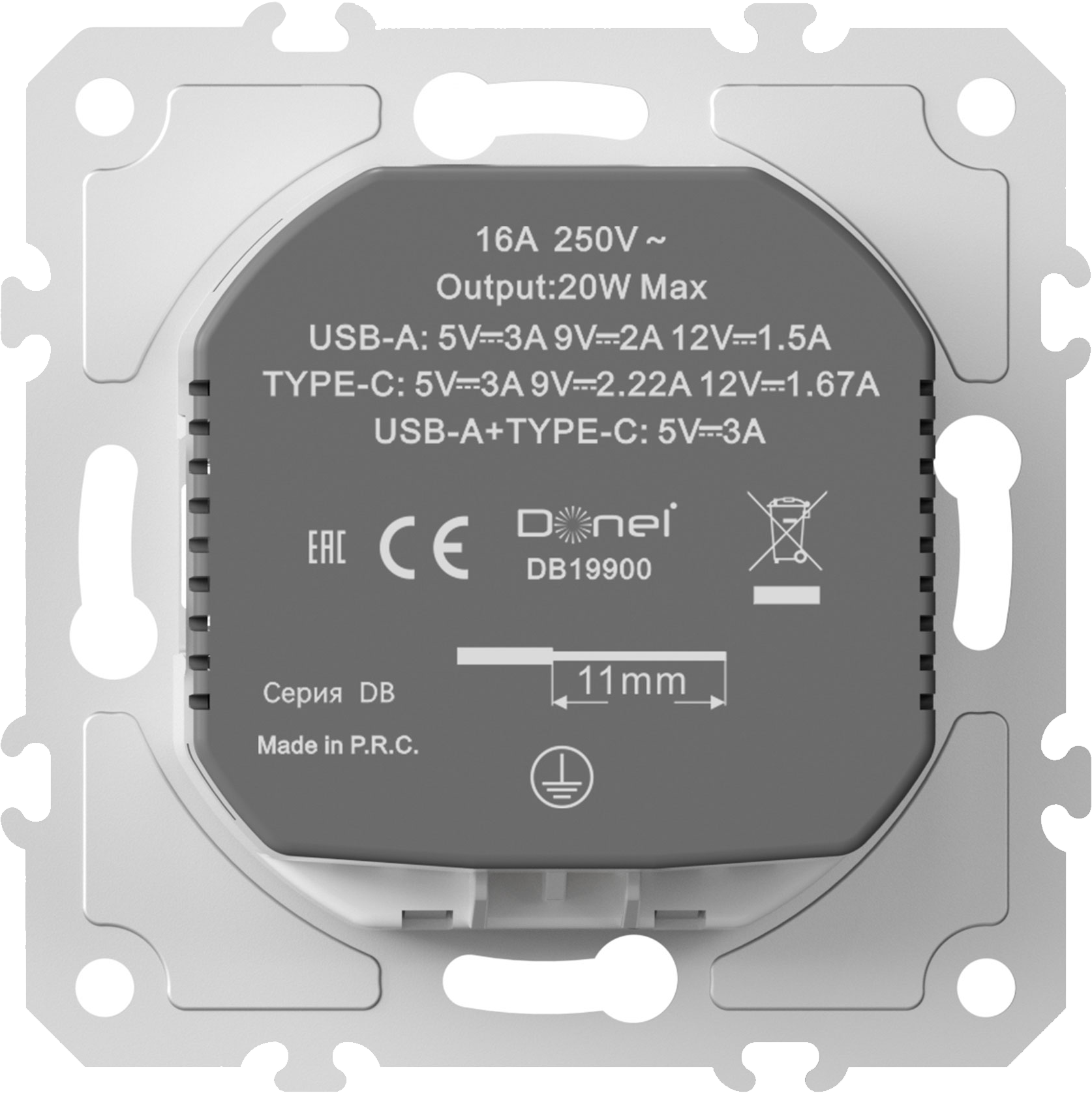 Donel механизм розетки Schuko 16А 250 В~ с зарядным устройством USB A+C, 5V/3A, мощность 20W, на винтах, предназначен для монтажных коробок глубиной не менее 60 мм., серия DB