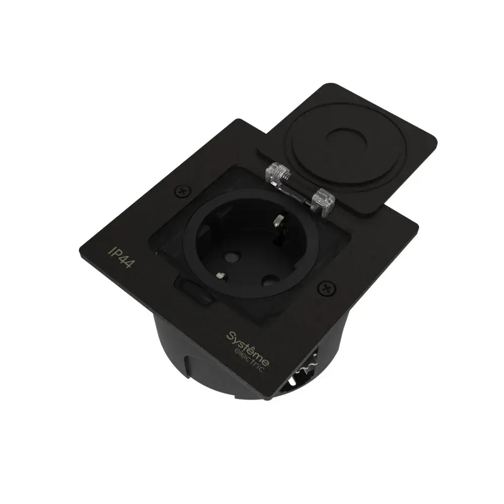 MultiDesk Лючок с розеткой 2К+З, 16А/250В, IP44 с монтажной коробкой для стены, фальшпола, стола Чёр