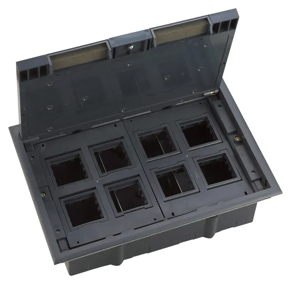 MultiDesk Лючок предназначен для установки в фальшпол толщиной 5…50 мм. Монтажная коробка идёт в комплекте. В лючок можно установить до 16 модулей (8 постов) ЭУИ стандарта 45 мм, например, модульные ЭУИ W45. Лючок выполнен из пластика и имеет степень пылевлагозащиты IP40 при закрытой крышке, механическая стойкость - IK10. Сторону открывания крышки лючка можно менять. Имеется регулировка лючка по высоте - от 74 до 105 мм. Крышка лючка усилена металлической пластиной. Поставляется без ЭУИ.