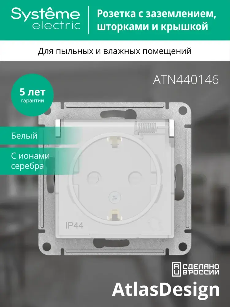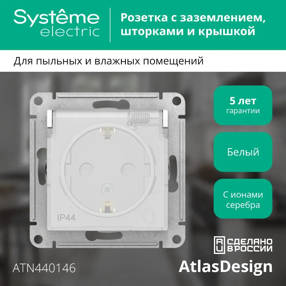 Механизм Systeme Electric (ранее Schneider Electric) серии AtlasDesign Aqua (цвет белый) розетки одинарной с заземлением, шторками и крышкой подходит для сетей 250 В, на ток 16 А. - Изделие со степенью защиты IP44 обеспечит безопасность использования в ванной и на кухне. - Несмотря на внешнее сходство, конструкция рамок серии AtlasDesign Aqua отличается от конструкции рамок AtlasDesign. Механизмы и рамки со степенью защиты IP20 несовместимы с механизмами и рамками со степенью защиты IP44.